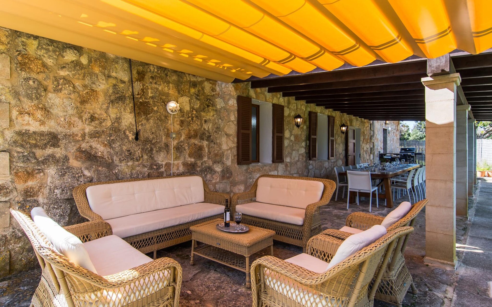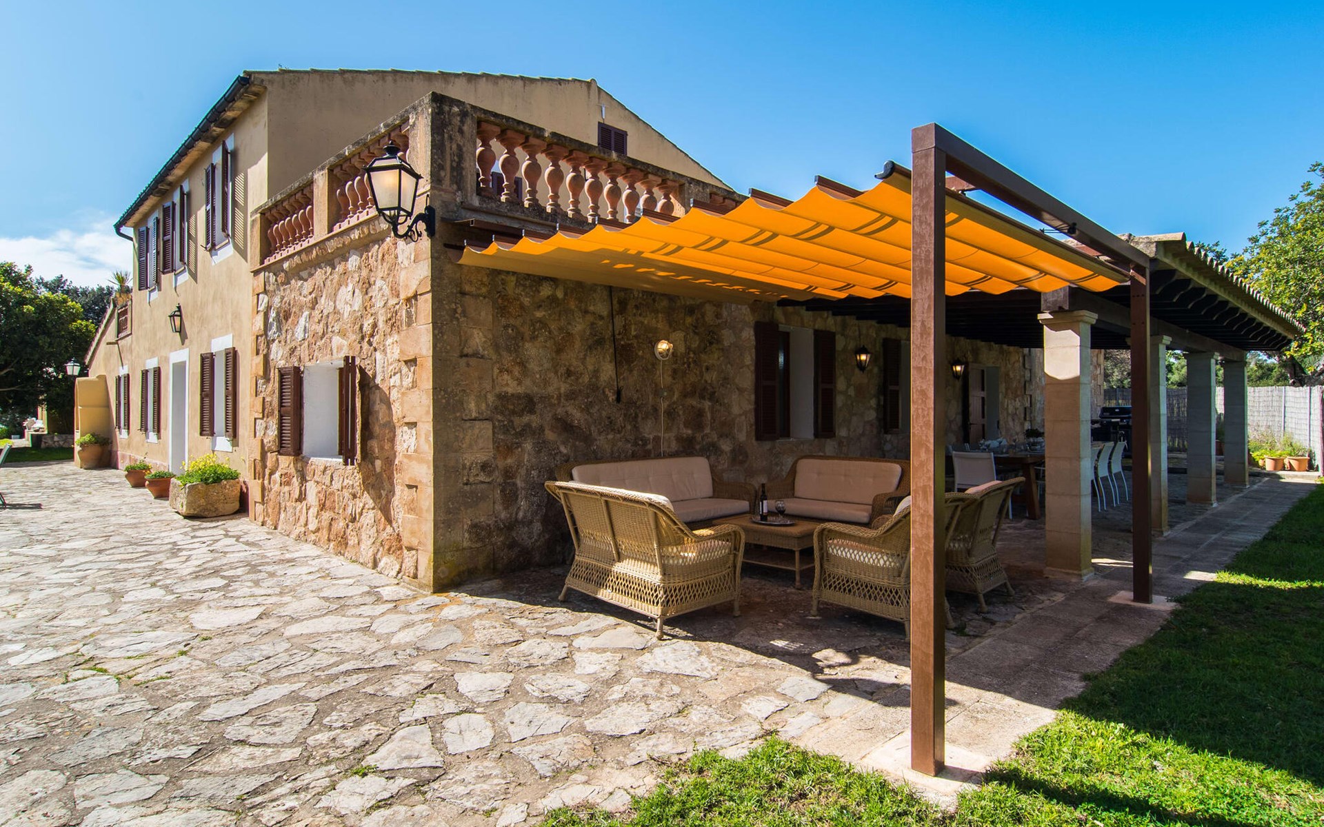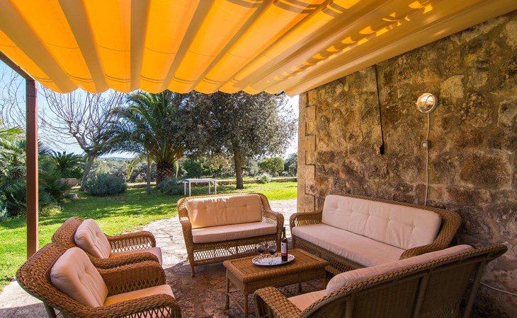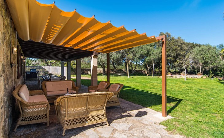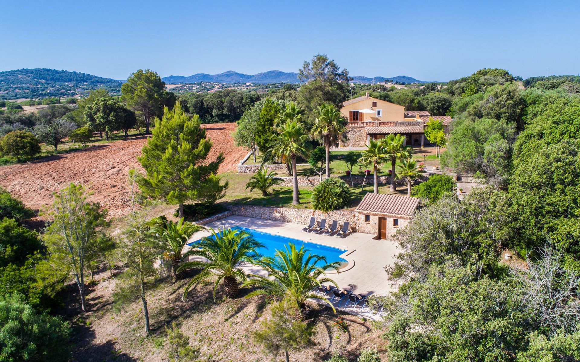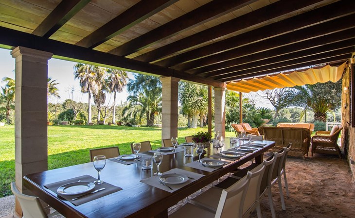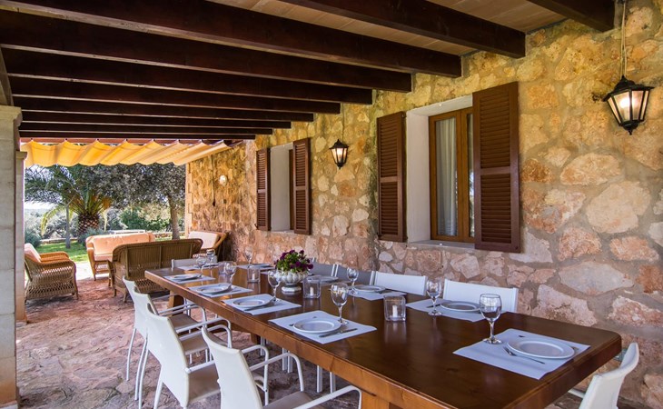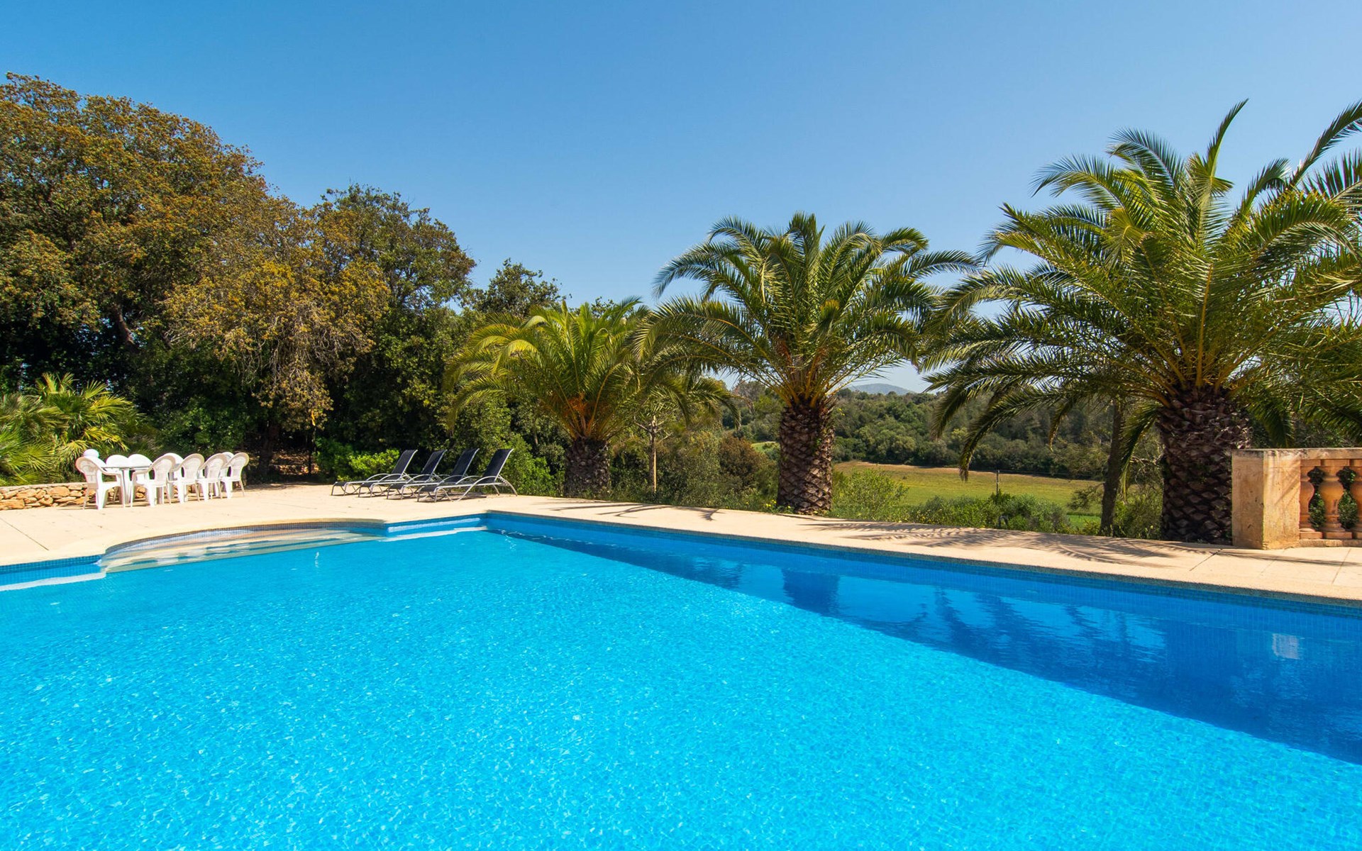 Wer sich für die Villa „Ses Cases de Son Isidros“ entscheidet, kann sich bei seinem Aufenthalt auf Mallorca guten Gewissens wie ein Großgrundbesitzer fühlen: das weitläufige Anwesen, das an einen wildromantischen Park erinnert und auf dem Palmen und andere mediterrane Pflanzen wachsen Bäume spenden Schatten, umfasst eine Fläche von knapp 100.000 m². Hier können Sie nach Lust und Laune spazieren gehen, sich an den intensiv leuchtenden Blumen erfreuen, mit den Kleinen Verstecken spielen, in einer der gemütlichen Sitzecken einen Nachmittagstee genießen oder einfach einen erfrischenden Sprung ins kühle Nass wagen Ihr stattlicher Pool. Anschließend können Sie am Steinrand Ihre Beine im Wasser baumeln lassen und sich dabei in eine unterhaltsame Urlaubslektüre vertiefen. Von der Poolterrasse, auf der mehrere Liegestühle zu einem Nickerchen in der Sonne einladen, führen Steinstufen hinauf zum Anwesen, an dessen Bruchsteinfassade sich eine überdachte Terrasse schmiegt. Vielleicht möchten Sie hier am späten Nachmittag den Grill aufbauen, um den Abend mit kulinarischen Köstlichkeiten der Insel ausklingen zu lassen. Eine große Dachterrasse und ein Balkon sind zudem ideale Orte, um sich die milde Inselluft, die angenehm nach Meer duftet, um die Nase wehen zu lassen.