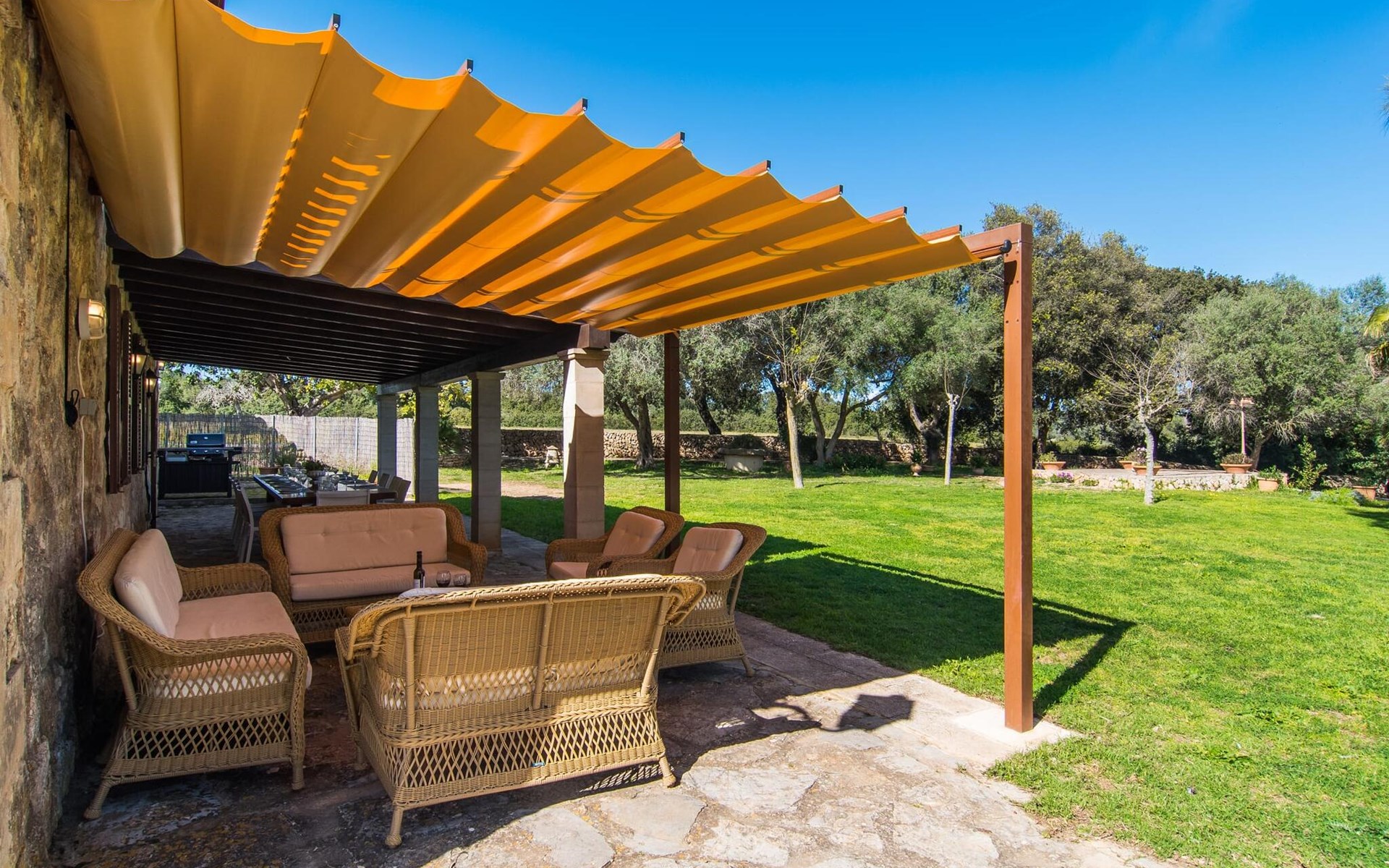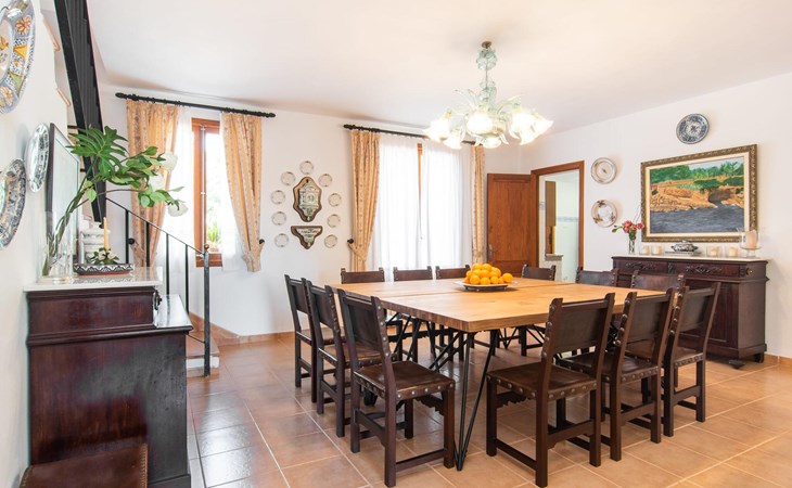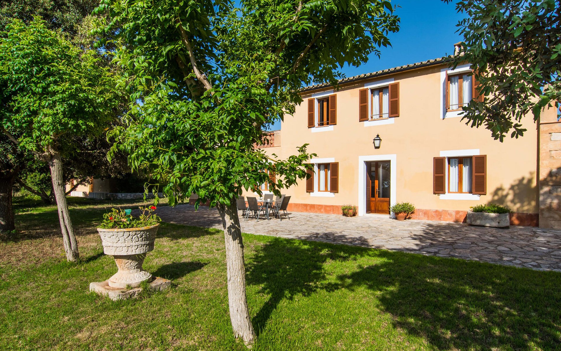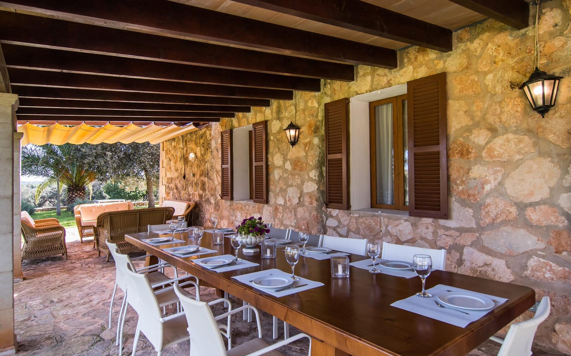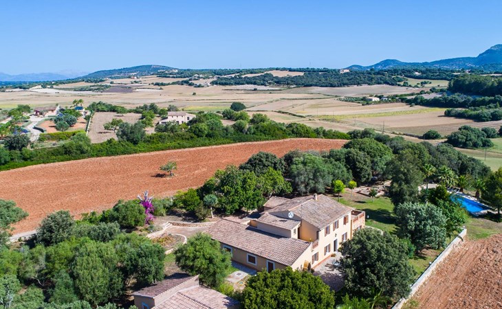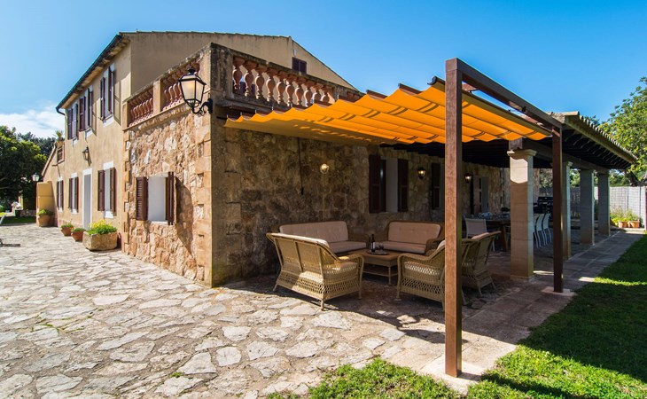 Wer sich für die Villa „Ses Cases de Son Isidros“ entscheidet, kann sich bei seinem Aufenthalt auf Mallorca guten Gewissens wie ein Großgrundbesitzer fühlen: das weitläufige Anwesen, das an einen wildromantischen Park erinnert und auf dem Palmen und andere mediterrane Pflanzen wachsen Bäume spenden Schatten, umfasst eine Fläche von knapp 100.000 m². Hier können Sie nach Lust und Laune spazieren gehen, sich an den intensiv leuchtenden Blumen erfreuen, mit den Kleinen Verstecken spielen, in einer der gemütlichen Sitzecken einen Nachmittagstee genießen oder einfach einen erfrischenden Sprung ins kühle Nass wagen Ihr stattlicher Pool. Anschließend können Sie am Steinrand Ihre Beine im Wasser baumeln lassen und sich dabei in eine unterhaltsame Urlaubslektüre vertiefen. Von der Poolterrasse, auf der mehrere Liegestühle zu einem Nickerchen in der Sonne einladen, führen Steinstufen hinauf zum Anwesen, an dessen Bruchsteinfassade sich eine überdachte Terrasse schmiegt. Vielleicht möchten Sie hier am späten Nachmittag den Grill aufbauen, um den Abend mit kulinarischen Köstlichkeiten der Insel ausklingen zu lassen. Eine große Dachterrasse und ein Balkon sind zudem ideale Orte, um sich die milde Inselluft, die angenehm nach Meer duftet, um die Nase wehen zu lassen.