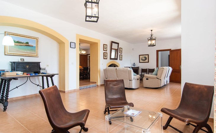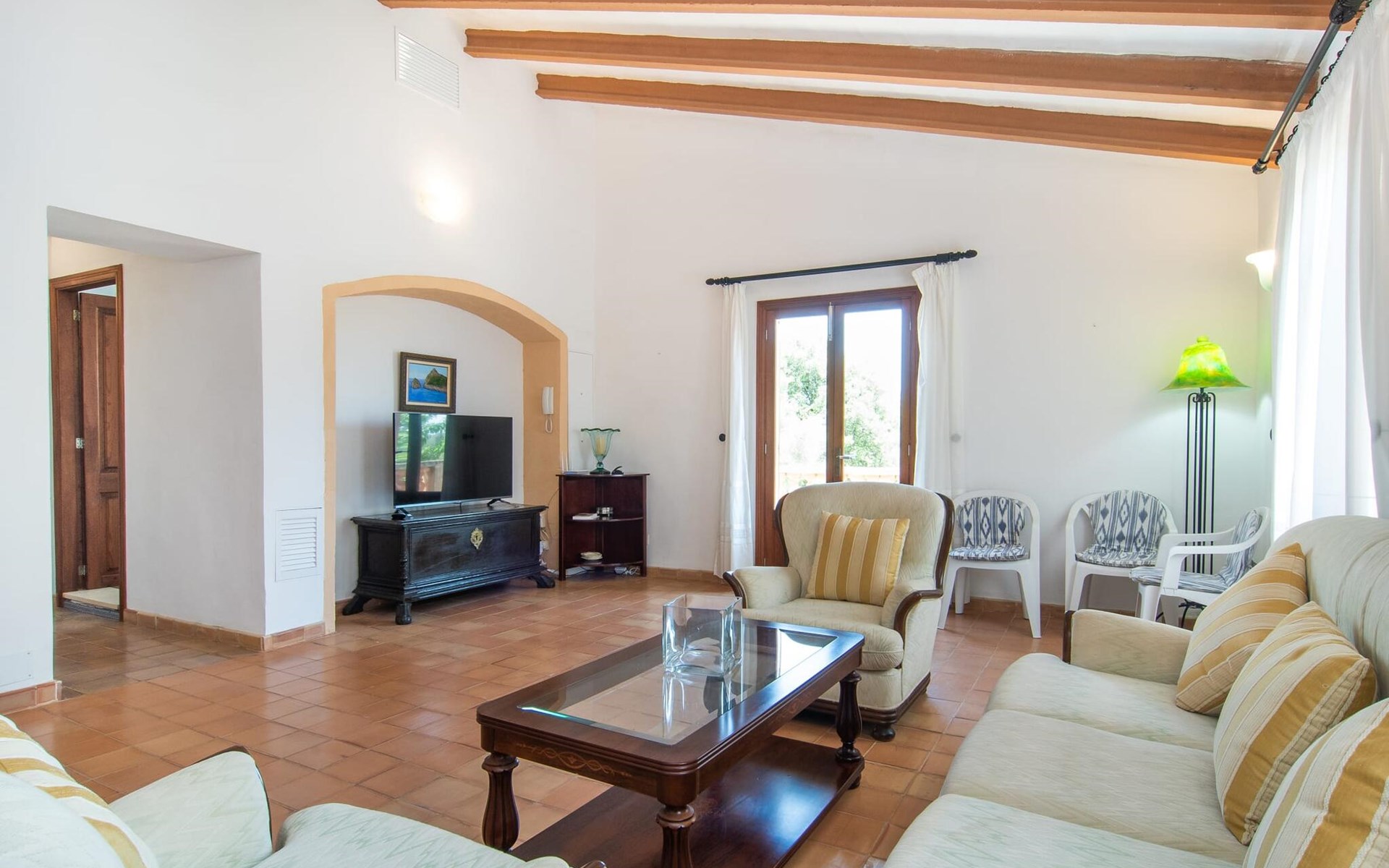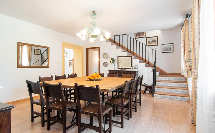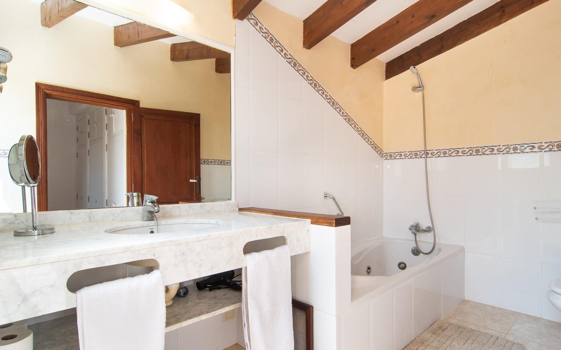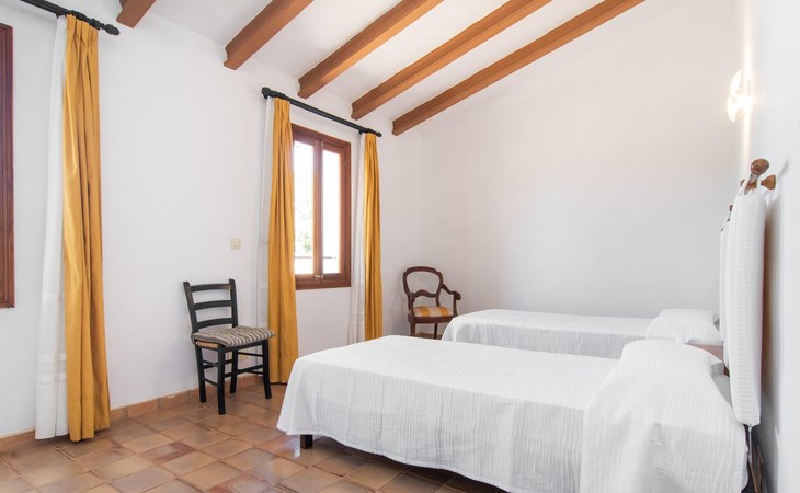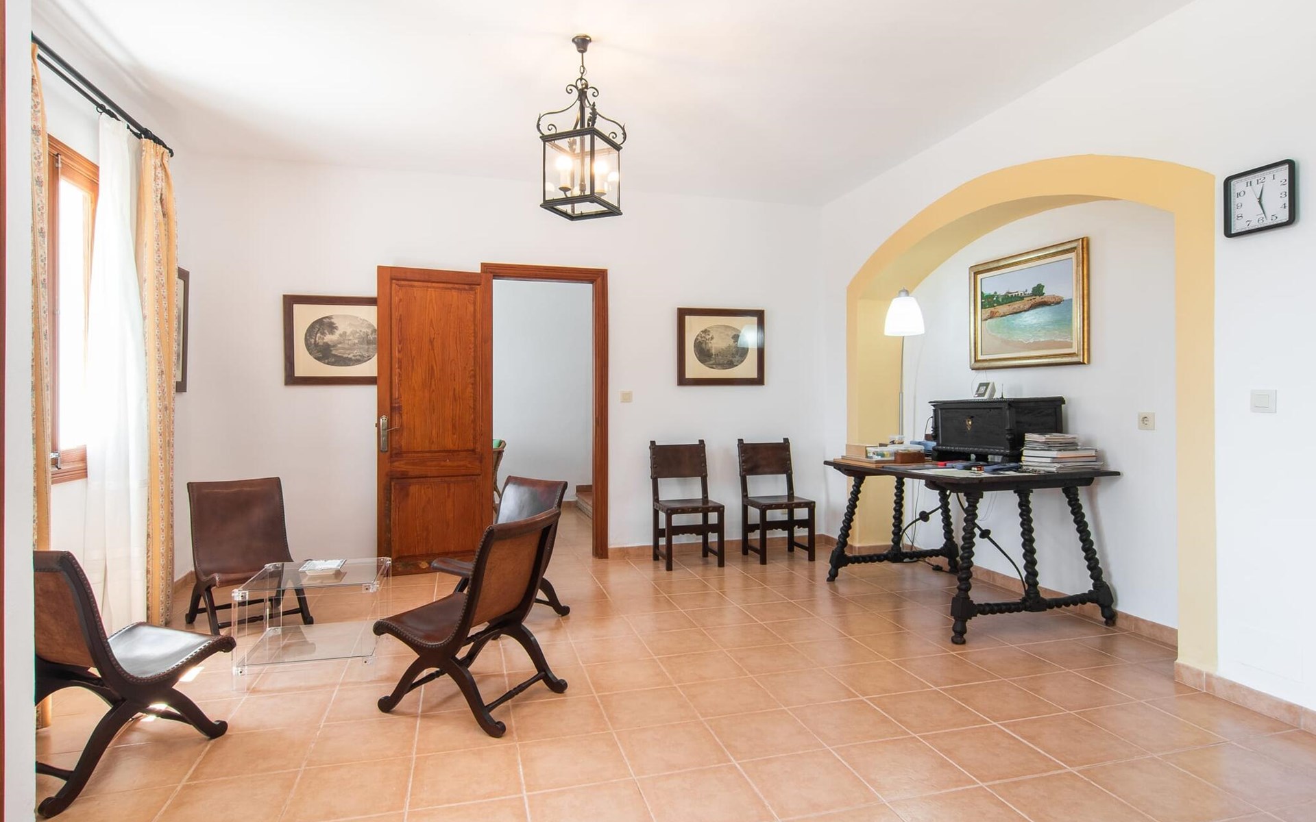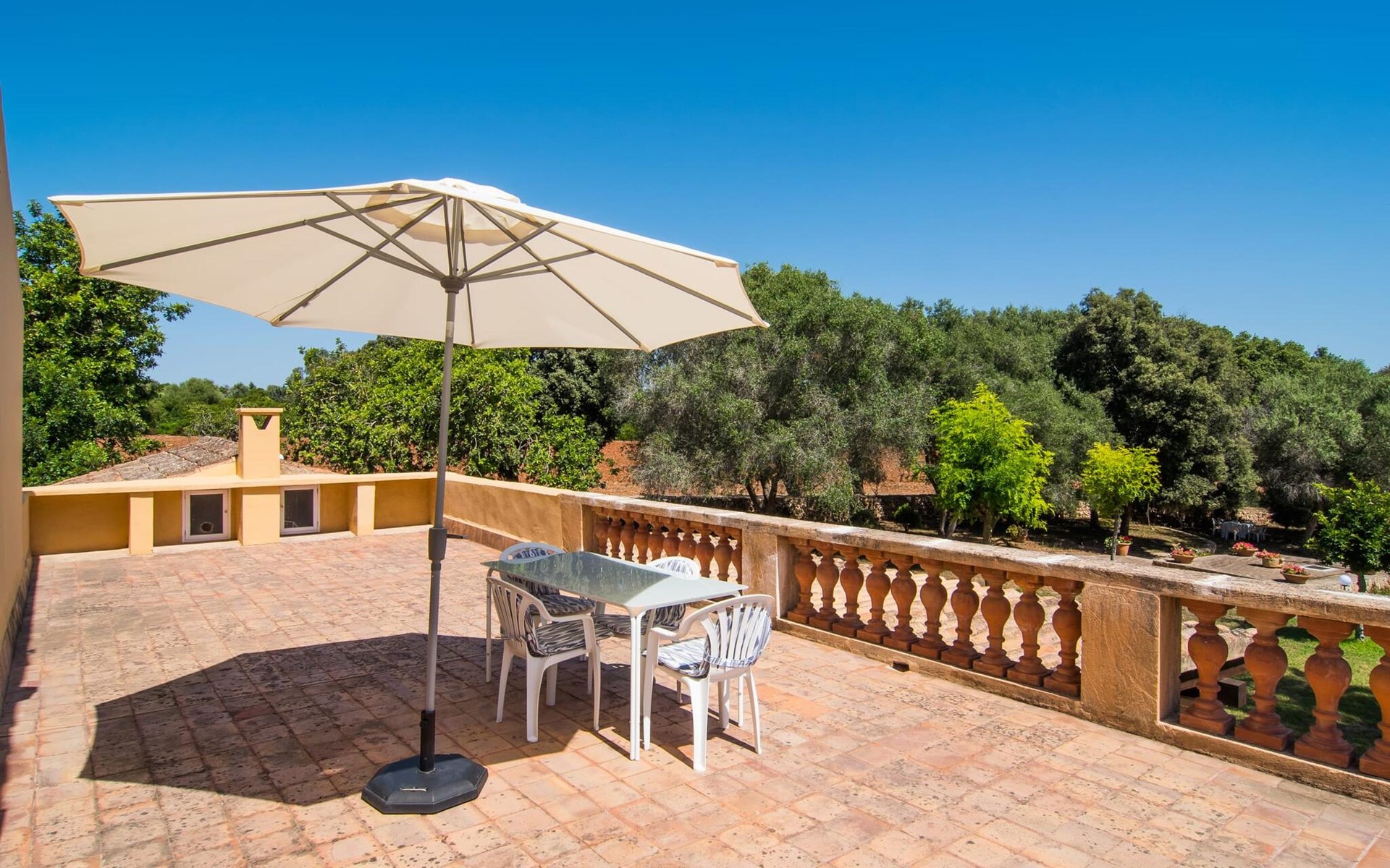 Wer sich für die Villa „Ses Cases de Son Isidros“ entscheidet, kann sich bei seinem Aufenthalt auf Mallorca guten Gewissens wie ein Großgrundbesitzer fühlen: das weitläufige Anwesen, das an einen wildromantischen Park erinnert und auf dem Palmen und andere mediterrane Pflanzen wachsen Bäume spenden Schatten, umfasst eine Fläche von knapp 100.000 m². Hier können Sie nach Lust und Laune spazieren gehen, sich an den intensiv leuchtenden Blumen erfreuen, mit den Kleinen Verstecken spielen, in einer der gemütlichen Sitzecken einen Nachmittagstee genießen oder einfach einen erfrischenden Sprung ins kühle Nass wagen Ihr stattlicher Pool. Anschließend können Sie am Steinrand Ihre Beine im Wasser baumeln lassen und sich dabei in eine unterhaltsame Urlaubslektüre vertiefen. Von der Poolterrasse, auf der mehrere Liegestühle zu einem Nickerchen in der Sonne einladen, führen Steinstufen hinauf zum Anwesen, an dessen Bruchsteinfassade sich eine überdachte Terrasse schmiegt. Vielleicht möchten Sie hier am späten Nachmittag den Grill aufbauen, um den Abend mit kulinarischen Köstlichkeiten der Insel ausklingen zu lassen. Eine große Dachterrasse und ein Balkon sind zudem ideale Orte, um sich die milde Inselluft, die angenehm nach Meer duftet, um die Nase wehen zu lassen.