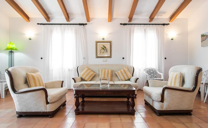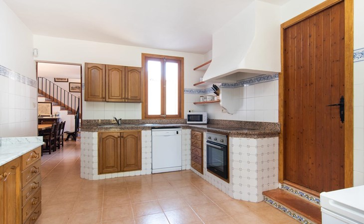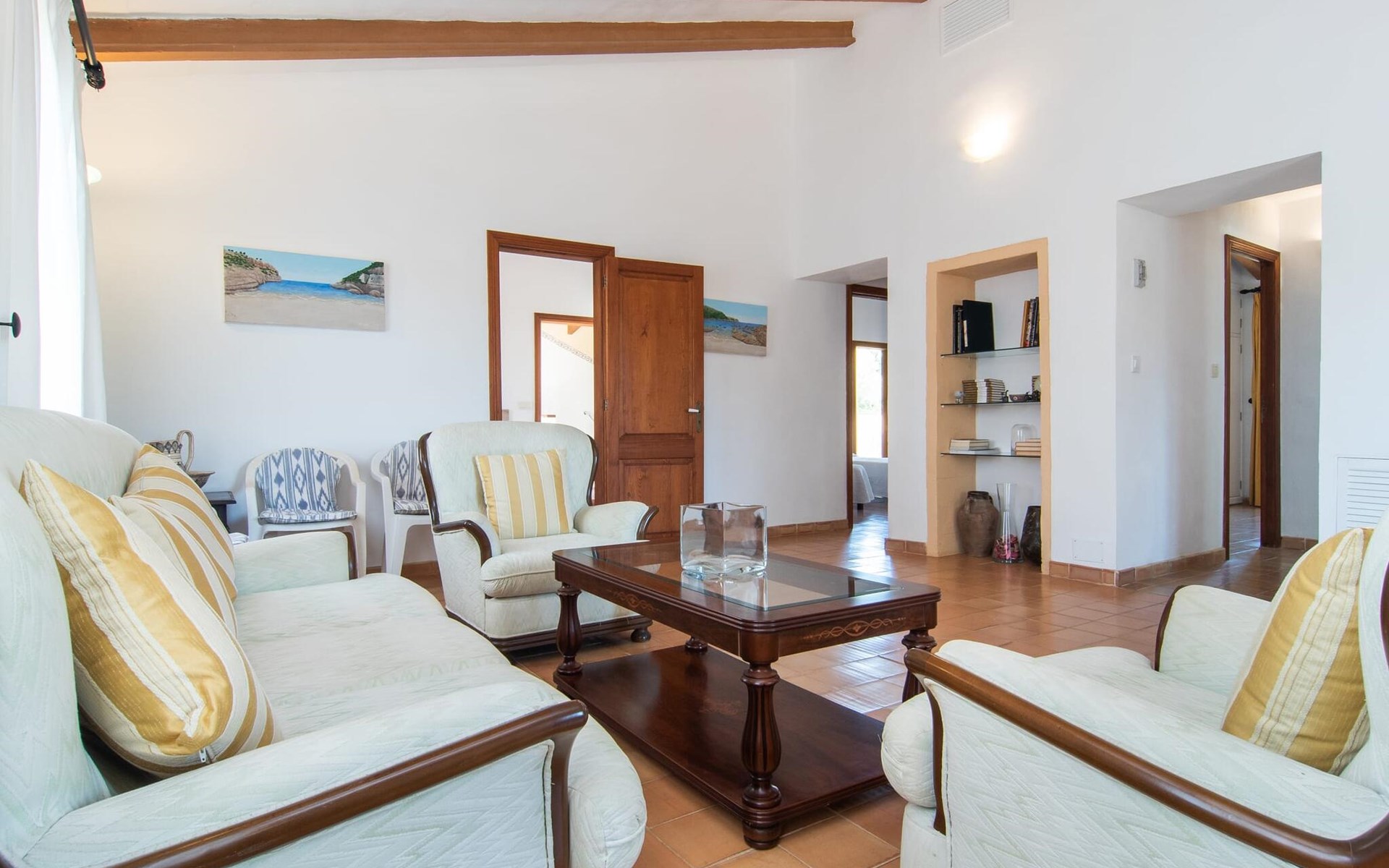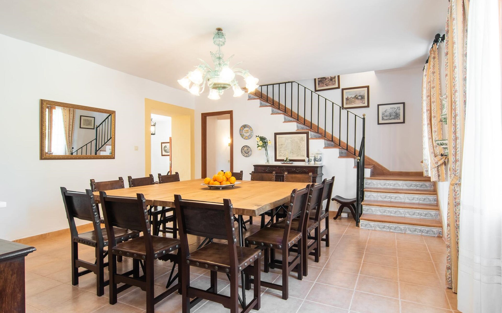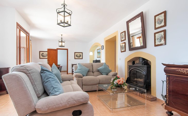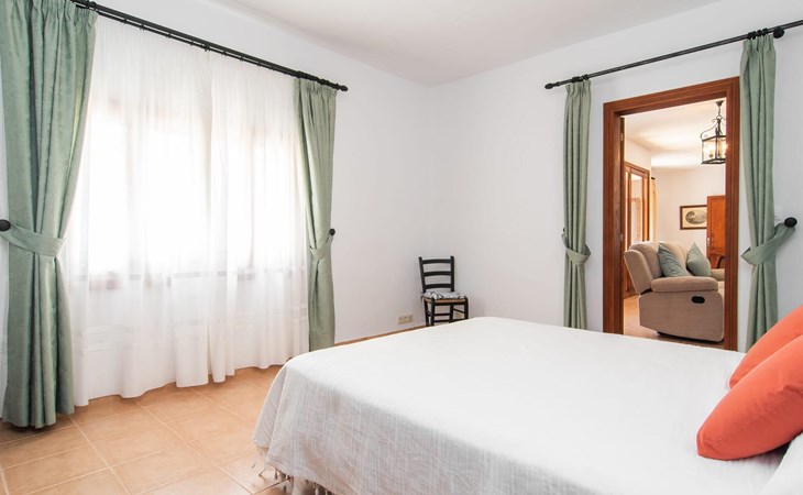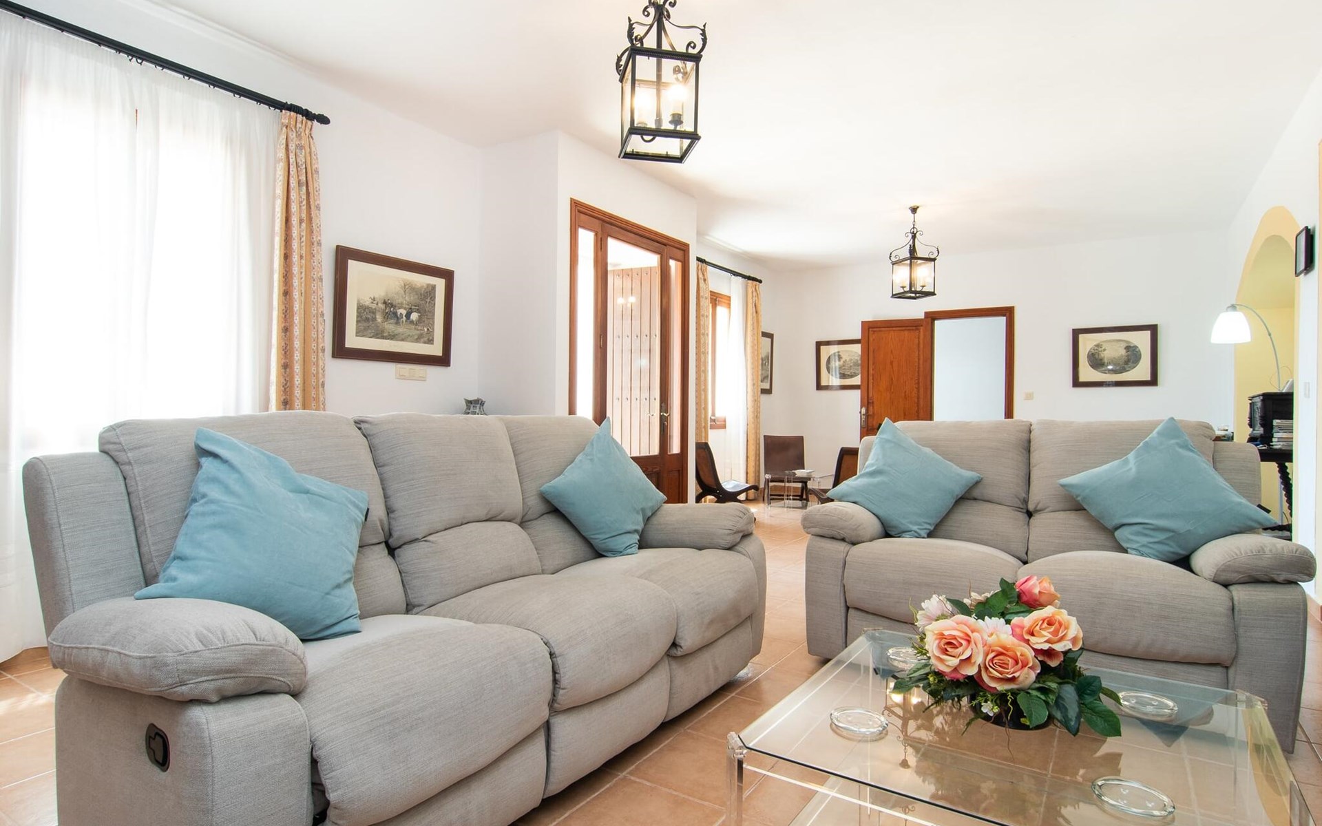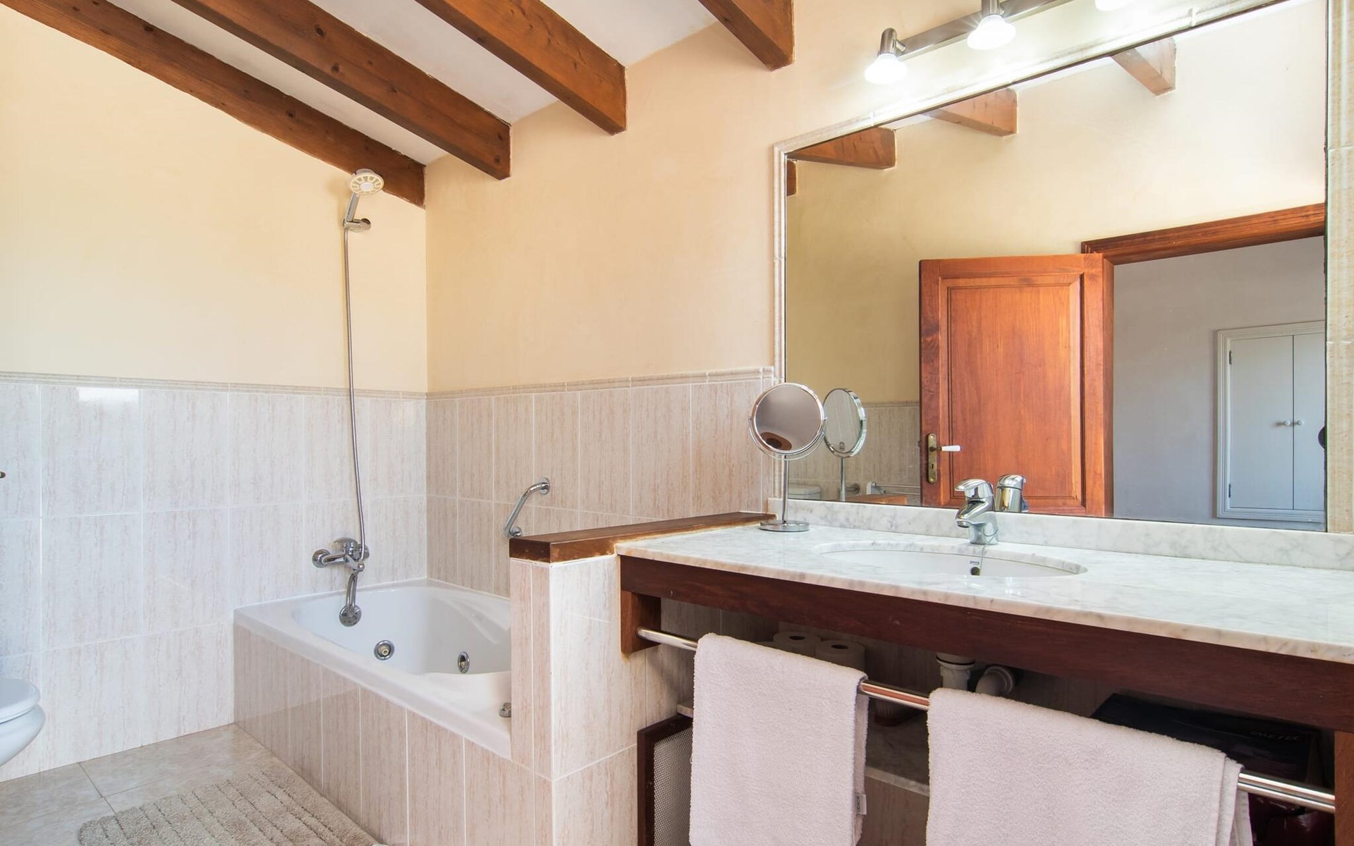 Wer sich für die Villa „Ses Cases de Son Isidros“ entscheidet, kann sich bei seinem Aufenthalt auf Mallorca guten Gewissens wie ein Großgrundbesitzer fühlen: das weitläufige Anwesen, das an einen wildromantischen Park erinnert und auf dem Palmen und andere mediterrane Pflanzen wachsen Bäume spenden Schatten, umfasst eine Fläche von knapp 100.000 m². Hier können Sie nach Lust und Laune spazieren gehen, sich an den intensiv leuchtenden Blumen erfreuen, mit den Kleinen Verstecken spielen, in einer der gemütlichen Sitzecken einen Nachmittagstee genießen oder einfach einen erfrischenden Sprung ins kühle Nass wagen Ihr stattlicher Pool. Anschließend können Sie am Steinrand Ihre Beine im Wasser baumeln lassen und sich dabei in eine unterhaltsame Urlaubslektüre vertiefen. Von der Poolterrasse, auf der mehrere Liegestühle zu einem Nickerchen in der Sonne einladen, führen Steinstufen hinauf zum Anwesen, an dessen Bruchsteinfassade sich eine überdachte Terrasse schmiegt. Vielleicht möchten Sie hier am späten Nachmittag den Grill aufbauen, um den Abend mit kulinarischen Köstlichkeiten der Insel ausklingen zu lassen. Eine große Dachterrasse und ein Balkon sind zudem ideale Orte, um sich die milde Inselluft, die angenehm nach Meer duftet, um die Nase wehen zu lassen.