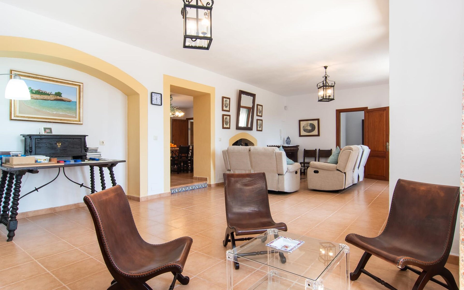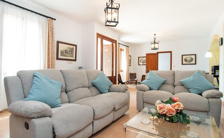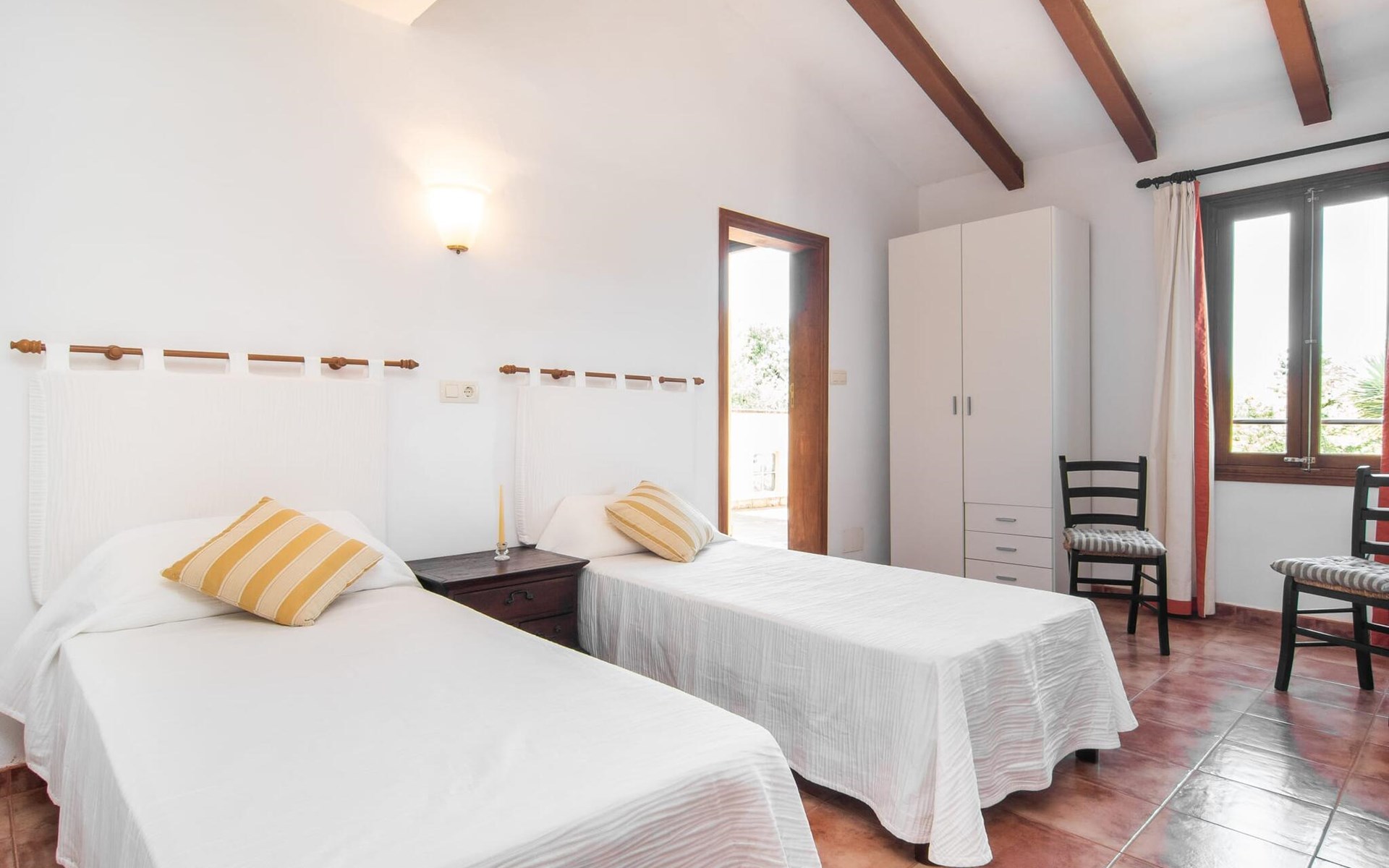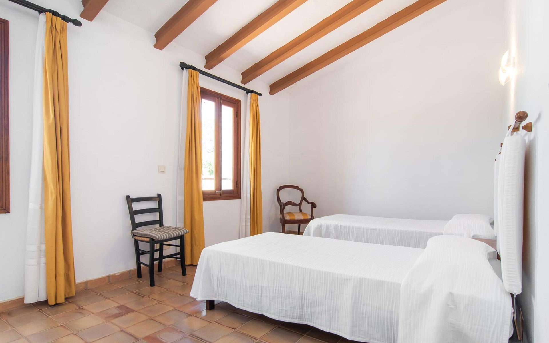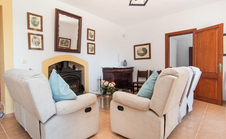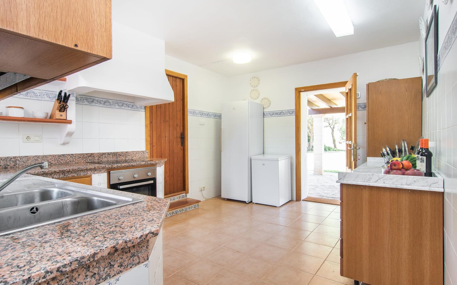 Wer sich für die Villa „Ses Cases de Son Isidros“ entscheidet, kann sich bei seinem Aufenthalt auf Mallorca guten Gewissens wie ein Großgrundbesitzer fühlen: das weitläufige Anwesen, das an einen wildromantischen Park erinnert und auf dem Palmen und andere mediterrane Pflanzen wachsen Bäume spenden Schatten, umfasst eine Fläche von knapp 100.000 m². Hier können Sie nach Lust und Laune spazieren gehen, sich an den intensiv leuchtenden Blumen erfreuen, mit den Kleinen Verstecken spielen, in einer der gemütlichen Sitzecken einen Nachmittagstee genießen oder einfach einen erfrischenden Sprung ins kühle Nass wagen Ihr stattlicher Pool. Anschließend können Sie am Steinrand Ihre Beine im Wasser baumeln lassen und sich dabei in eine unterhaltsame Urlaubslektüre vertiefen. Von der Poolterrasse, auf der mehrere Liegestühle zu einem Nickerchen in der Sonne einladen, führen Steinstufen hinauf zum Anwesen, an dessen Bruchsteinfassade sich eine überdachte Terrasse schmiegt. Vielleicht möchten Sie hier am späten Nachmittag den Grill aufbauen, um den Abend mit kulinarischen Köstlichkeiten der Insel ausklingen zu lassen. Eine große Dachterrasse und ein Balkon sind zudem ideale Orte, um sich die milde Inselluft, die angenehm nach Meer duftet, um die Nase wehen zu lassen.