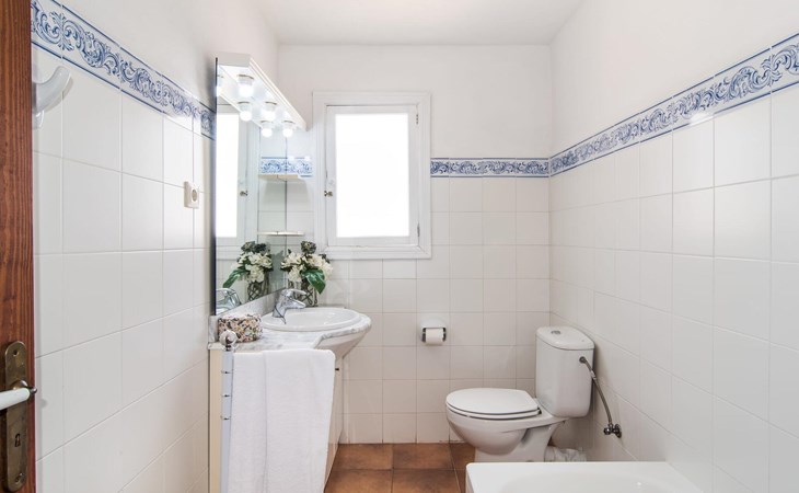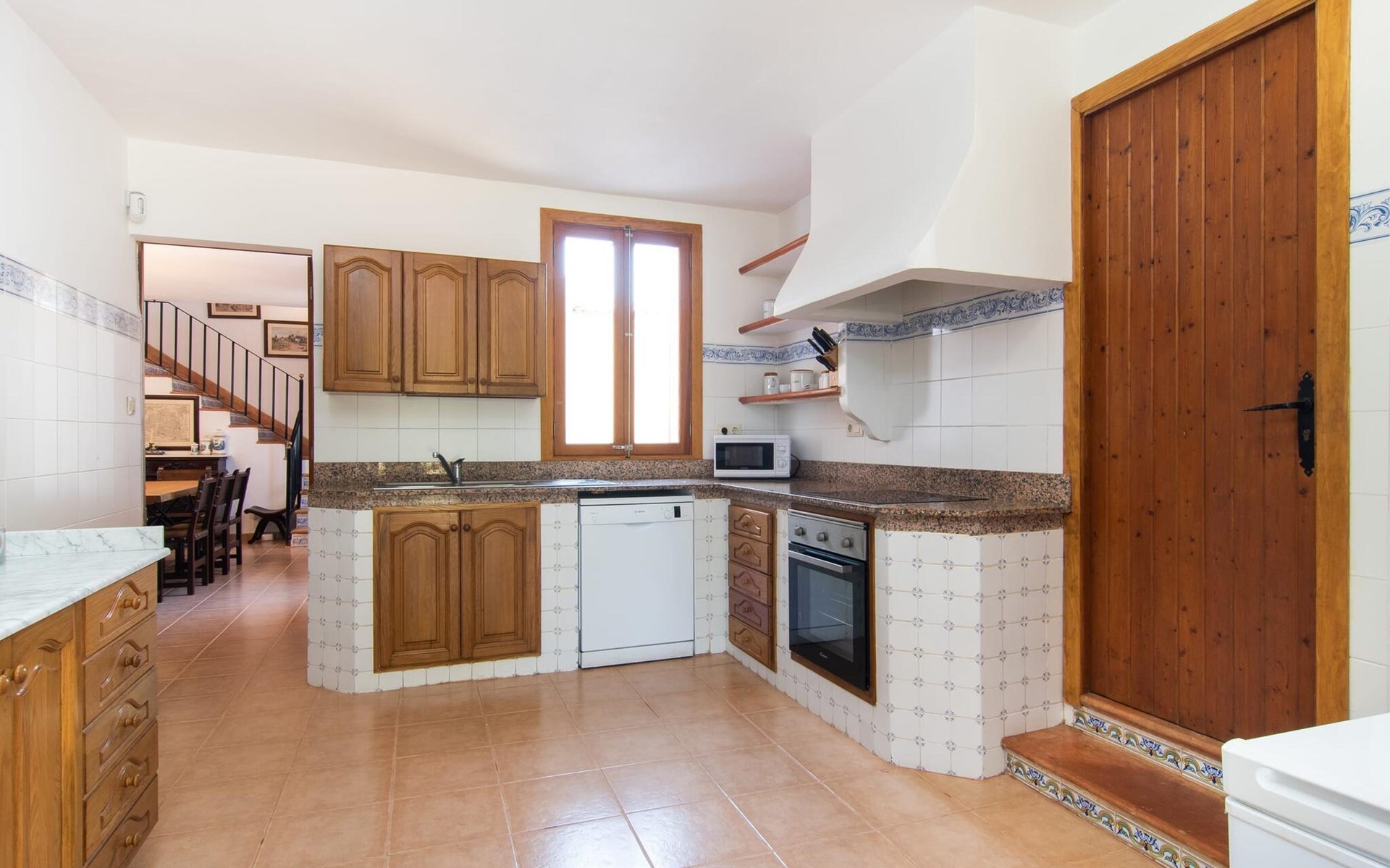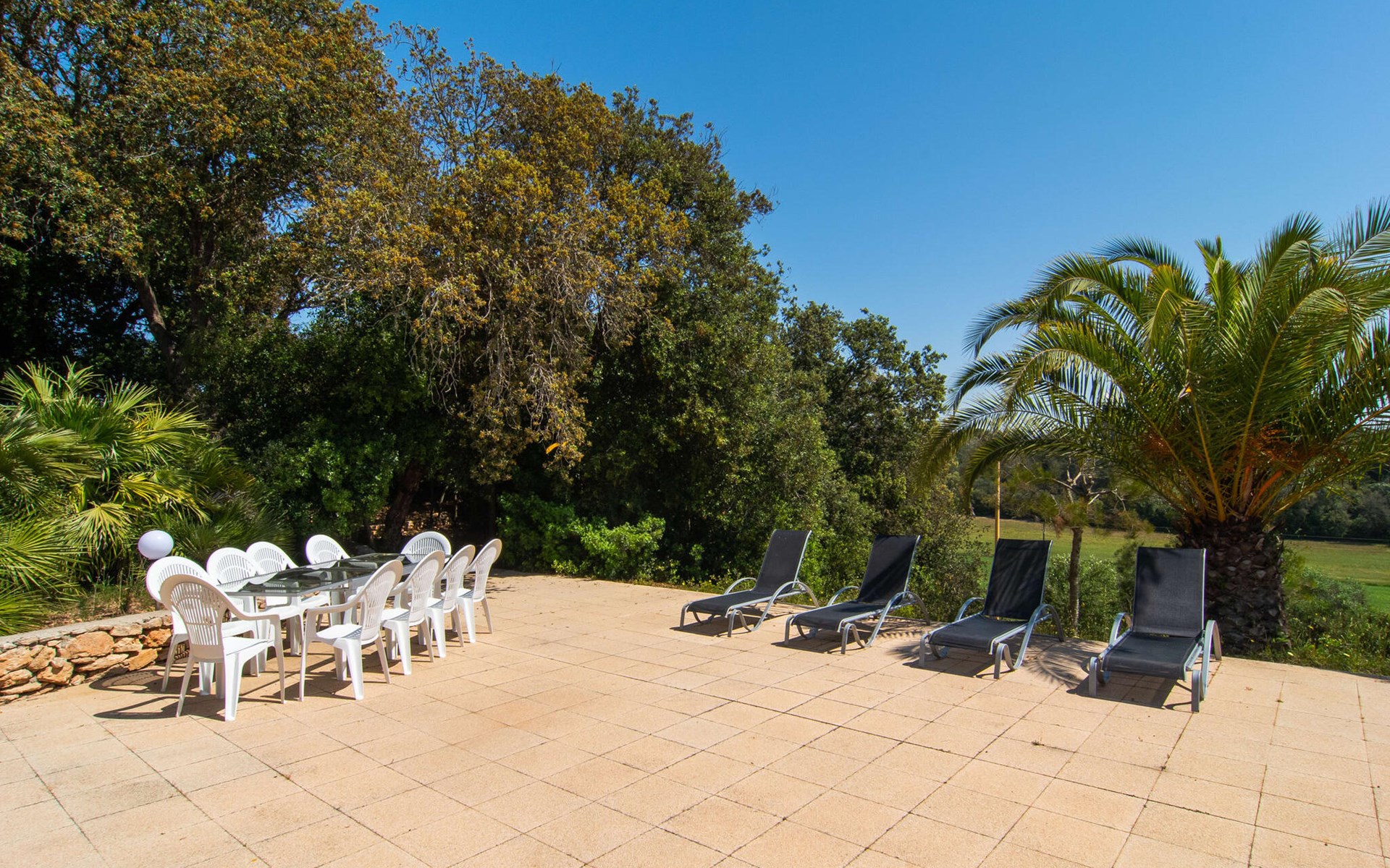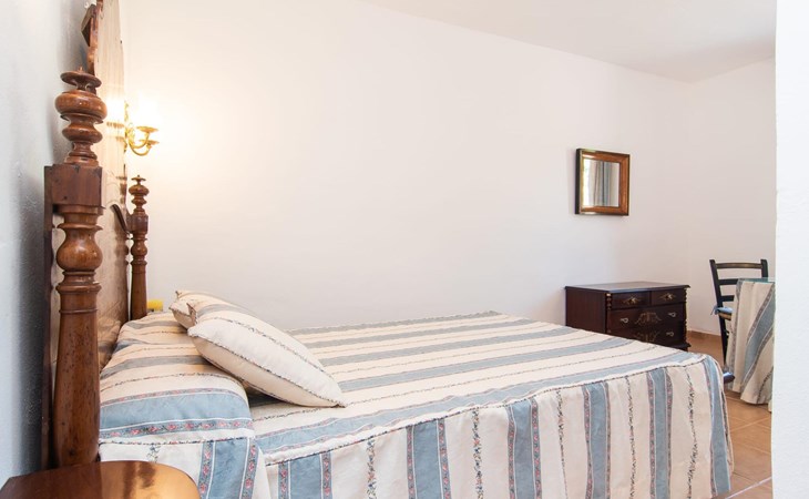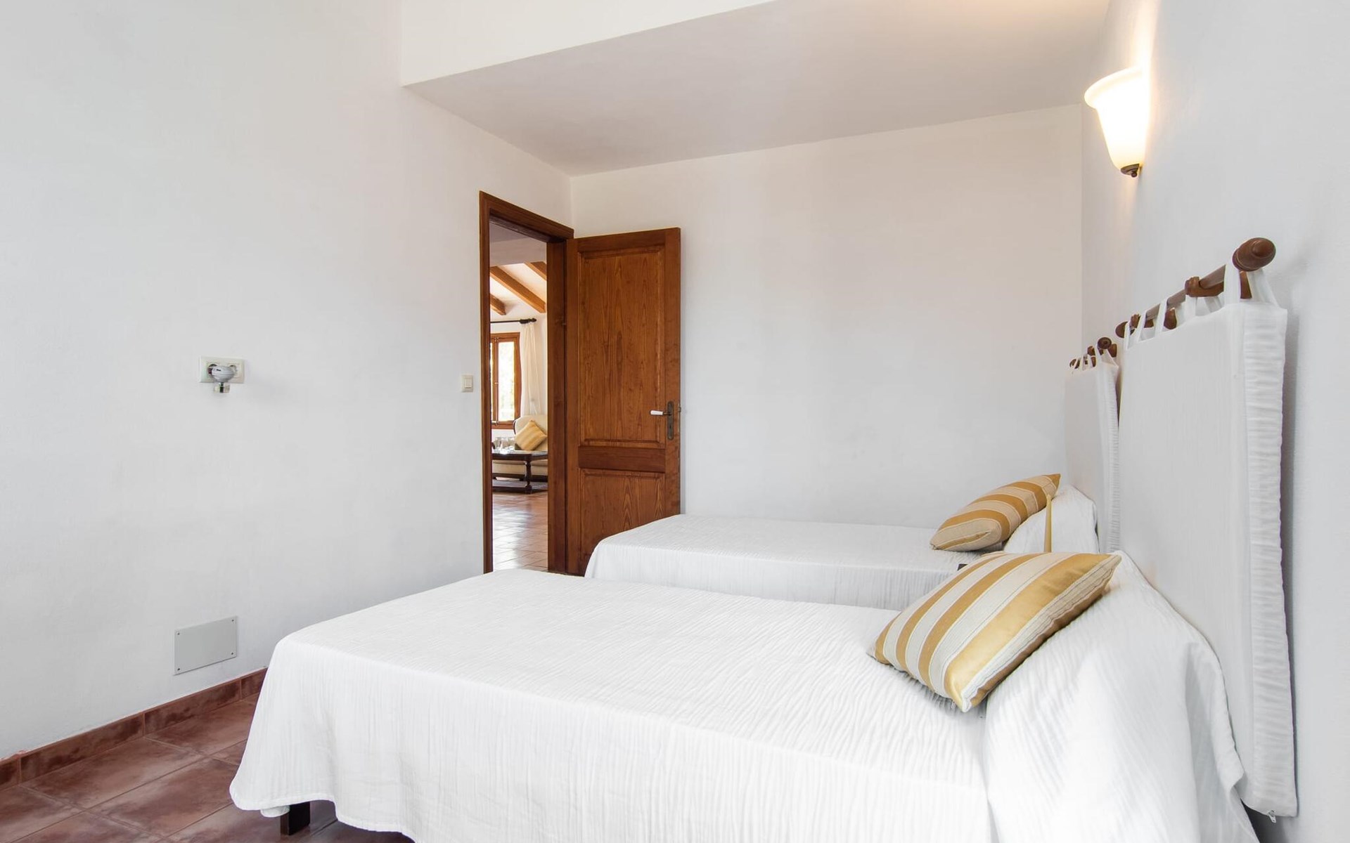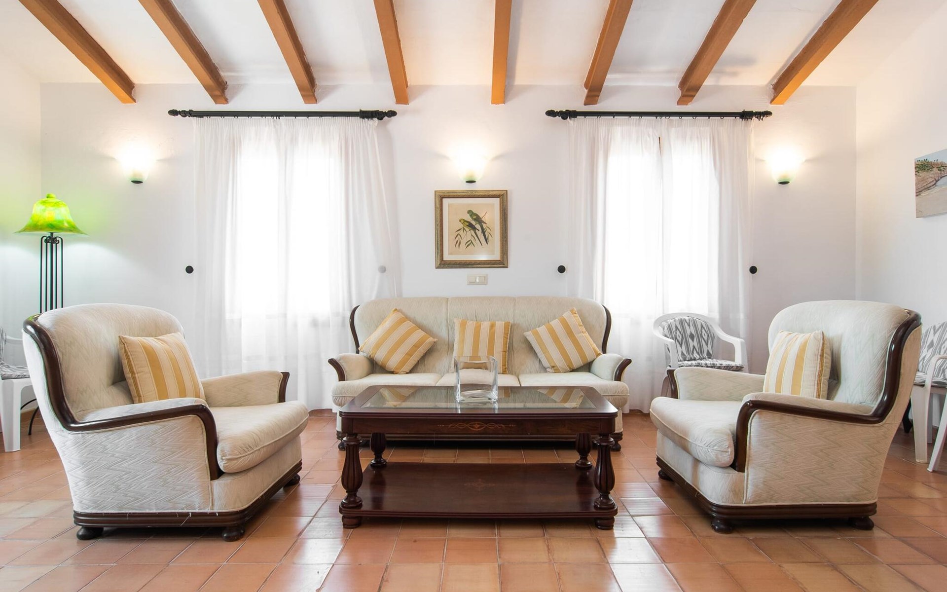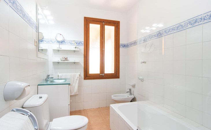 Wer sich für die Villa „Ses Cases de Son Isidros“ entscheidet, kann sich bei seinem Aufenthalt auf Mallorca guten Gewissens wie ein Großgrundbesitzer fühlen: das weitläufige Anwesen, das an einen wildromantischen Park erinnert und auf dem Palmen und andere mediterrane Pflanzen wachsen Bäume spenden Schatten, umfasst eine Fläche von knapp 100.000 m². Hier können Sie nach Lust und Laune spazieren gehen, sich an den intensiv leuchtenden Blumen erfreuen, mit den Kleinen Verstecken spielen, in einer der gemütlichen Sitzecken einen Nachmittagstee genießen oder einfach einen erfrischenden Sprung ins kühle Nass wagen Ihr stattlicher Pool. Anschließend können Sie am Steinrand Ihre Beine im Wasser baumeln lassen und sich dabei in eine unterhaltsame Urlaubslektüre vertiefen. Von der Poolterrasse, auf der mehrere Liegestühle zu einem Nickerchen in der Sonne einladen, führen Steinstufen hinauf zum Anwesen, an dessen Bruchsteinfassade sich eine überdachte Terrasse schmiegt. Vielleicht möchten Sie hier am späten Nachmittag den Grill aufbauen, um den Abend mit kulinarischen Köstlichkeiten der Insel ausklingen zu lassen. Eine große Dachterrasse und ein Balkon sind zudem ideale Orte, um sich die milde Inselluft, die angenehm nach Meer duftet, um die Nase wehen zu lassen.