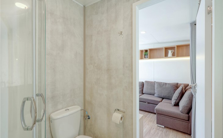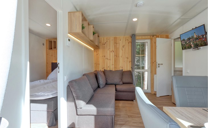 Der gemütliche Wohnbereich mit Schlafcouch, Essbereich und gut ausgestatteter Küchenzeile lädt zu gemeinsamen Stunden mit der Familie ein. Im separaten Schlafzimmer lässt es sich wunderbar träumen. Die Schlafcouch im Wohnbereich ist 170 cm lang und daher nur für Kinder geeignet. Zusätzlich verfügt das Tiny Haus über ein eigenes Bad mit Dusche.