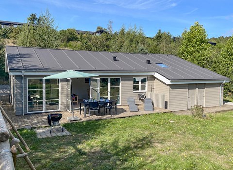 Vom Wohn- und Essbereich gelangen Sie auf die schöne Terrasse, die zwischen dem Haus und den beiden Nebengebäuden liegt, die zusammen mit dem Haus gebaut werden. Hier können Sie sich in den Gartenmöbeln entspannen, auf der Gartenschaukel sitzen, köstliche Urlaubsgerichte grillen, die Sie in der tollen Außenküche zubereiten, und einfach die Ferien genießen.