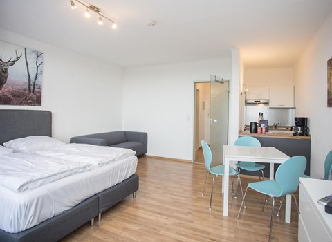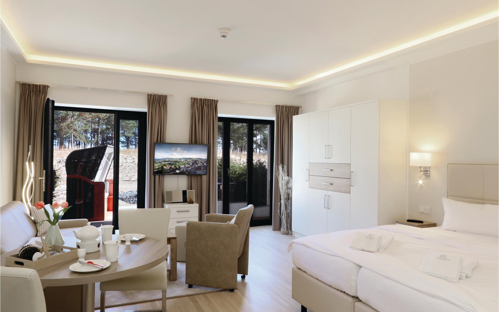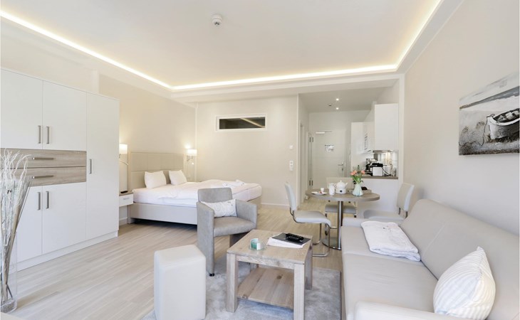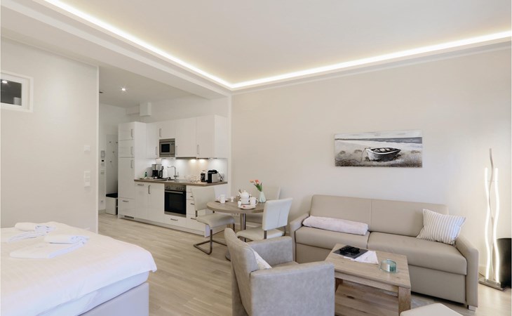 Das exklusive Studio-Apartment ist das perfekte Domizil für einen traumhaften Urlaub zu zweit auf der schönen Insel Rügen. Das Apartment ist raffiniert gestaltet, so dass sich auf kleinem Raum alles finden lässt, was Sie für einen entspannten Urlaub benötigen: die praktische Küchenzeile samt Esstisch, ein Schlafbereich mit hochwertigem Boxspringbett, ein gemütlicher, heller Wohnbereich und natürlich das Highlight des Studios: die eigene Terrasse in direkter Strandnähe.