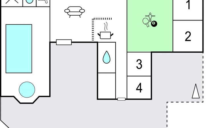 Soll Zeit mit Baden und Wellness verbracht werden, wird hier ein großer Poolraum mit Swimmingpool, Whirlpool und Sauna angeboten. Der Whirlpool steht in einem verglasten Erker mit freiem Blick auf die Natur. Im gegenüberliegenden Teil des Hauses ist ein Spielzimmer mit Billard und mehr. Es gibt vier Schlafzimmer, einem Schlafboden für die Kinder und in der Mitte des Hauses liegen Küche und Wohnzimmer als zentrale Aufenthaltsbereiche.