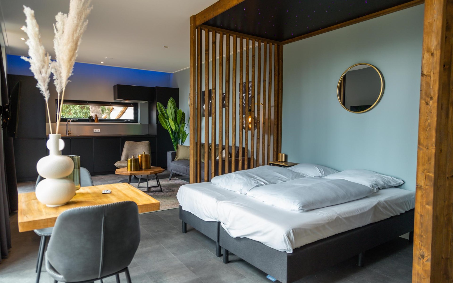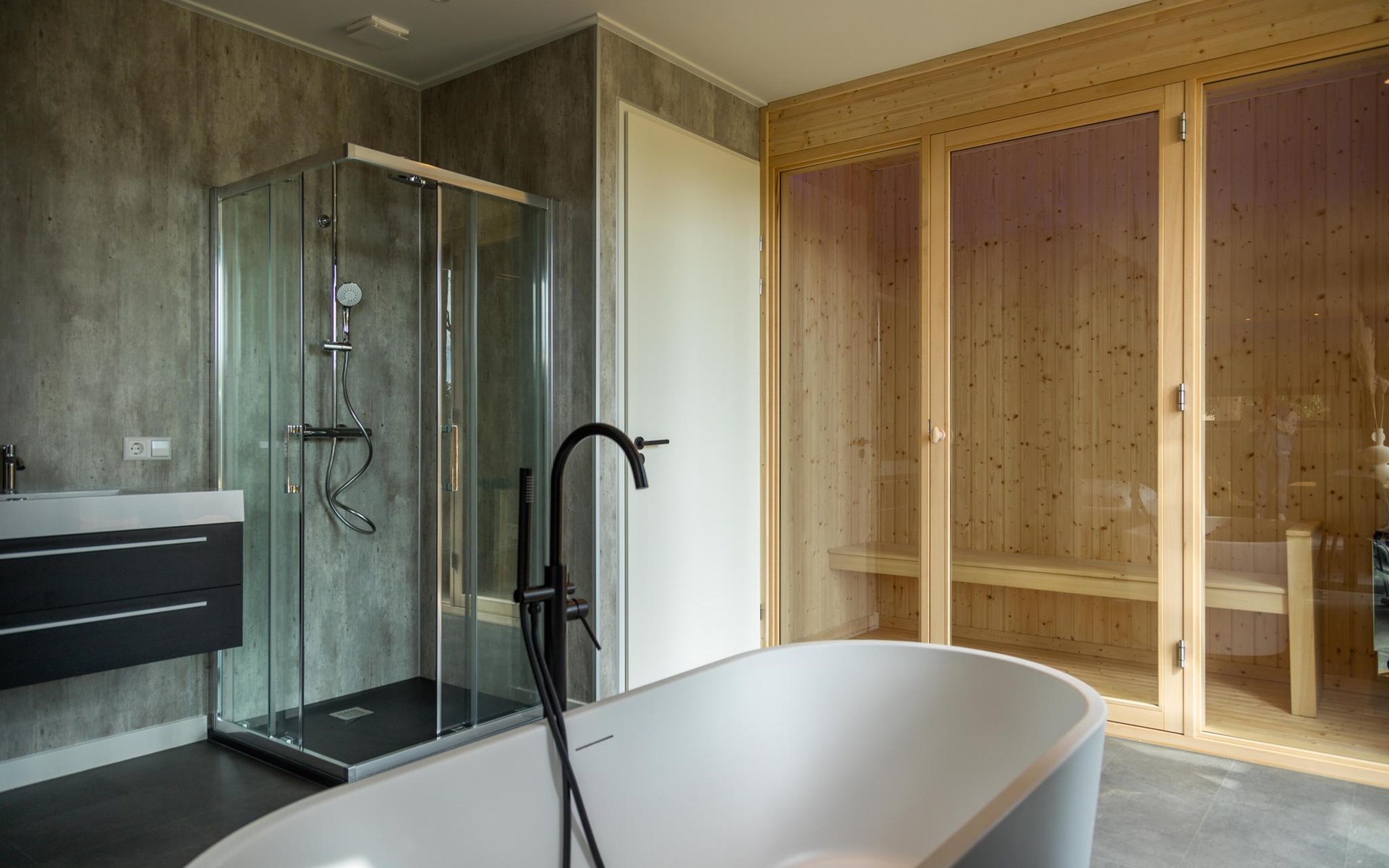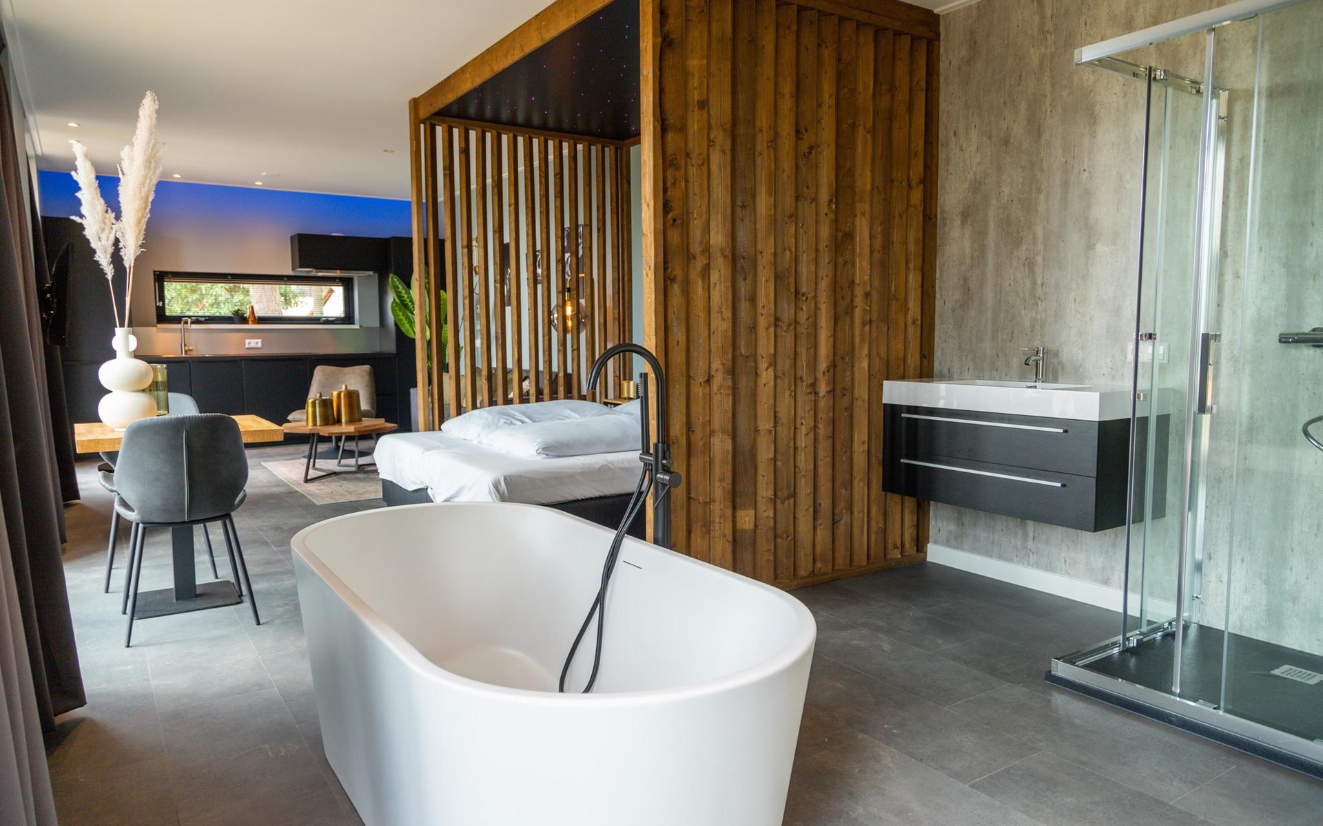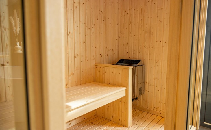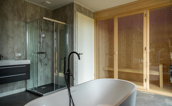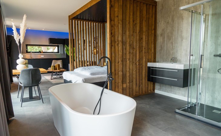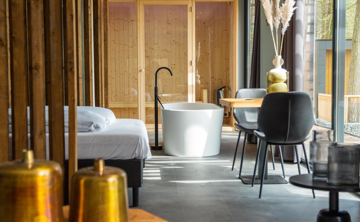 Der Modus Wellness 2 erinnert an ein luxuriöses Hotelzimmer mit wunderbaren Wellnesseinrichtungen. Das freistehende und ebenerdige Chalet ist für 2 Personen geeignet. Der Wohn-/Schlafraum ist gemütlich eingerichtet und verfügt über ein Doppelbett, eine Sitzecke mit Fernseher, einen Essbereich und eine Küche mit Geschirrspüler, Kühlschrank und einer Filterkaffeemaschine. Das Badezimmer hat eine Badewanne, eine geräumige Dusche, ein Waschbecken und eine Infrarotsauna. Darüber hinaus verfügt der Modus Wellness 2 über eine separate Toilette. Es gibt keine Klimaanlage im Chalet. Am Chalet steht ein Parkplatz für 1 Auto zur Verfügung und das WLAN ist kostenlos.