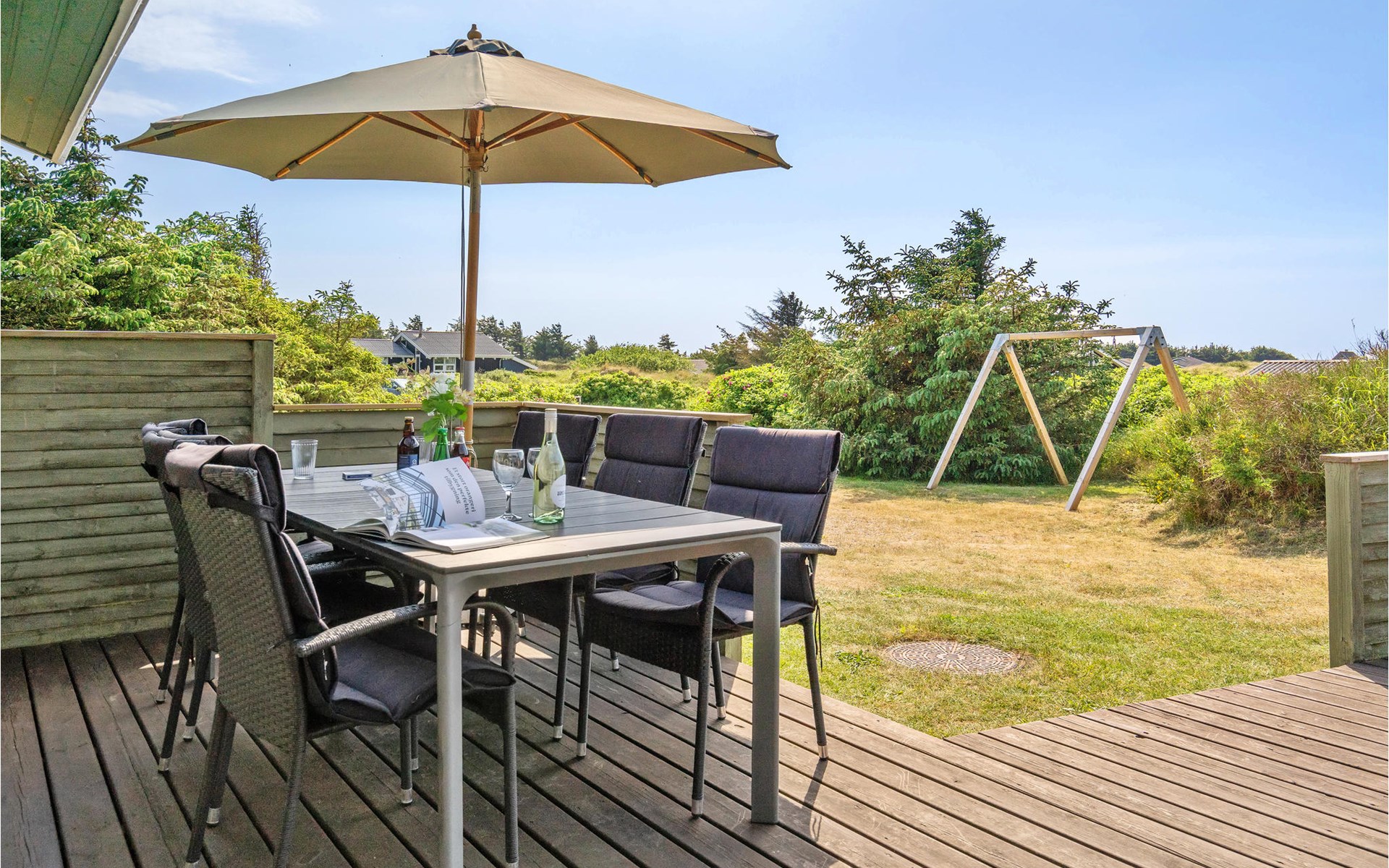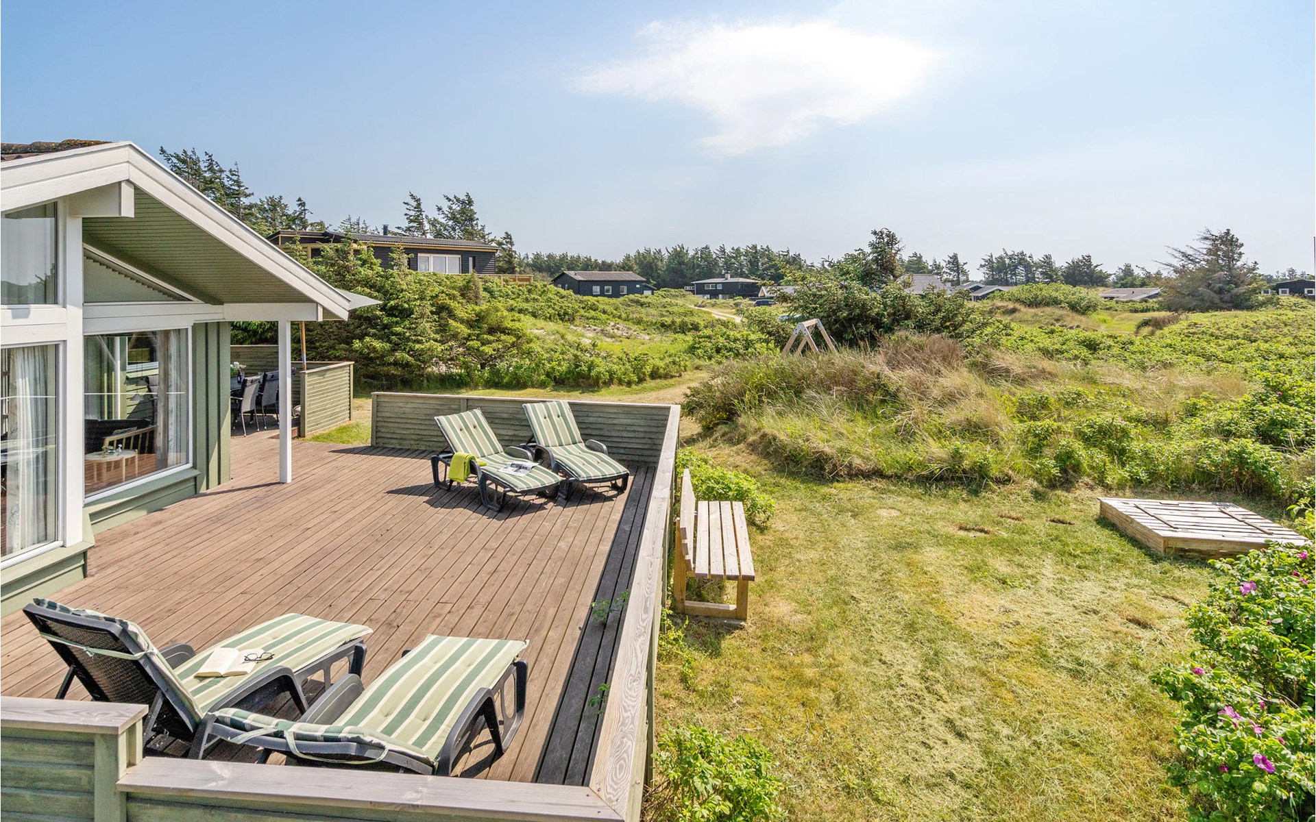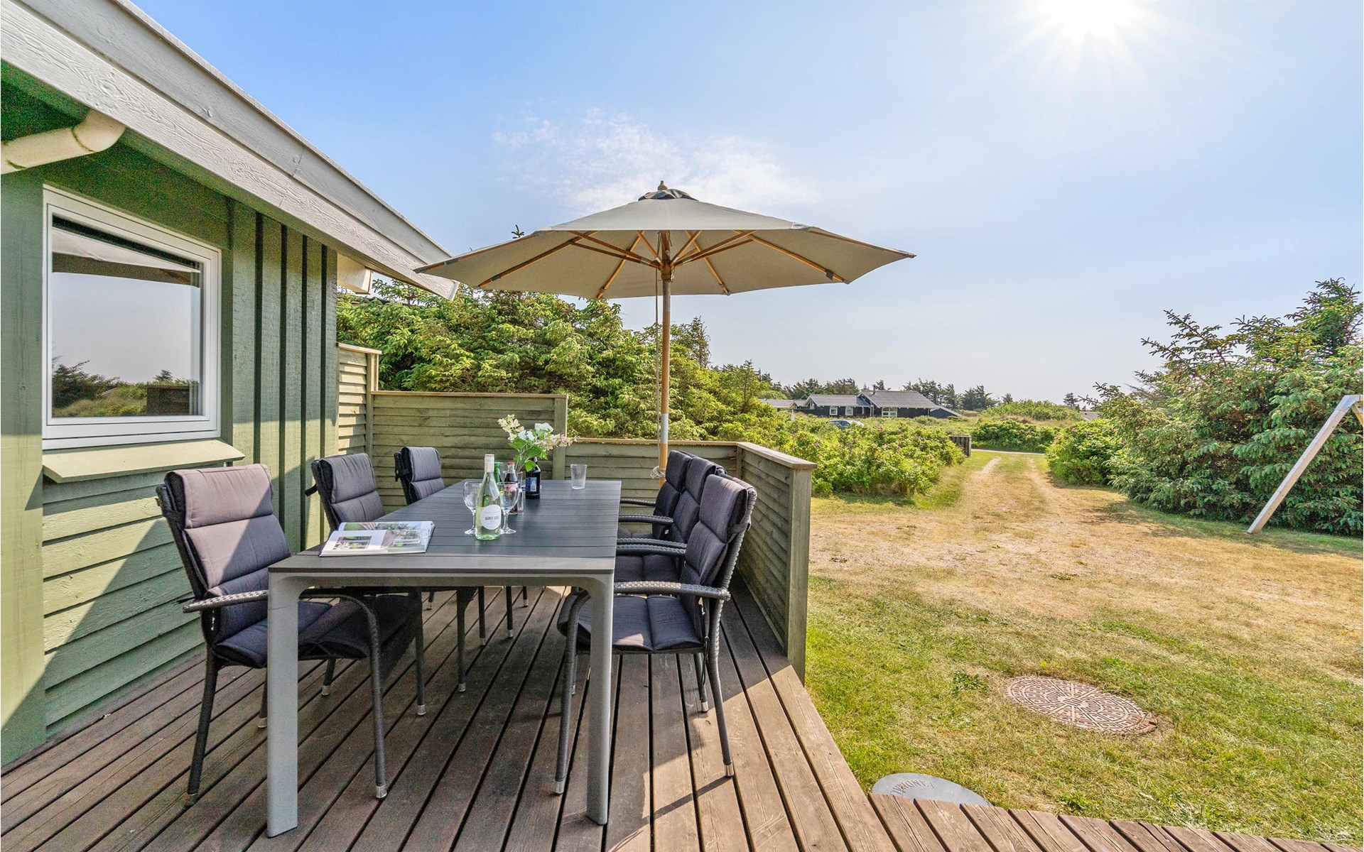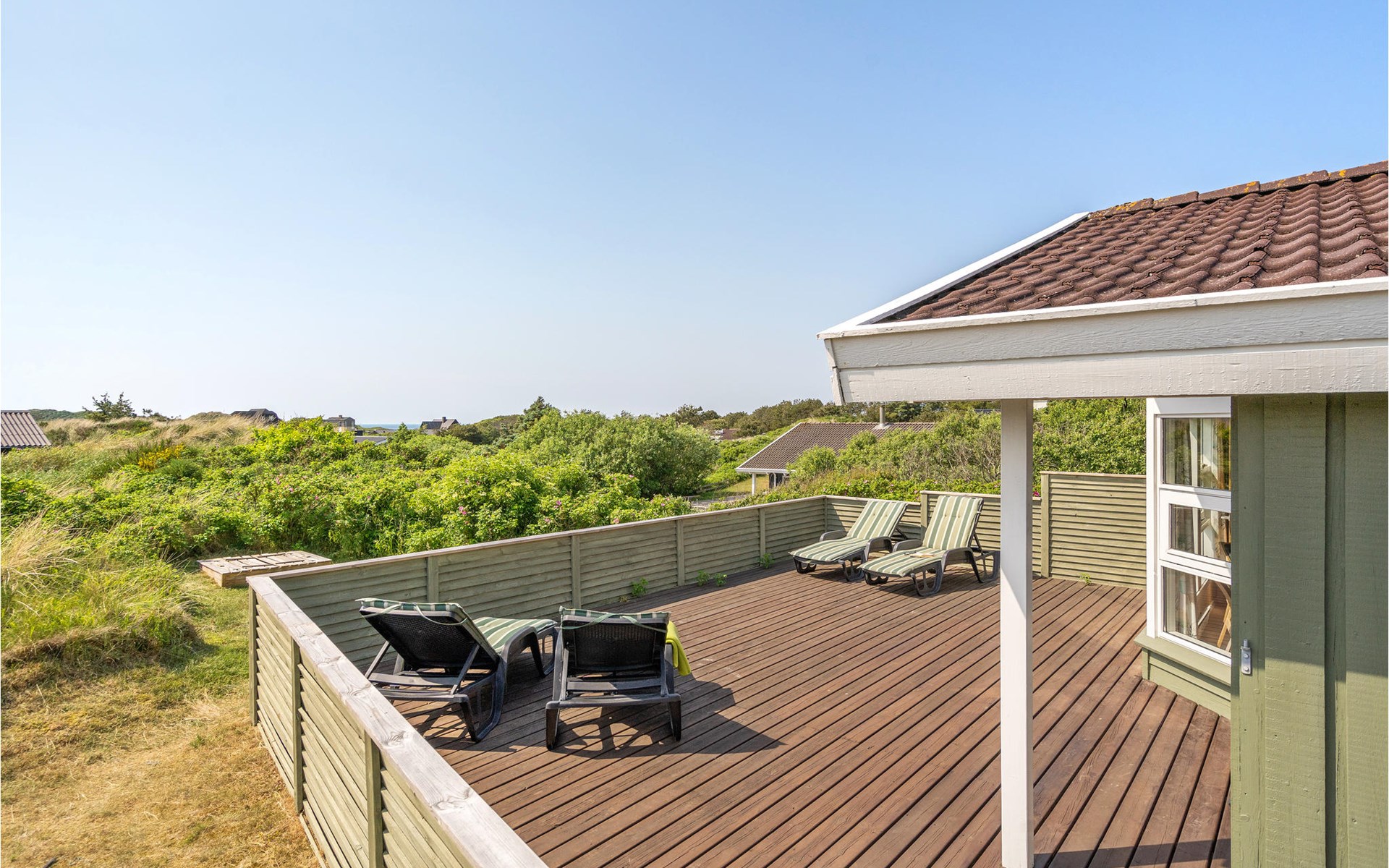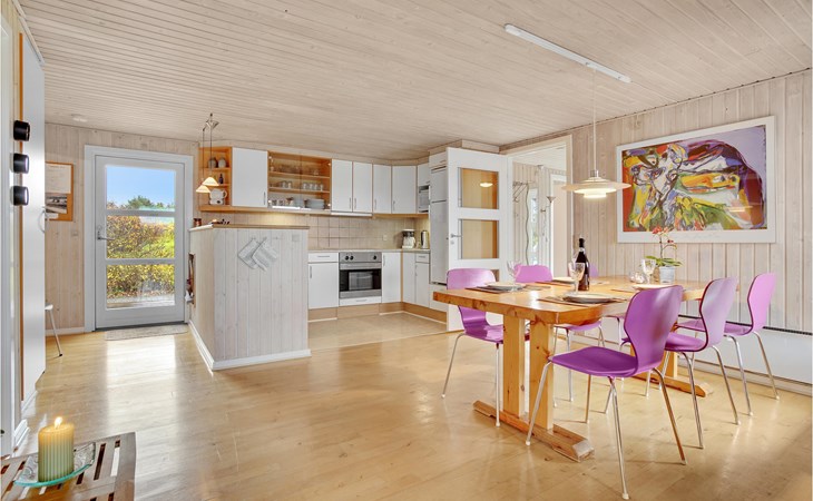 Dieses gut eingerichtete, moderne Ferienhaus liegt in einem ruhigen, naturschönen Gebiet nur wenige Gehminuten von der Nordsee. Es ist von funktionellen Holzterrassen umgeben, auf denen Sie die Sonne genießen können und immer Windschatten finden werden. Das Haus hat große Fenster, von denen man eine ausgezeichnete Aussicht aufs Meer hat, und ist gemütlich eingerichtet. Im Wohnraum gibt es Holzboden. Ein gut ausgestattetes Ferienhaus mit Platz für zwei Familien.