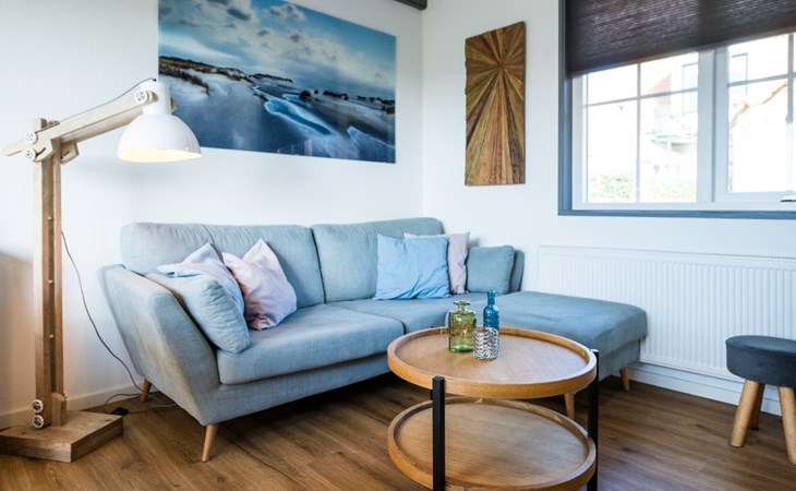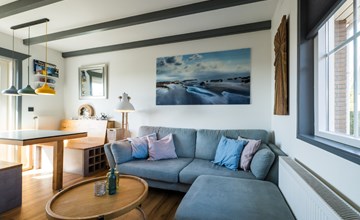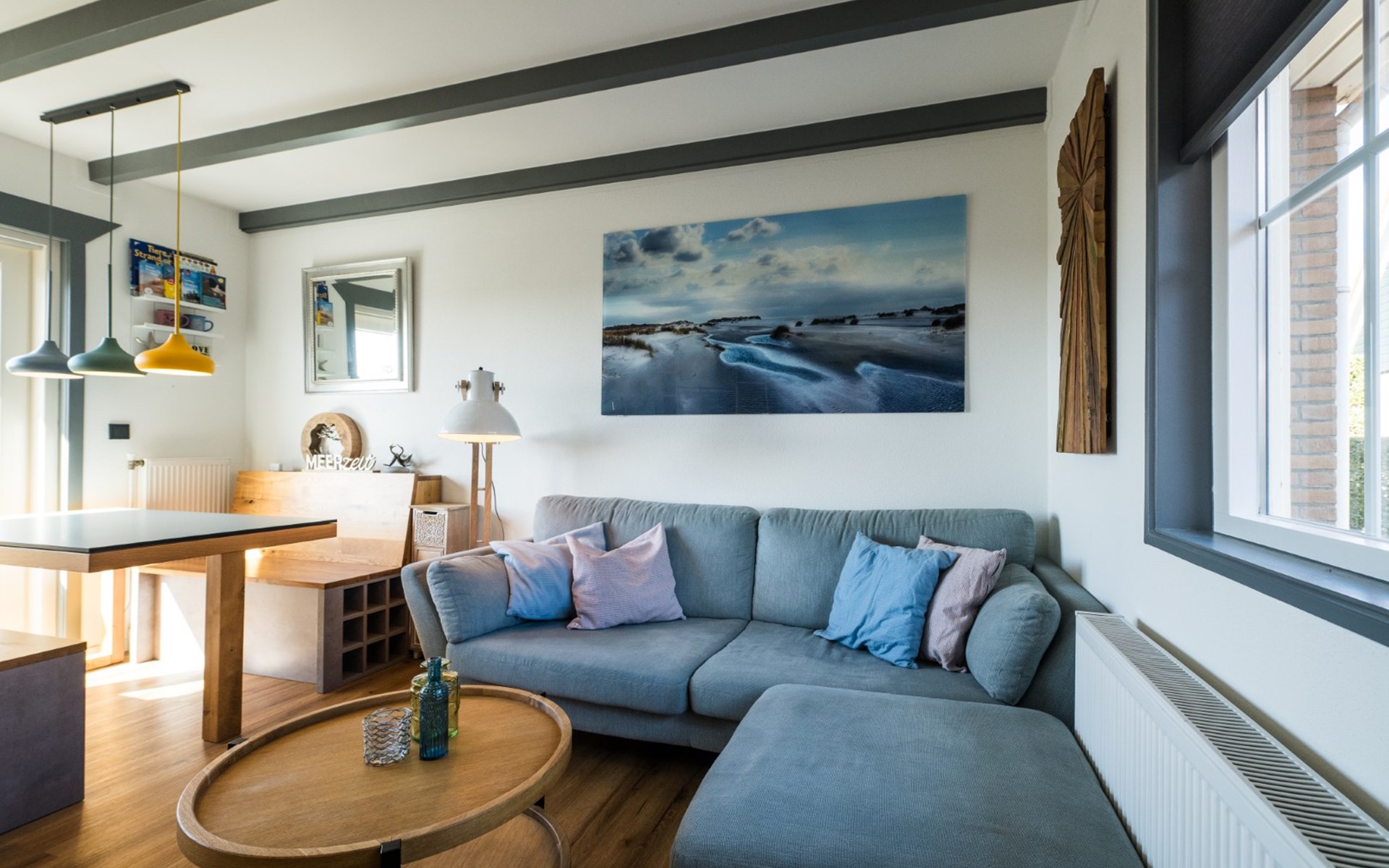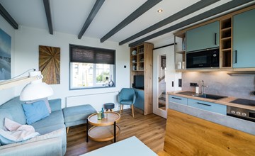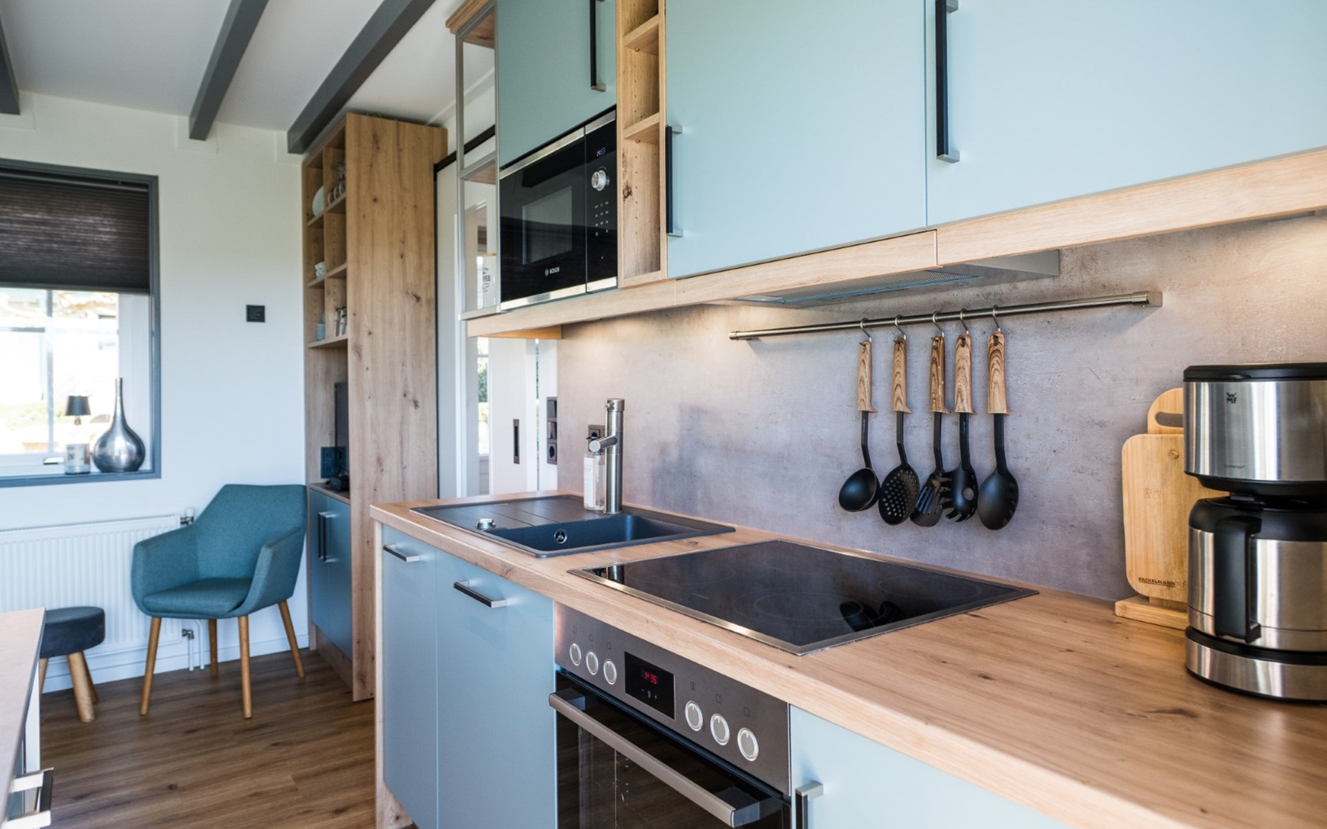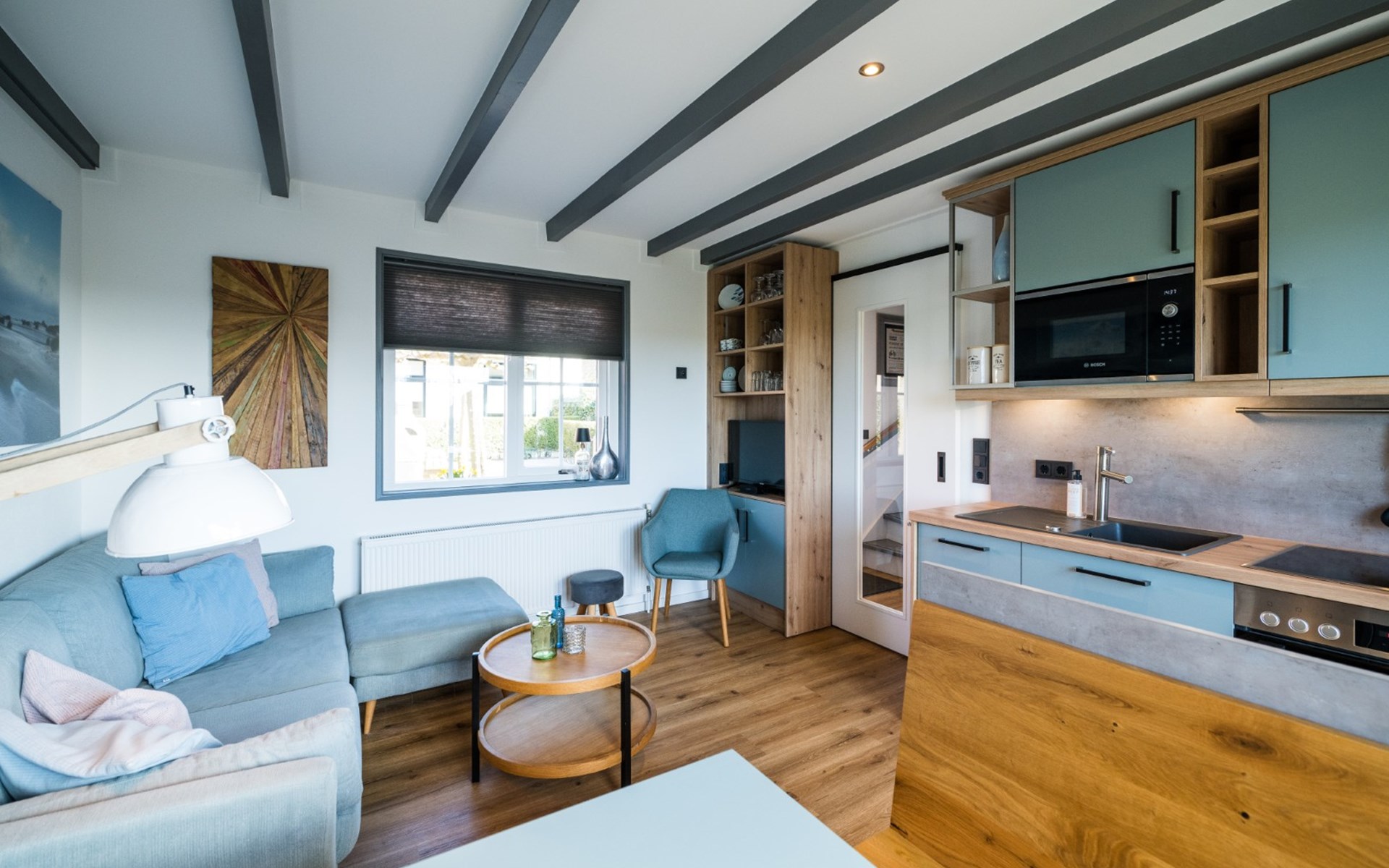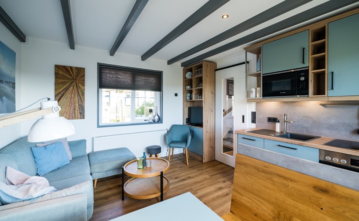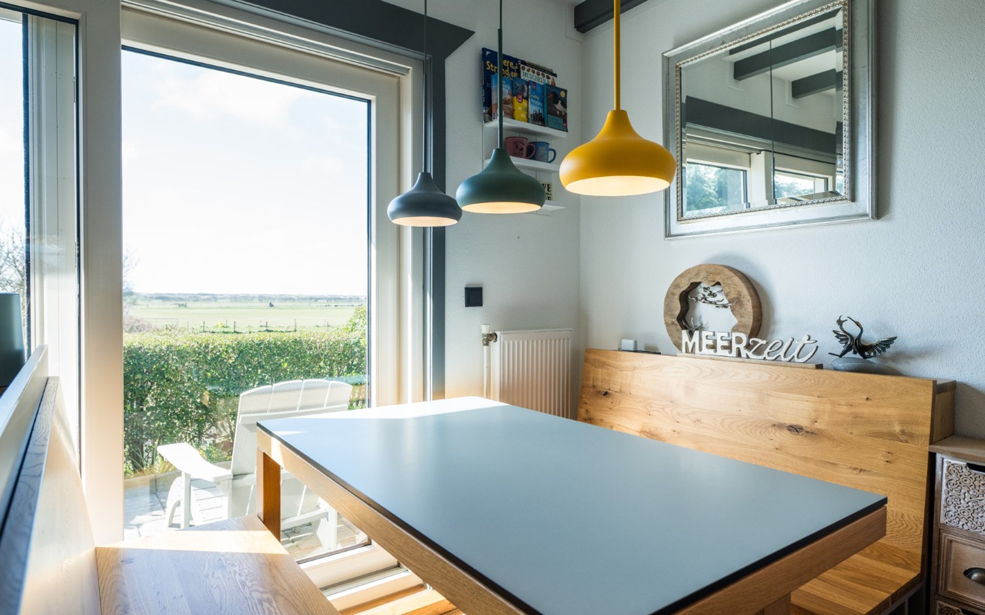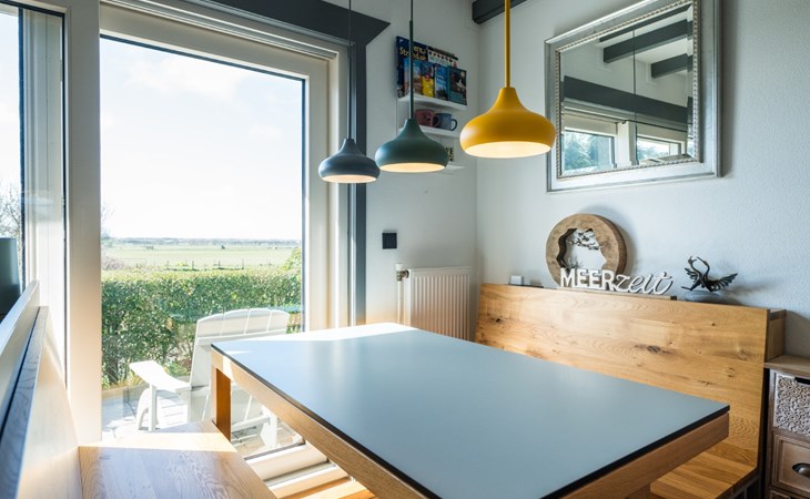 Haus 5 verfügt über ein Wohnzimmer, eine gemütliche Sitzecke neben der Küche und Schiebetüren zur Terrasse mit Blick über die Wiesen und den Deich. Es gibt eine voll ausgestattete Küche mit Geschirrspüler.