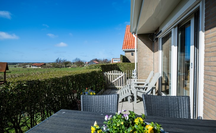 Die Terrasse liegt hier nicht zum Hof, sondern zur Wiesenseite mit schöner Aussicht. Die Eingangstür des Ferienhauses befindet sich zum Innenhof (mit kostenlosem Grill). Die Terrasse liegt windgeschützt nach Westen und ist komplett eingezäunt.