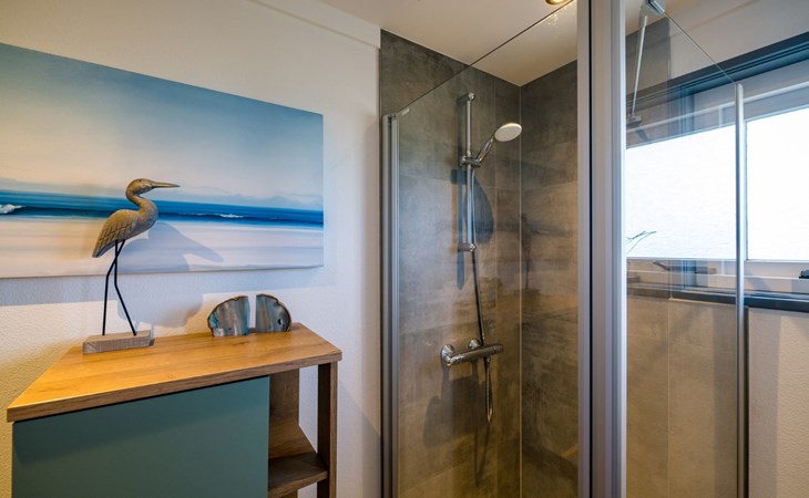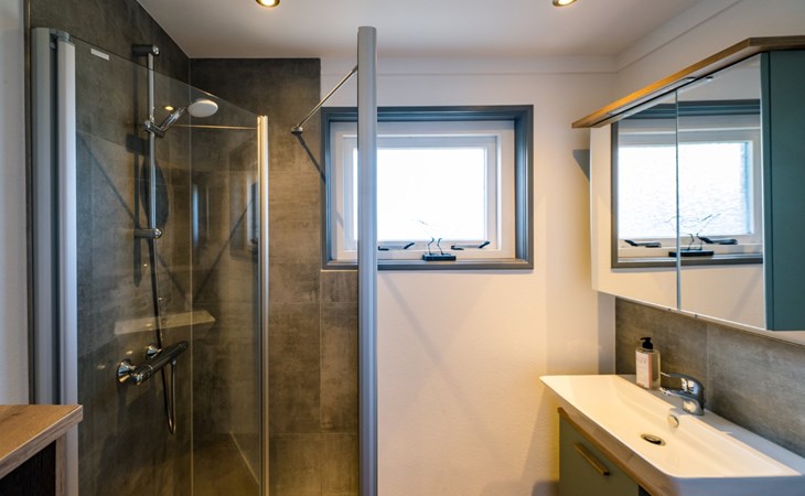 Im Erdgeschoss befindet sich außerdem das Badezimmer mit ebenerdiger Dusche und ein WC.