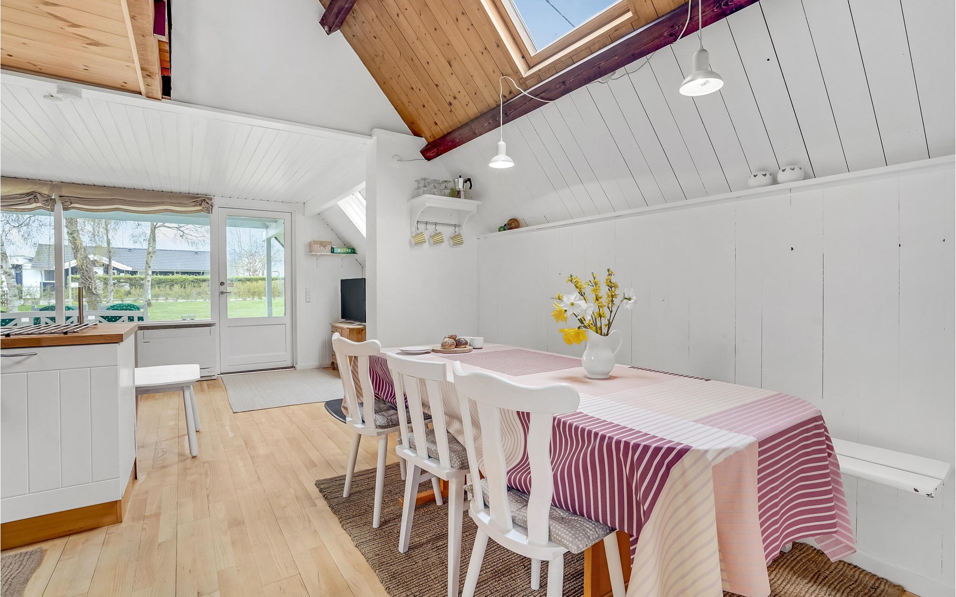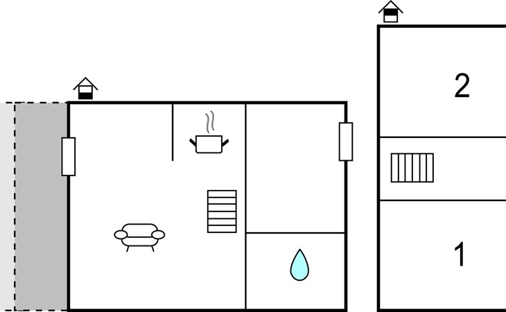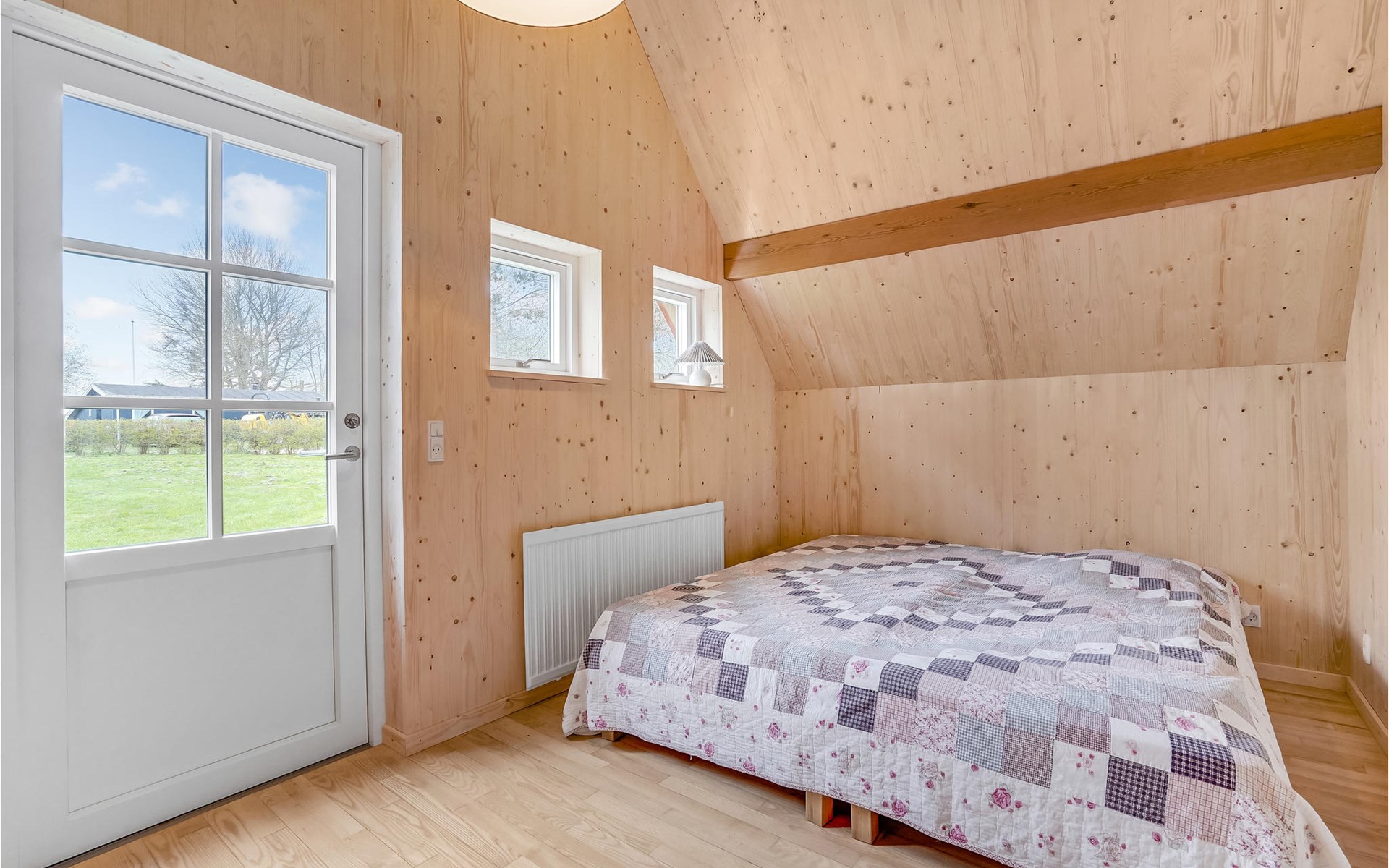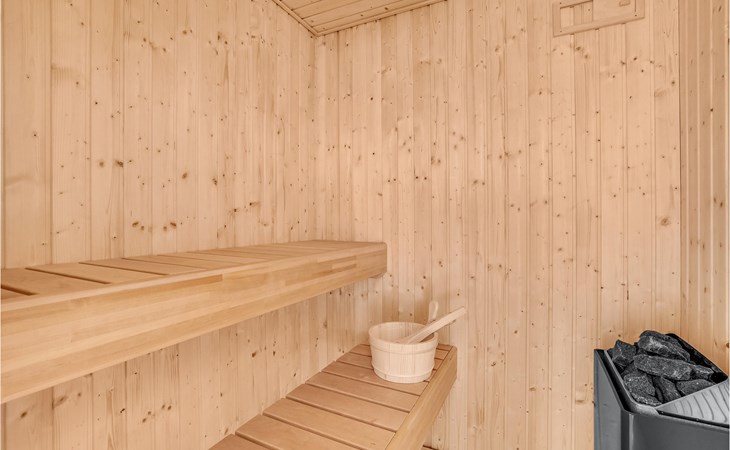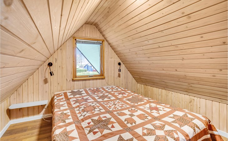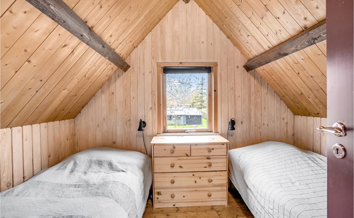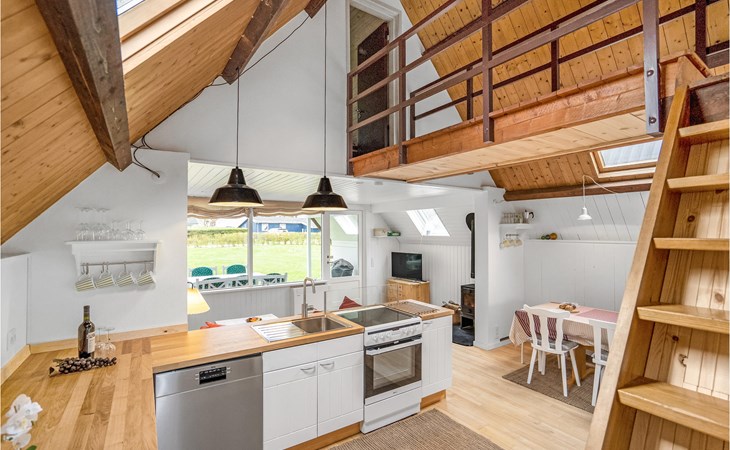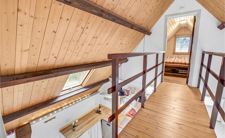 Küche, Essplatz und Wohnzimmer liegen in offener Verbindung. Im Wohnraum steht ein Kaminofen, der an kühlen Abenden für Gemütlichkeit sorgt. Es gibt drei Schlafzimmer, wovon 2 in den Giebelzimmern liegen, die durch eine Brücke miteinander verbunden sind. Das große Schlafzimmer befindet sich im kleineren Nebengebäude mit direktem Zugang zum Garten. Das Haus verfügt außerdem über eine Sauna. WLAN ist natürlich auch vorhanden.