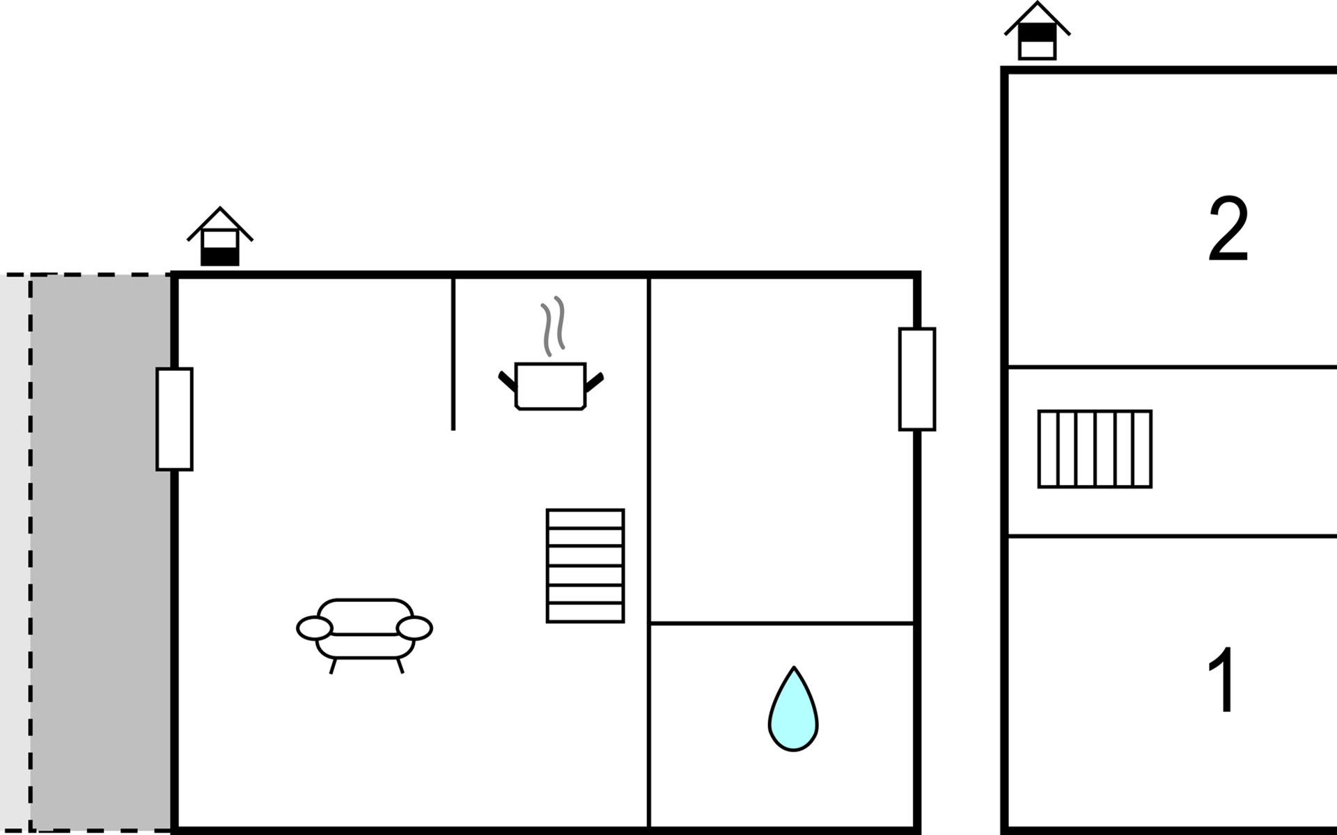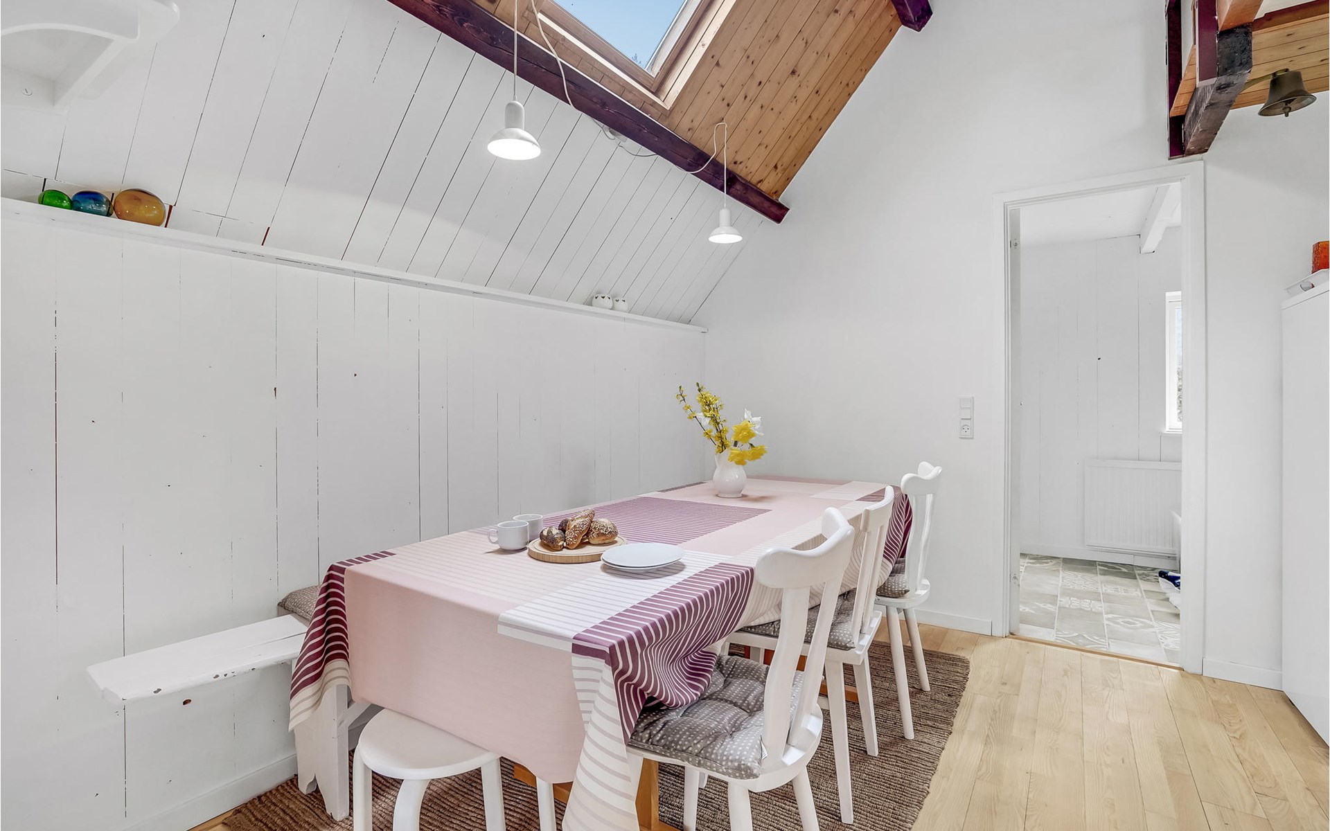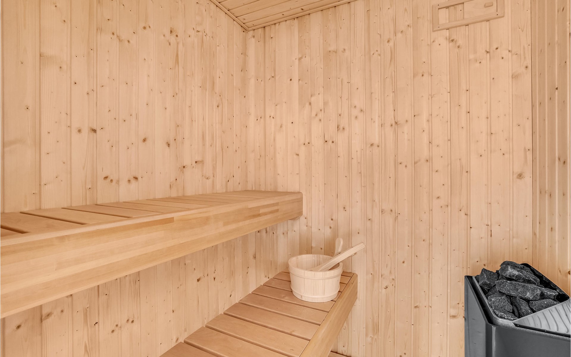 Küche, Essplatz und Wohnzimmer liegen in offener Verbindung. Im Wohnraum steht ein Kaminofen, der an kühlen Abenden für Gemütlichkeit sorgt. Es gibt drei Schlafzimmer, wovon 2 in den Giebelzimmern liegen, die durch eine Brücke miteinander verbunden sind. Das große Schlafzimmer befindet sich im kleineren Nebengebäude mit direktem Zugang zum Garten. Das Haus verfügt außerdem über eine Sauna. WLAN ist natürlich auch vorhanden.