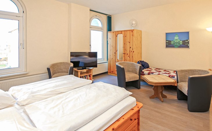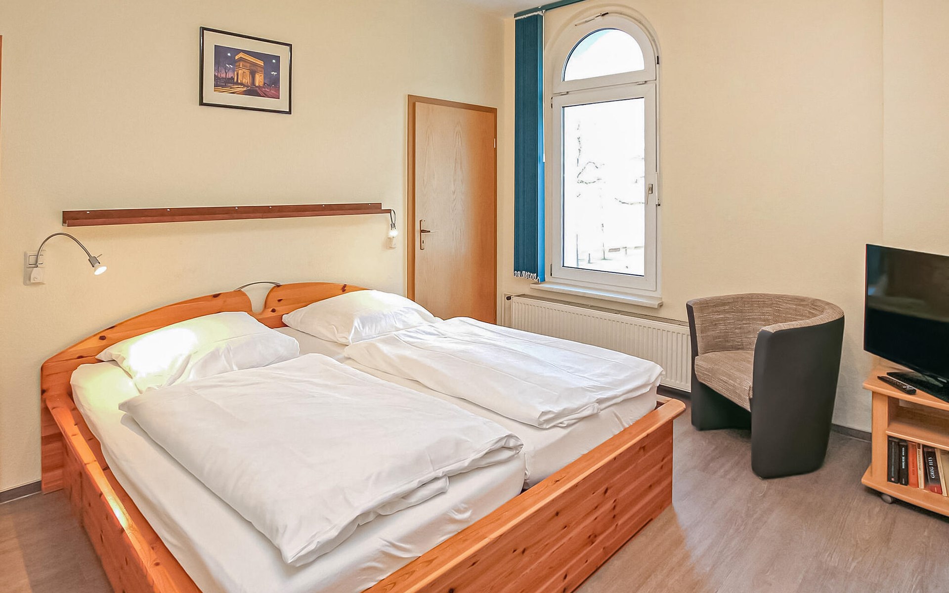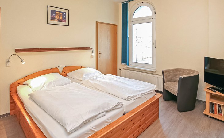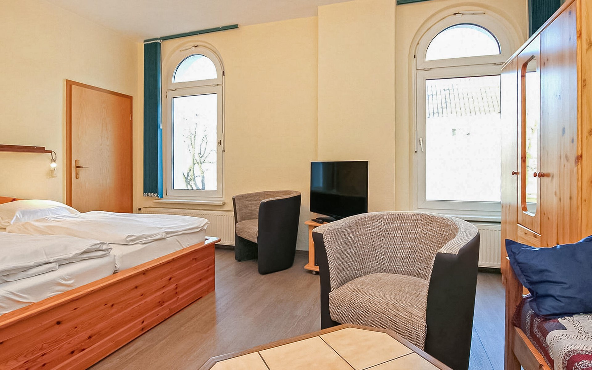 Am Rande der Altstadt von Waren (Müritz), zentral und dennoch ruhig gelegen, nur wenige Schritte vom Binnenland der Müritz entfernt, befinden sich in einer liebevoll renovierten Stadtvilla insgesamt drei Ferienwohnungen für bis zu drei oder fünf Personen. Der Hafen mit Boots- und Schiffsanlegestelle, Badestrand, Restaurants, Einkaufsmöglichkeiten und das Naturerlebniszentrum „Müritzeum“ sind fußläufig erreichbar. Die ca. 35qm große beheizte Wohnung ist für bis zu 2 Erwachsene und 1 Kind (max. 17 Jahre) ausgestattet ein kombinierter Wohn-/Schlafbereich (Sitzecke mit Sesseln, Flachbild-TV, 1 Doppelbett, 1 Einzelbett), eine Miniküche (Elektroherd, Minibackofen, Kühlschrank mit Gefrierfach, Essecke, diverse Küchengeräte) und ein Badezimmer (Dusche, WC, Fön). Von hier aus haben Sie einen seitlichen Blick auf die Müritz. Gartenmöbel, eine Liegewiese mit Sonnenliegen und ein Grillplatz stehen allen Gästen auf dem Grundstück zur Verfügung. Räucherofen, Fahrradabstellraum (abschließbar, auf dem Grundstück), ein Parkplatz pro Wohnung (weiterer gegen Gebühr) und kostenfreies WLAN stehen zur Verfügung. Im Gesamtpreis sind Endreinigung, Bettwäsche, Handtücher sowie Wasser- und Energieverbrauch enthalten. (Bettwäsche für Babys bitte selbst mitbringen.) Vor Ort zu zahlen: Kurtaxe, ggf. Parkplatz 5 EUR/Tag.