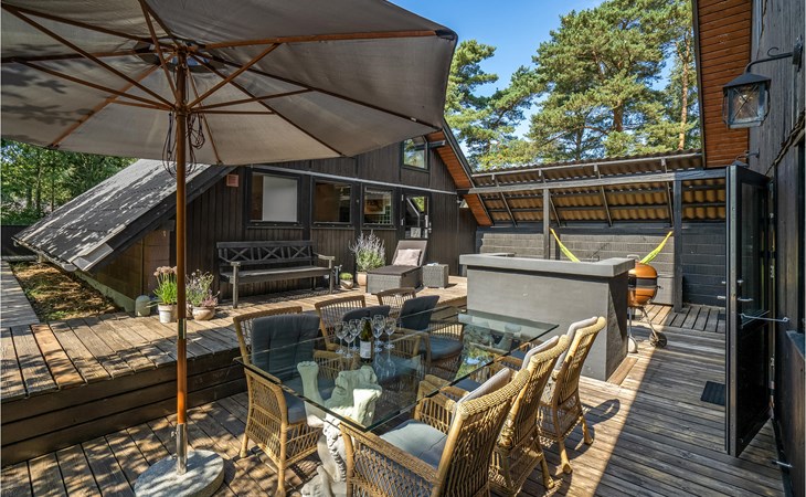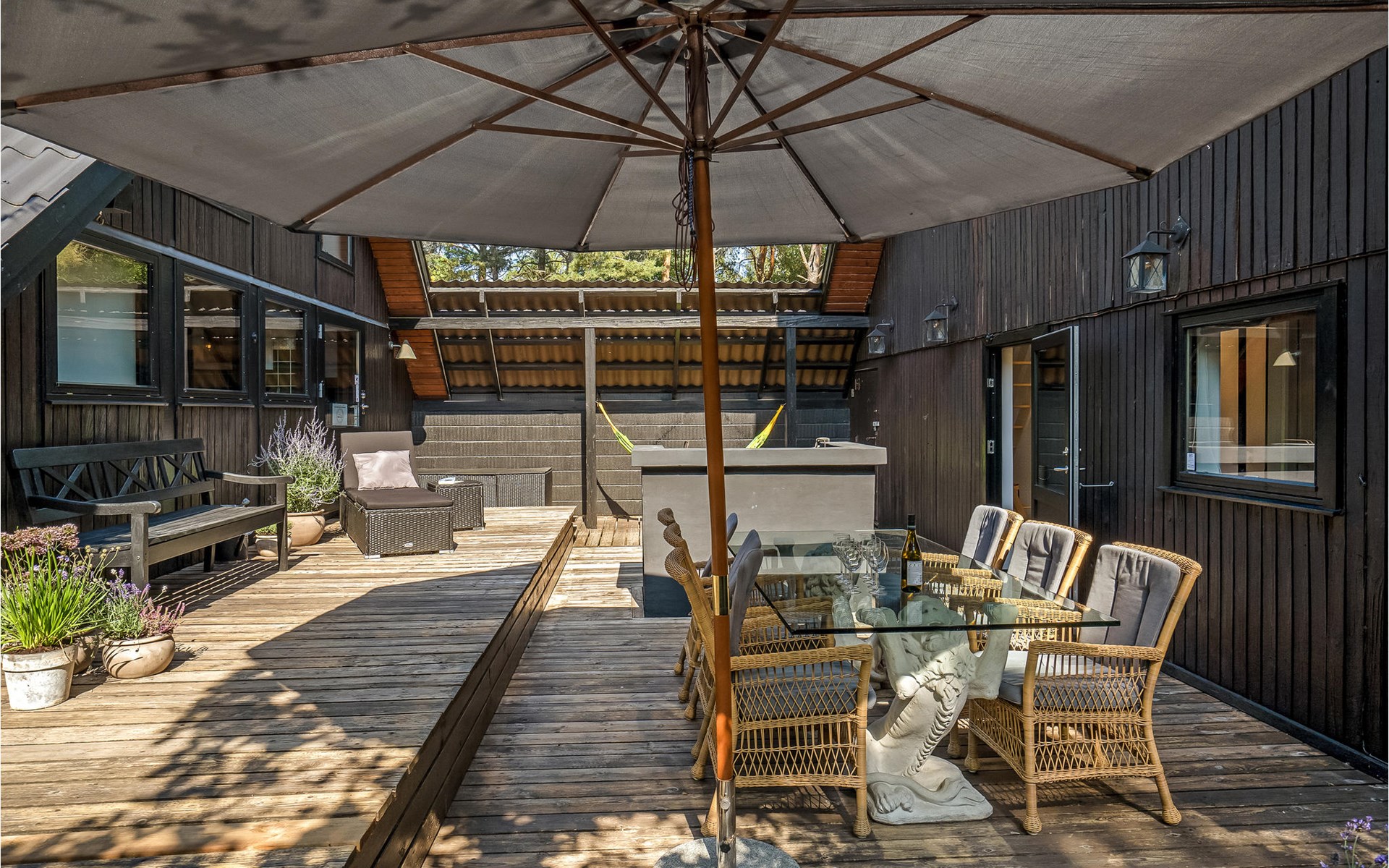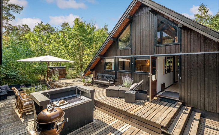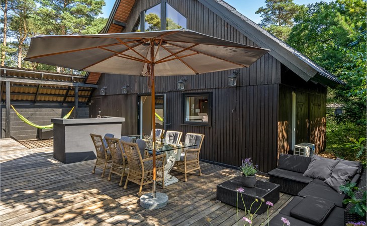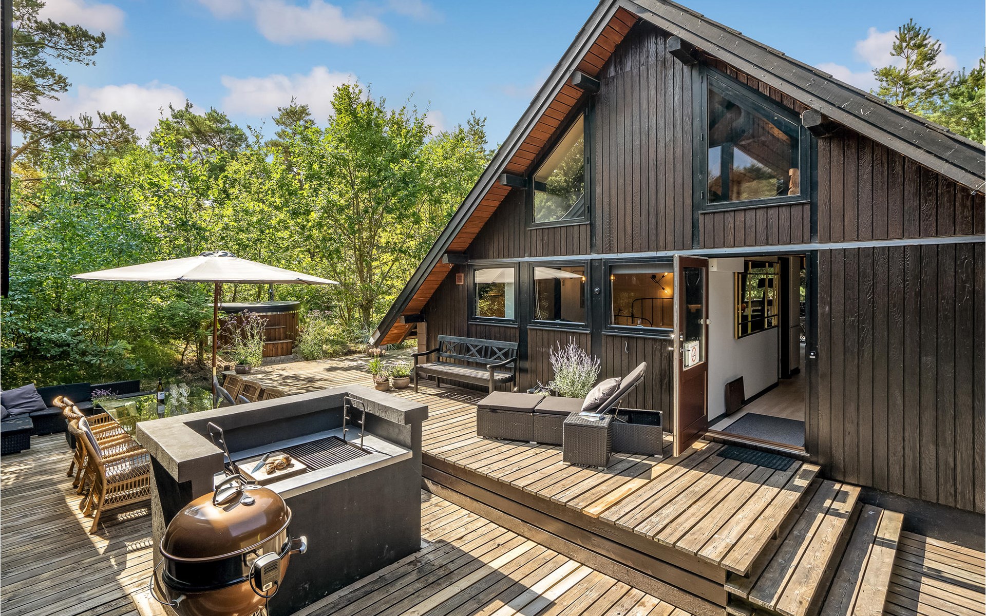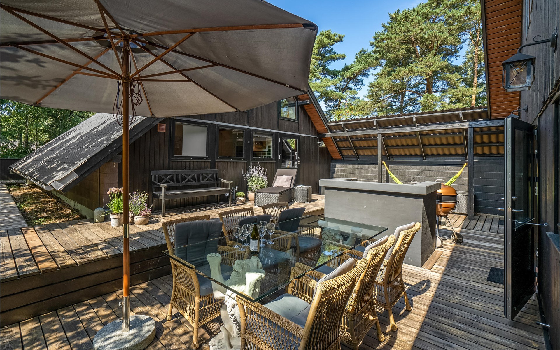 Charmantes Ferienhaus. Das Haus liegt in der Nähe von Gudmindrup Strand, einem der schönsten Strände an der Küste, der kinderfreundlich und mit Dünen ist. Das Haupthaus besteht aus Badezimmer mit Badewanne, 1 Schlafzimmer mit Zugang zum privaten Badezimmer mit Dusche, schöne Küche Familienzimmer in offener Kombination mit dem Wohnzimmer, über eine Treppe Zugang zum Fernsehzimmer. Vom Wohnzimmer Zugang zur offenen und überdachten Terrasse. Das Haus ist durch ein Nebengebäude mit einer schönen offenen Terrasse verbunden, auf der Sie viele Stunden mit angenehmen Grillabenden verbringen können. Genießen Sie nach einem Aufenthalt im finnischen Holzbad eine herrliche Abkühlung im kalten Tauchbecken.