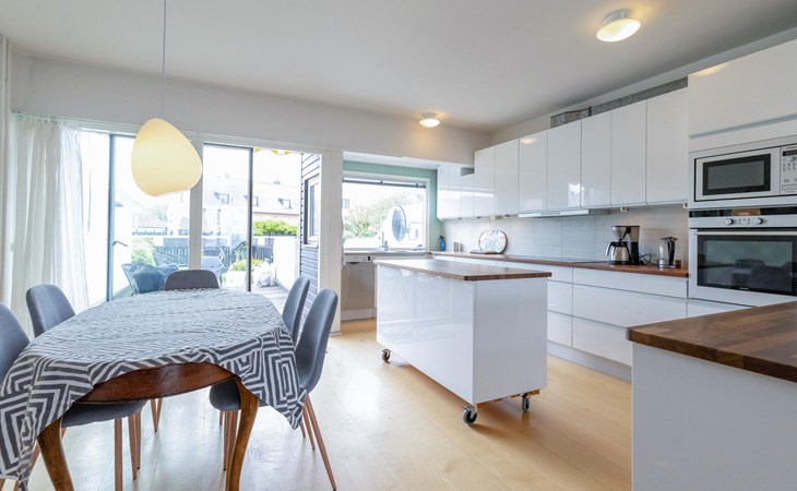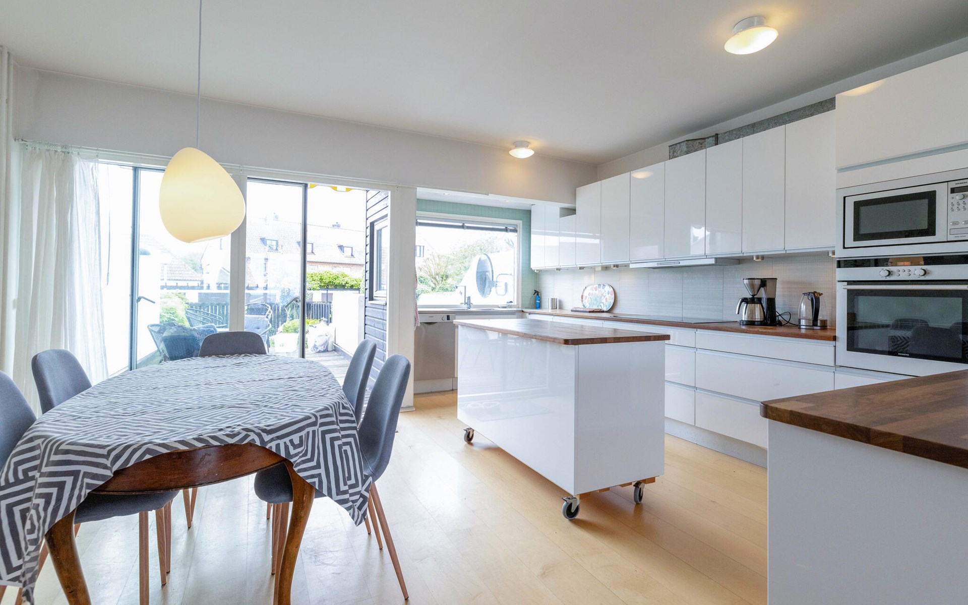 Ihr Ferienhaus bietet Ihnen eine stilvolle und gemütliche Einrichtung, die Sie sofort willkommen heißt. Genießen Sie Ihr Frühstück in der großzügigen Küche, die mit allem ausgestattet ist, was Sie für einen komfortablen Aufenthalt benötigen. Der Esstisch lädt zu gemeinsamen Mahlzeiten ein, und die offene Gestaltung der Räume sorgt für eine helle und freundliche Atmosphäre. Machen Sie es sich im Wohnbereich gemütlich. Hier finden Sie eine kuschelige Sofalandschaft, wo Sie entspannte Stunden verbringen können. Ob beim Lesen eines Buches oder beim gemeinsamen Fernsehen, hier ist der ideale Ort, um die Seele baumeln zu lassen. Die großen Fenster bieten einen herrlichen Blick auf die Umgebung und lassen viel Licht in den Raum.