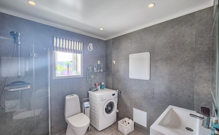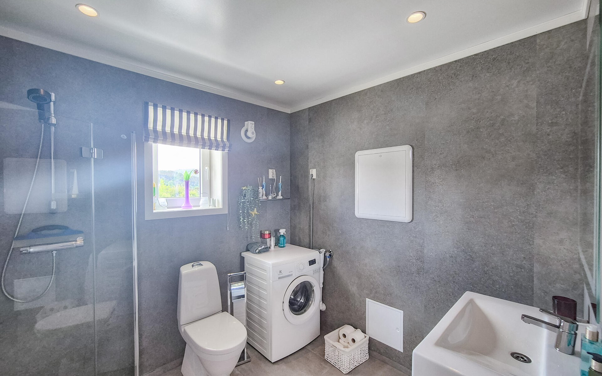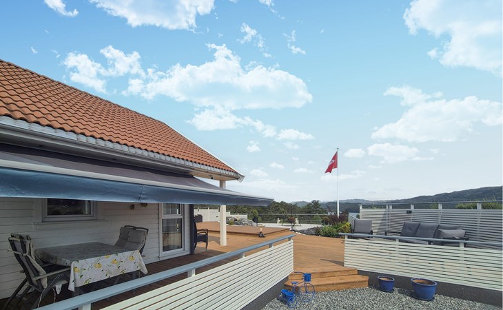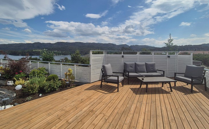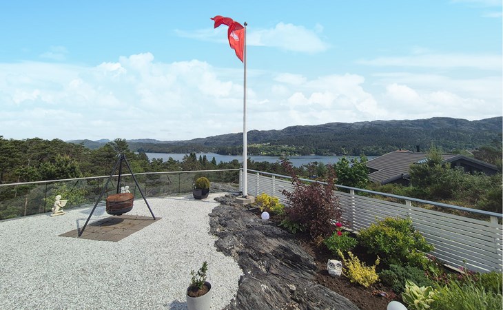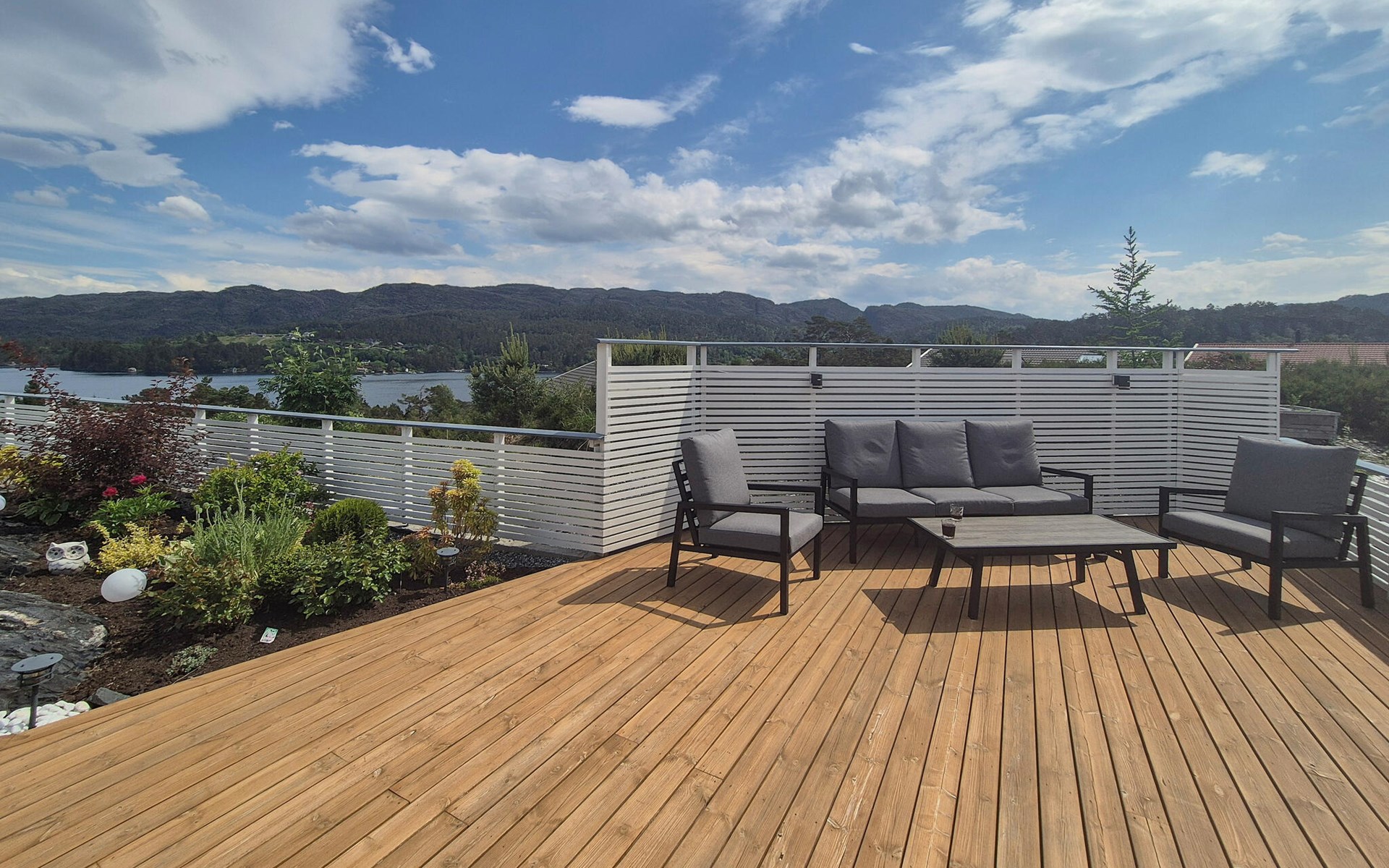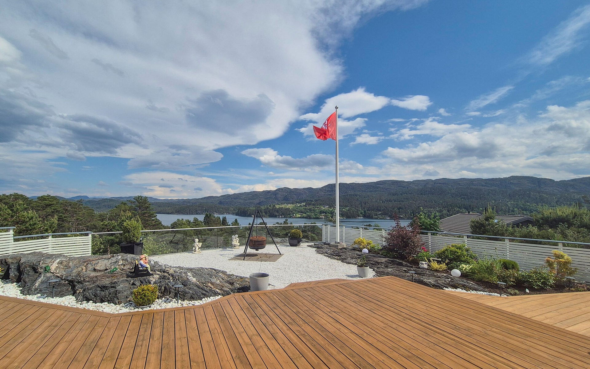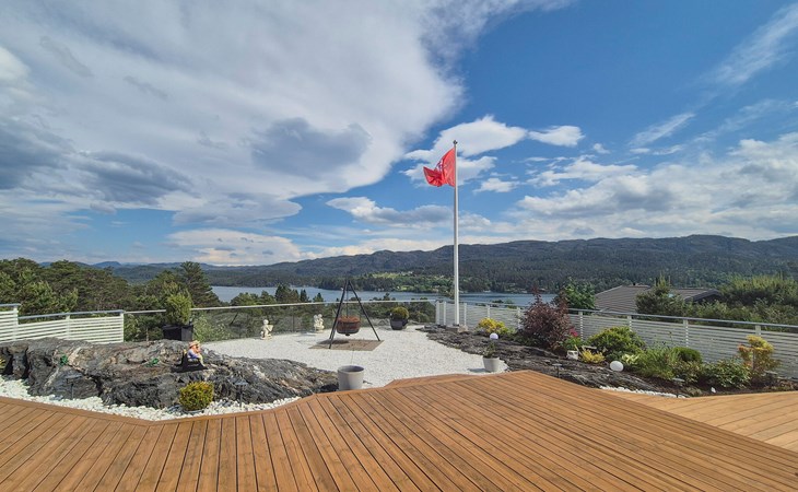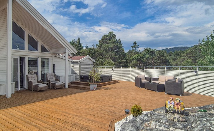 Genießen Sie Ihre Zeit auf der großen, teilweise überdachten Terrasse, ausgestattet mit komfortablen Gartenmöbeln und einem Grill – perfekt für gesellige Mahlzeiten im Freien. Genießen Sie die Aussicht vom Garten und erreichen nach einem kurzen Spaziergang den Fjord in malerischer Umgebung.
