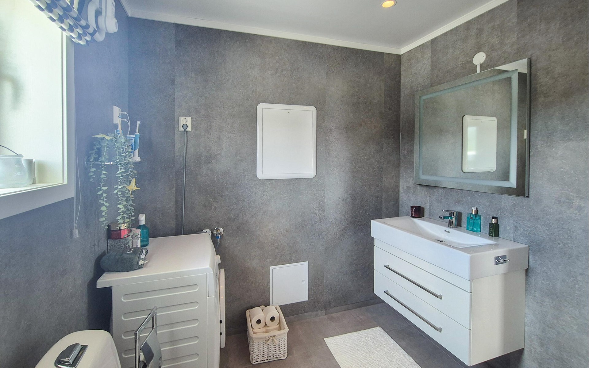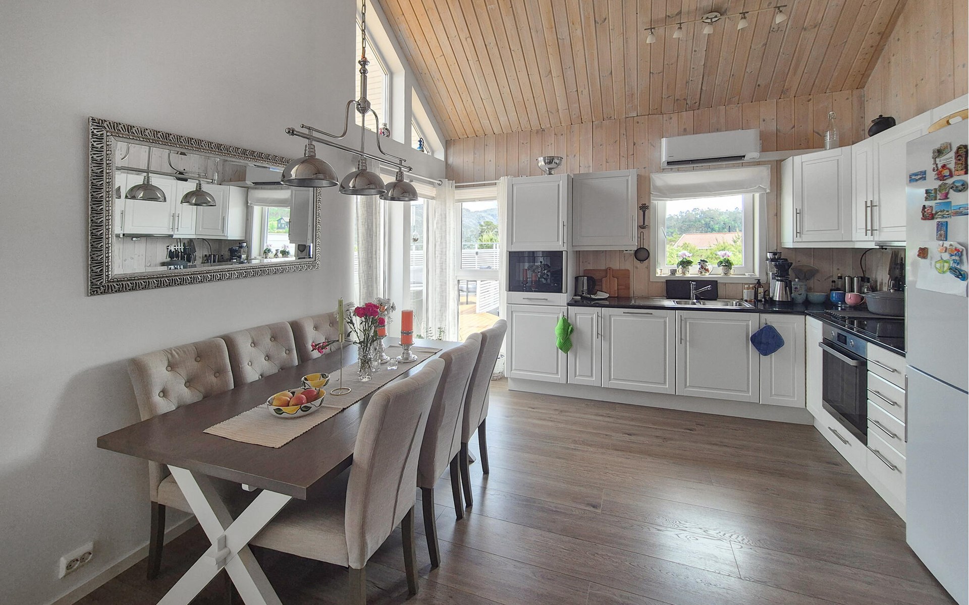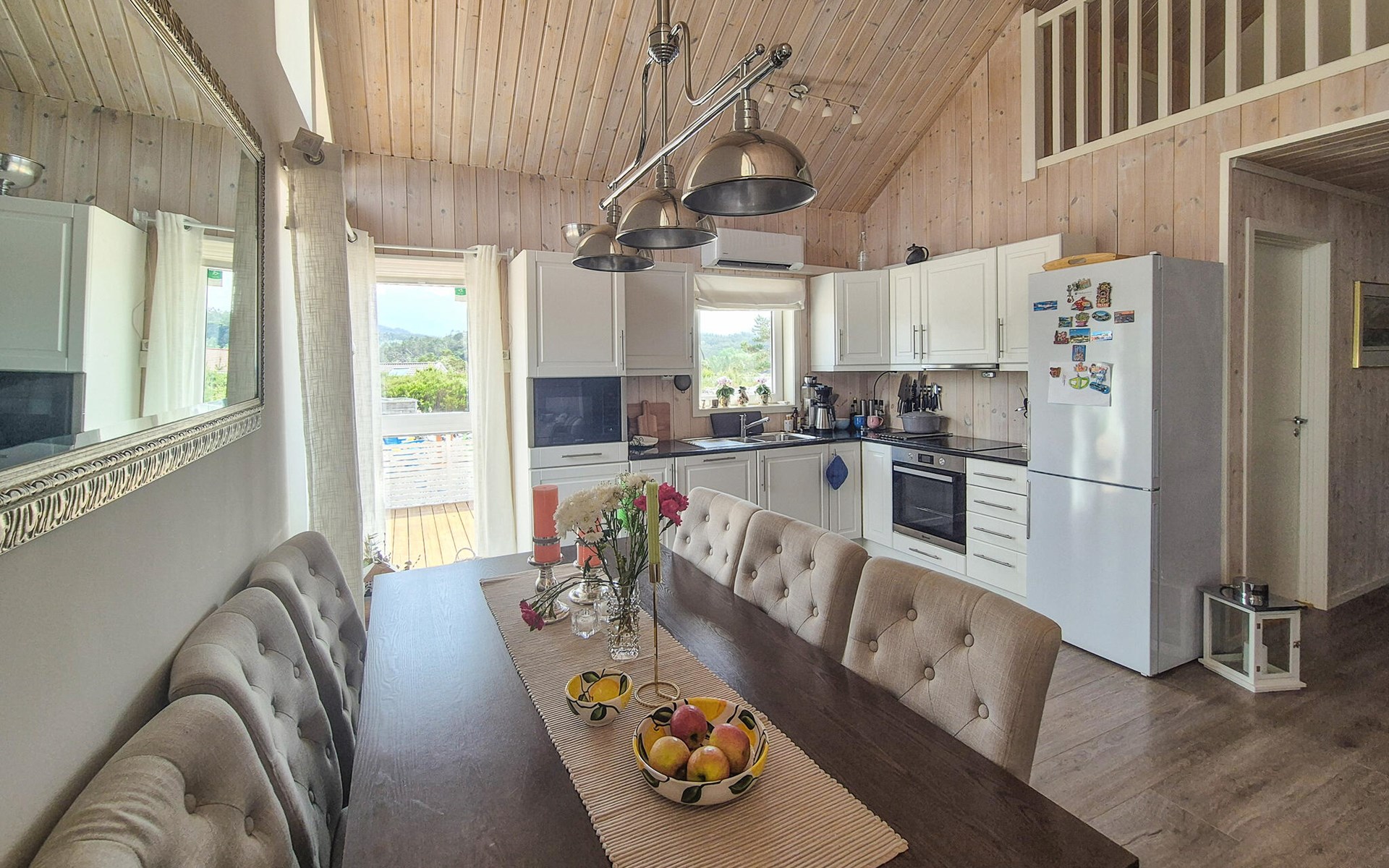 Willkommen in diesem gut ausgestatteten Ferienhaus in Nordtveitgrend, das sich durch seine herausragende Lage und den fantastischen Fjordblick auszeichnet. Die Innenräume sind gemütlich und geschmackvoll eingerichtet, perfekt für entspannte Abende nach einem Tag in der Natur. Nutzen Sie den offenen Wohnraum als Herz des Hauses, in dem Sie zum Kochen, Essen und Ausruhen zusammenkommen können. Von hier aus können Sie hinaus auf die Terrasse treten.
