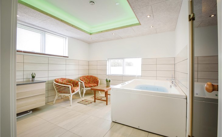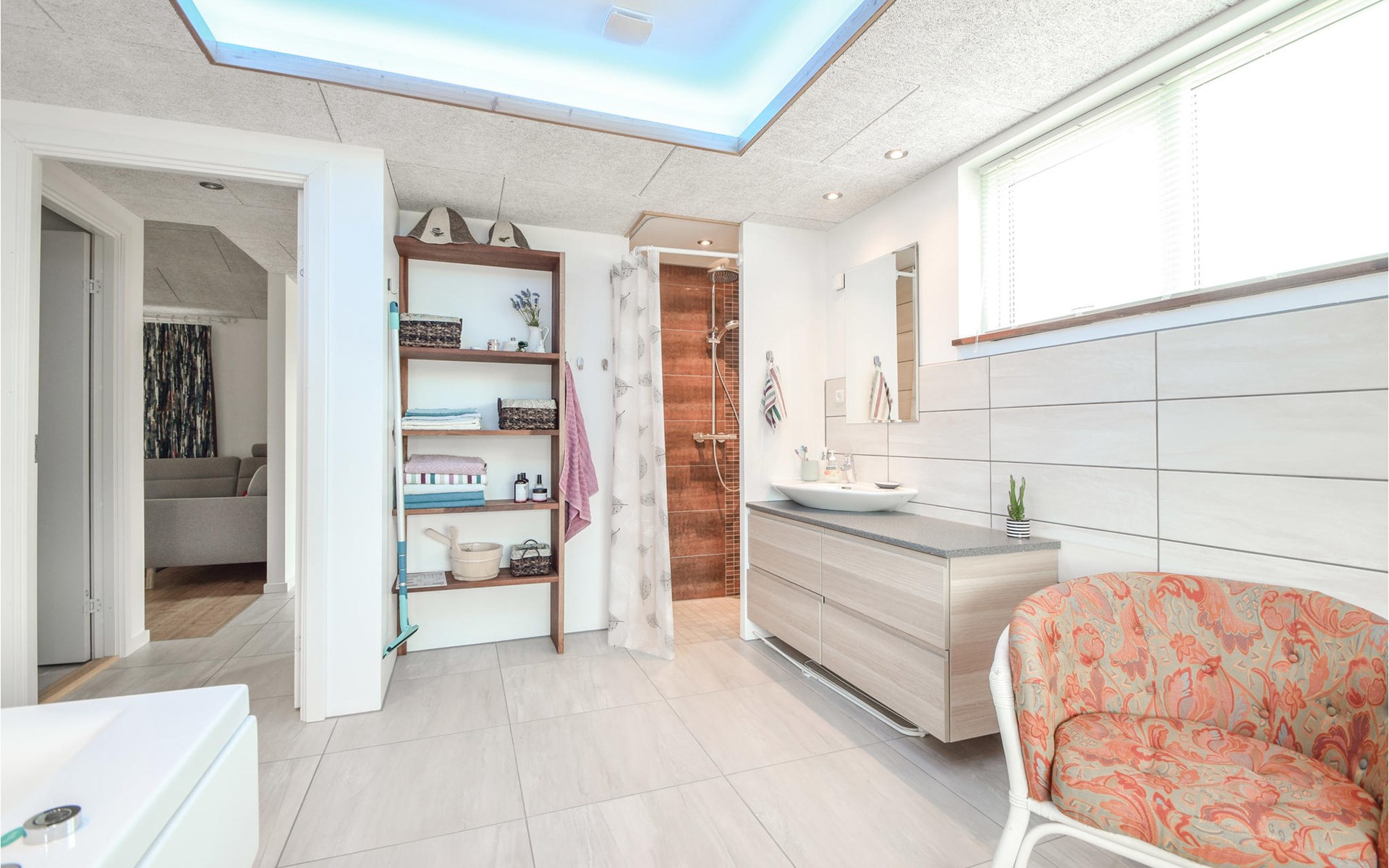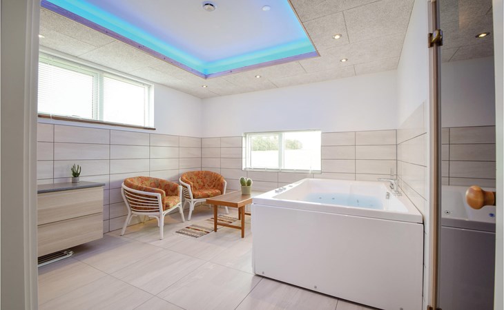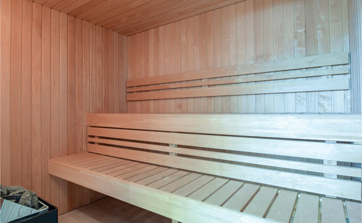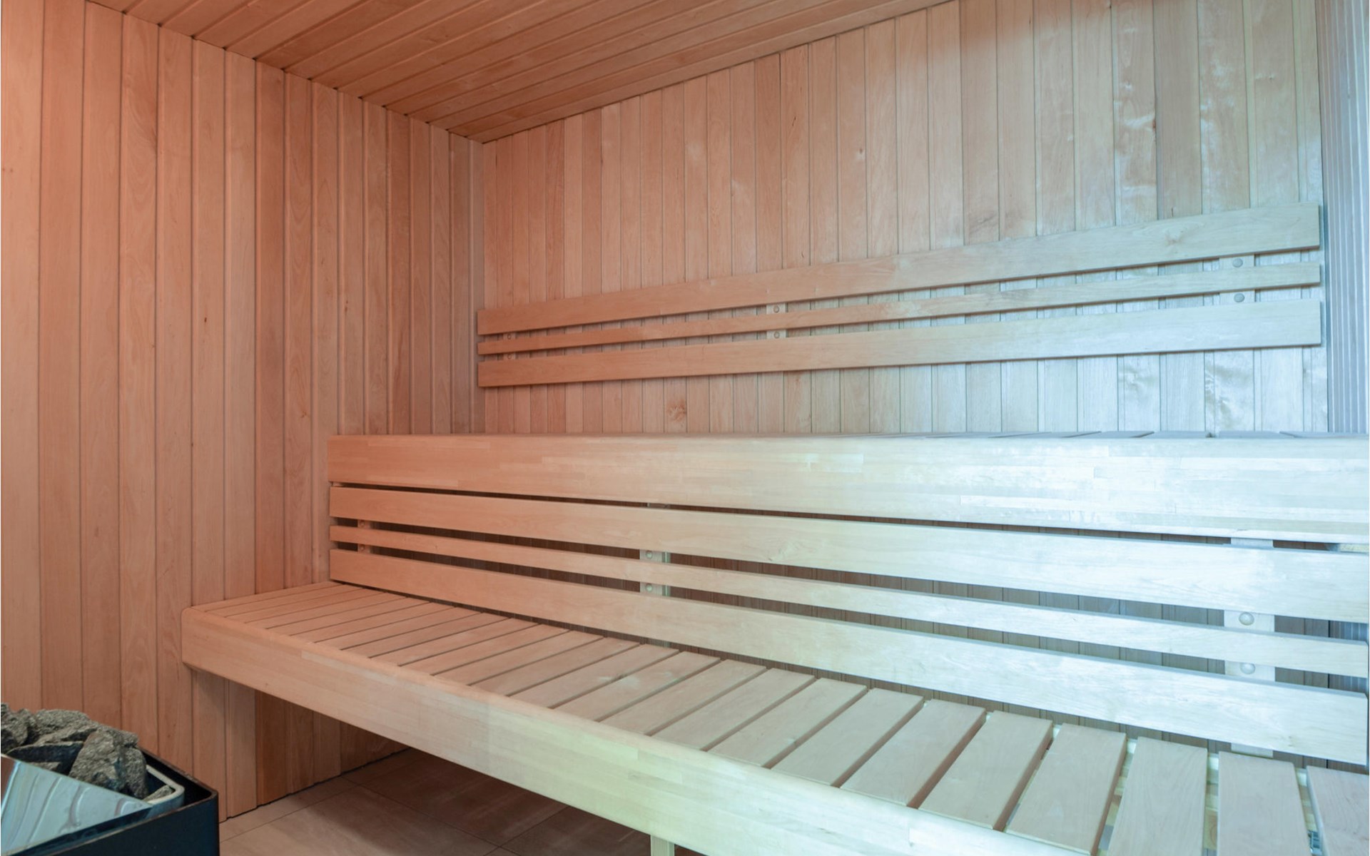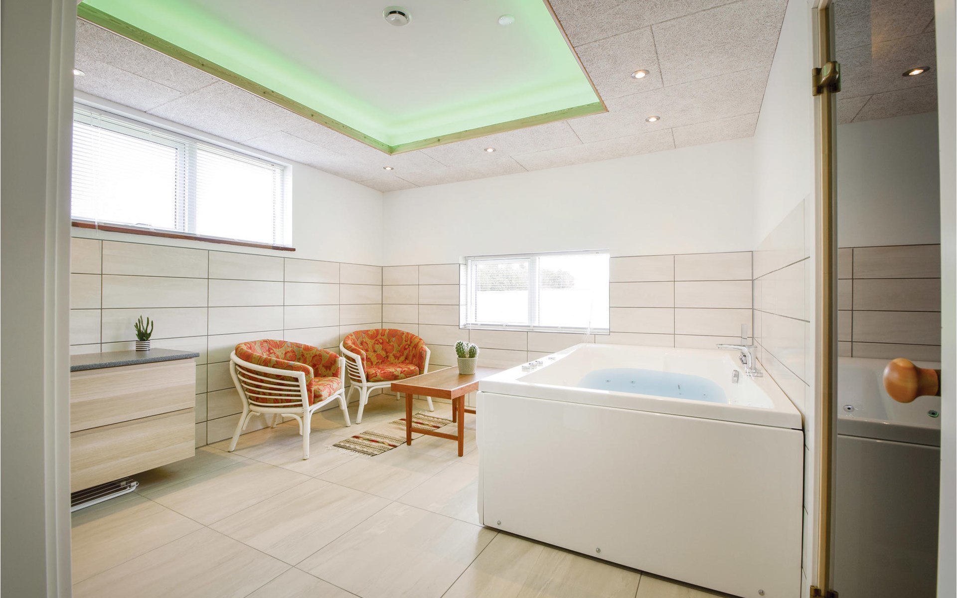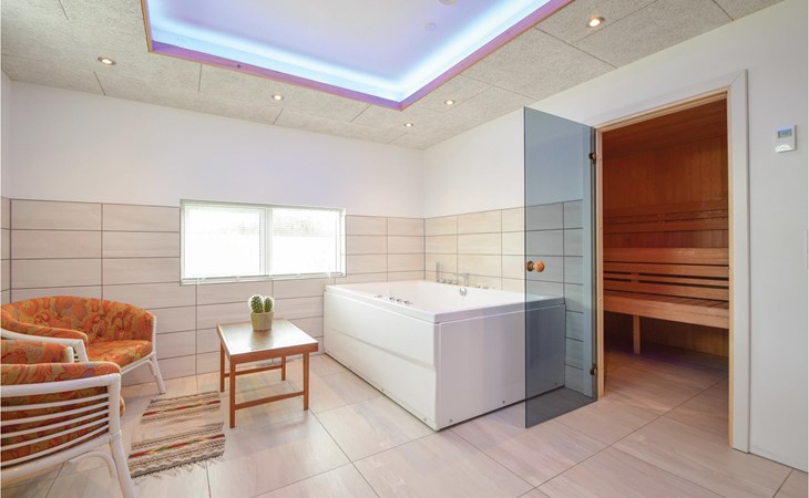 Das Wohnzimmer liegt in offener Verbindung zur modernen Küche. Es gibt insgesamt drei Badezimmer, von denen das eine eine echte Wellnessoase ist. Dort gibt es einen Jacuzzi, eine Sauna und die farbliche Beleuchtung hat eine beruhigende Wirkung.