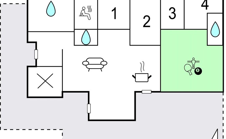 Der großzügig eingerichtete Wohnraum bietet sowohl Essplatz als auch Sitzecke. Es gibt schnelles WLAN und Apple TV, jedoch weder Sattelit- oder Kabelanschluss. Im großen Aktivitätsraum steht ein Air-Hockey-Spieltisch.