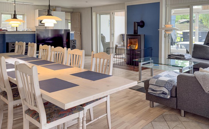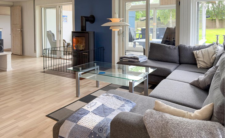 Betreten Sie den großzügigen Wohnbereich und machen Sie es sich auf der großzügigen Sofalandschaft bequem. Entspannen Sie vor dem Kaminofenfeuer und lassen Sie den Blick durch die großen Panoramafenster in den Garten schweifen. Nutzen Sie den langen Esstisch für gemeinsame Mahlzeiten oder gesellige Spieleabende. Kochen Sie in der praktisch ausgestatteten Küche mit viel Arbeitsfläche Ihre Lieblingsgerichte und fühlen Sie sich wie zu Hause.