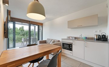 Dieses Studio befindet sich auf der ruhigen Landseite des Beach Resort Punt West. Sie blicken auf Rasenflächen, Spazierwege und Dünenvegetation. Hier hören Sie vor allem Vögel, den Wind und das leise Rascheln der Natur. Durch die Ausrichtung nach Westen genießen Sie auf Ihrer Terrasse die Abendsonne – ideal für ein Glas Wein und einen entspannten Tagesausklang.