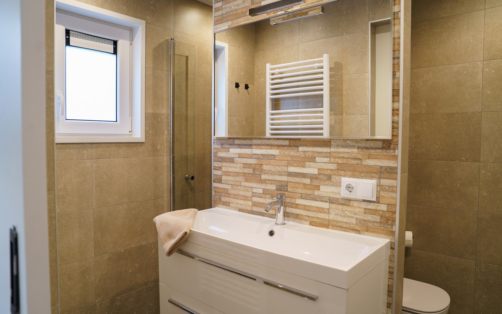 Fijn dat er een airco aanwezig is als bijverwarming. Bij aankomst was de temperatuur slechts 11 graden , met de airco voelde het al vrij snel warm.