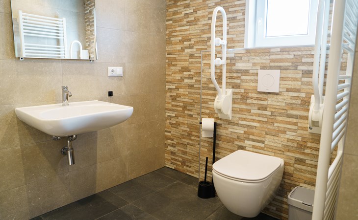 Verder is badkamer goed aangepast, maar slaapkamer zou standaard een hoog/laag bed moeten hebben. Ook in woonkamer een goede stoel plaatsen voor mindervalide waaruit goed op te staan is.