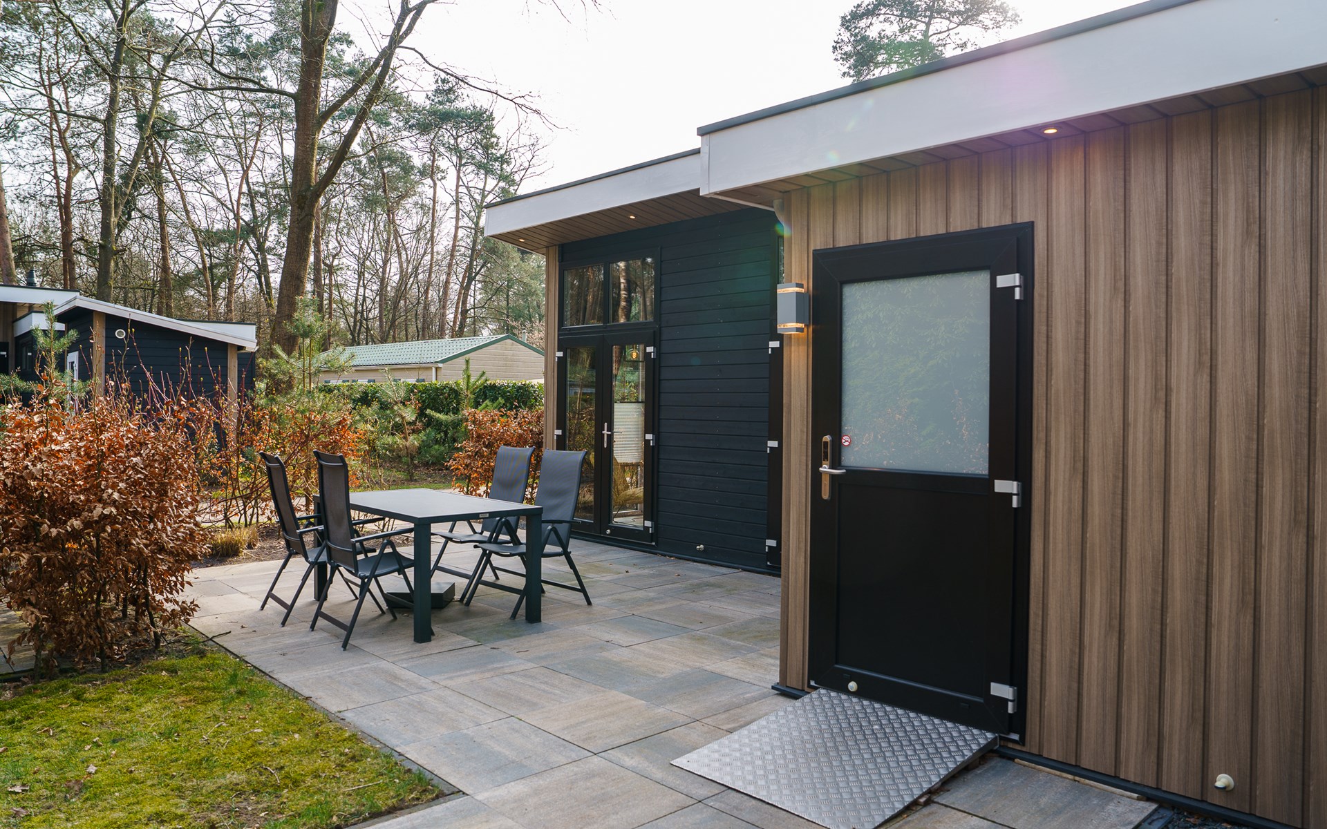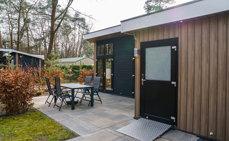 Onze MIVA woning. Binnen ruim voor rolstoelgebruik, en buiten rondom betegeld en bij de deur een oprijplaat gemonteerd zodat binnen- en buitengaan vrij eenvoudig is. Zelfs een losse oprijplaat in de berging voor bij de terrasdeuren, geweldig toch! Zo kunnen mindervalide mensen toch lekker genieten van hun vakantie.