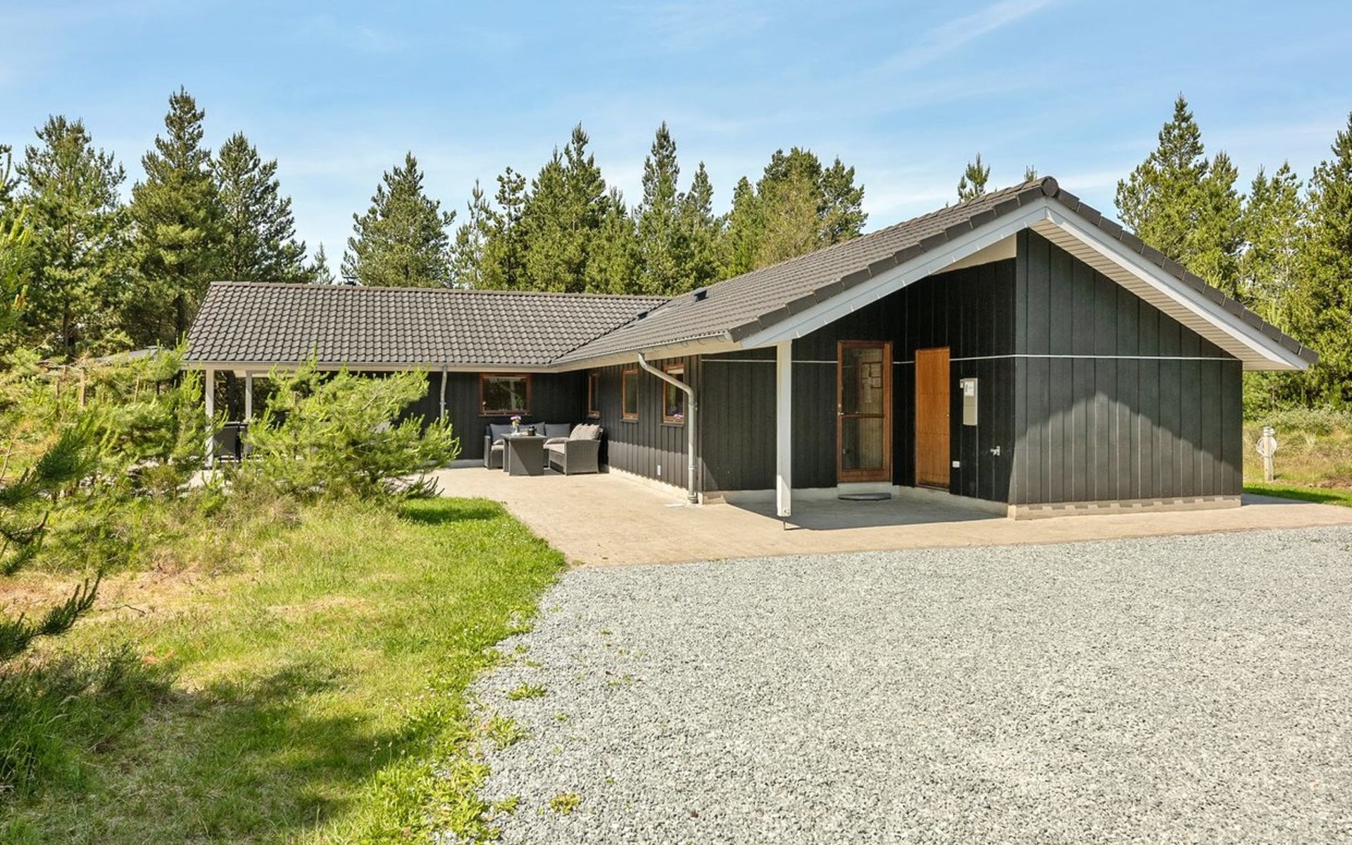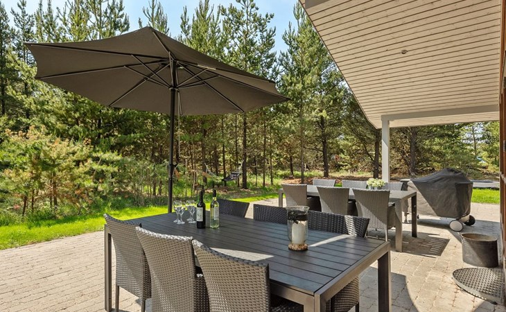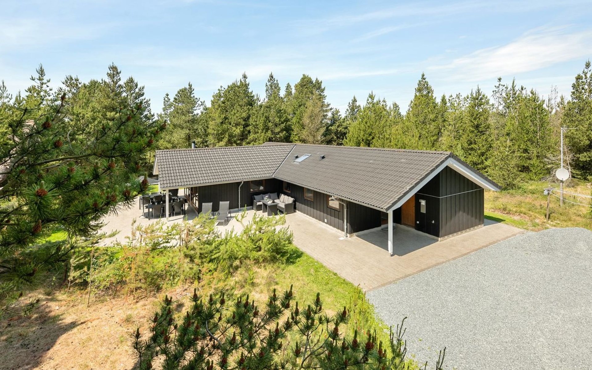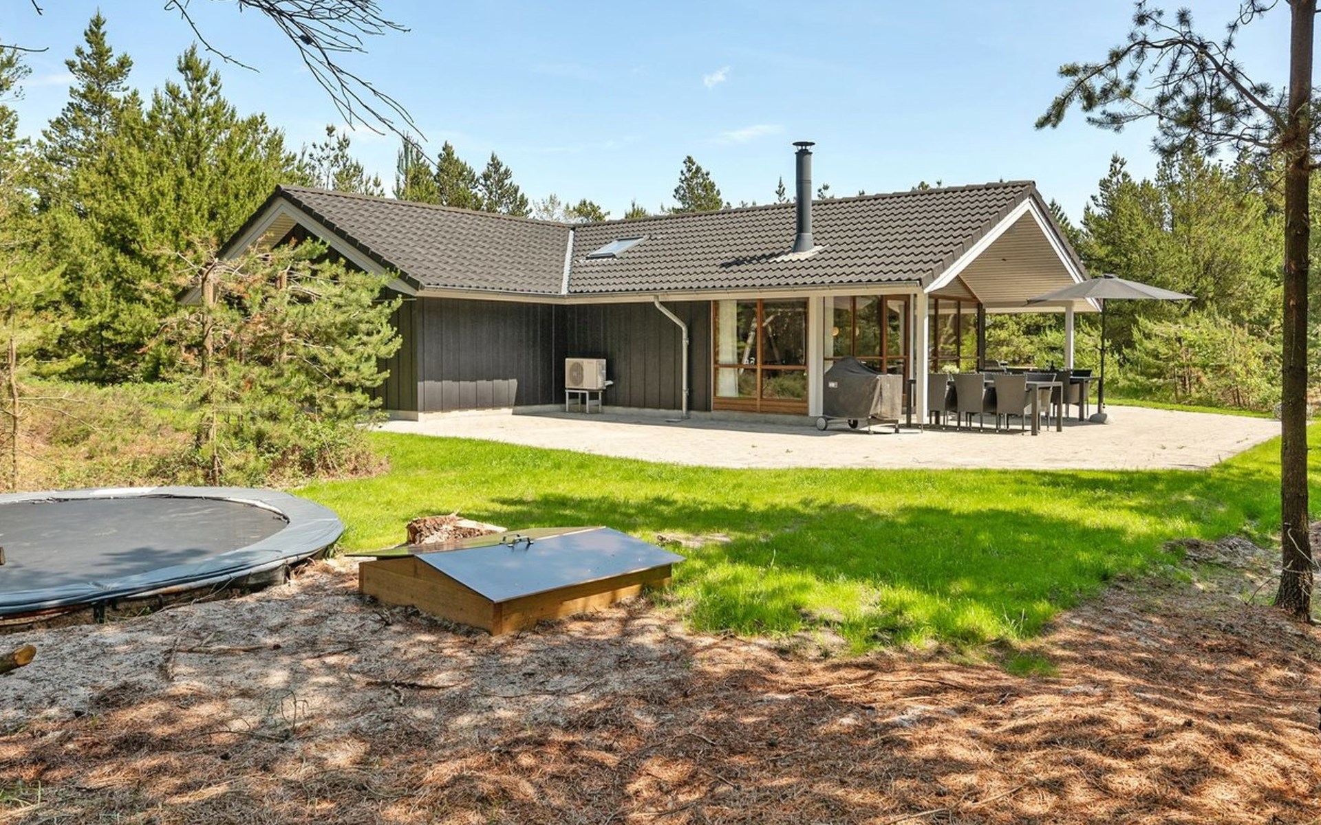 Einfamilienhaus, Baujahr 2006. 2.4 km vom Meer. Zur Alleinbenutzung: naturbelassenes Grundstück 3'300 m2. Terrasse (100 m2), Kinderspielplatz (Schaukel). Im Hause: Sauna, Trampolin, Waschmaschine, Wäschetrockner. Parkplatz beim Haus. E-Ladestation. Lebensmittelgeschäft 2 km. Der Besitzer akzeptiert keine Jugendgruppen.