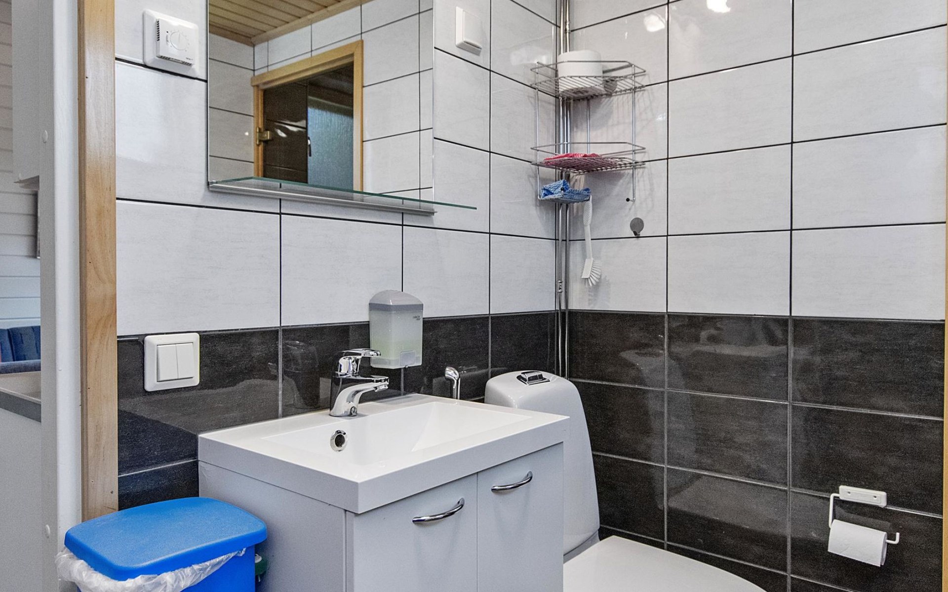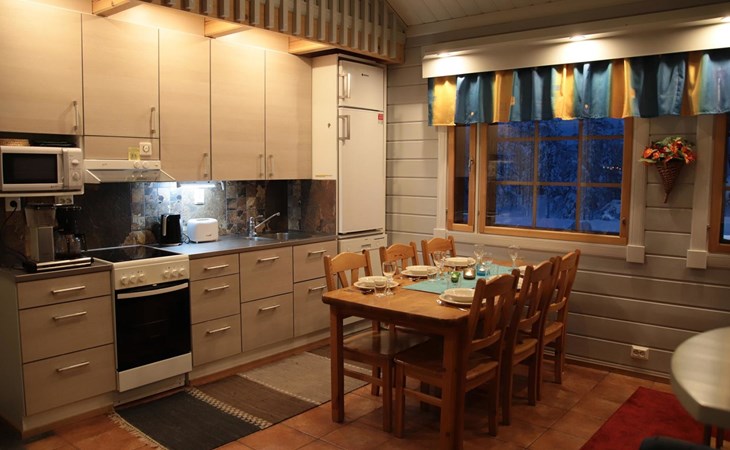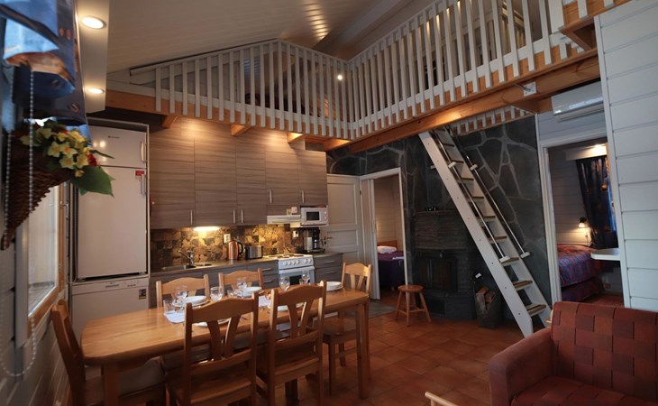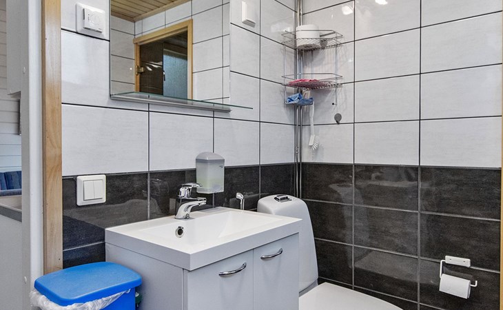 The 47-square-meter apartment has a kitchen/living room, 2 bedrooms, a low loft, a washroom/toilet and a sauna. A terrace and a cool ski maintenance room with a lubrication rack shared with the neighboring apartment. The apartment was renovated in 2017.