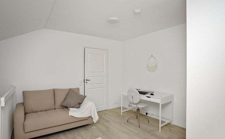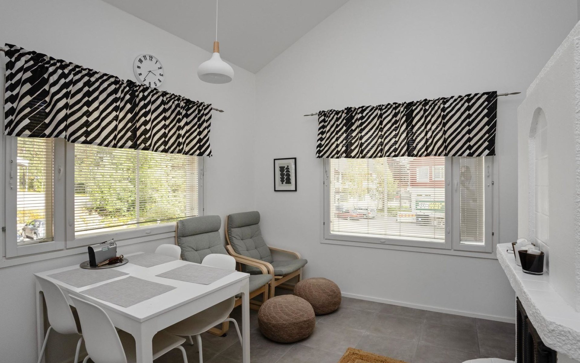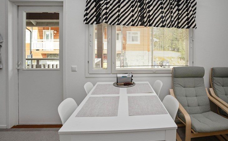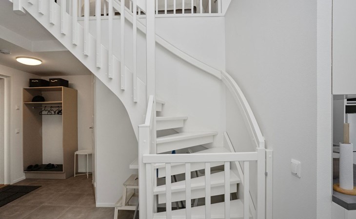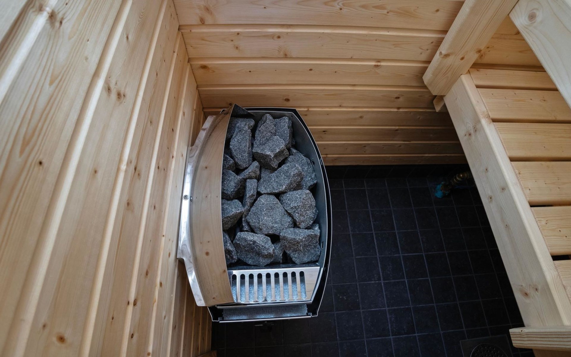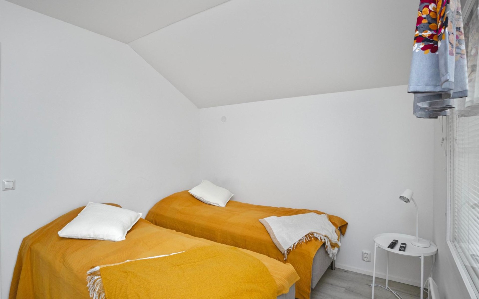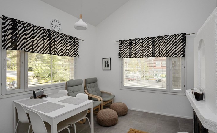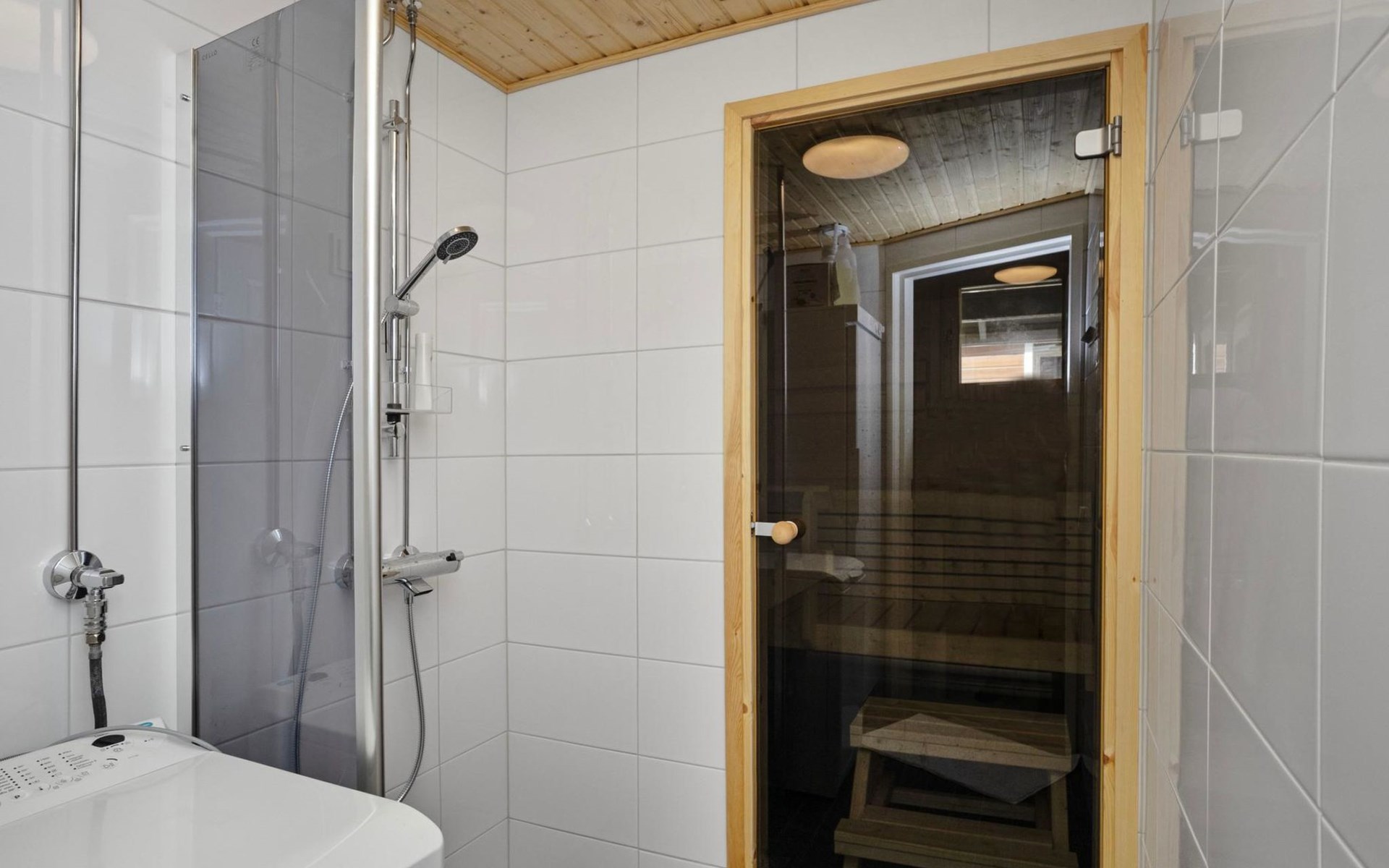 The living area and open-plan kitchen are cozy, with the atmosphere enhanced by a fireplace. The kitchen is well-equipped, and the dining table can be extended. The upstairs living area includes a workstation, so remote work is possible. The bathroom and sauna provide a great space for relaxation.
