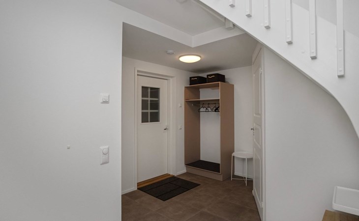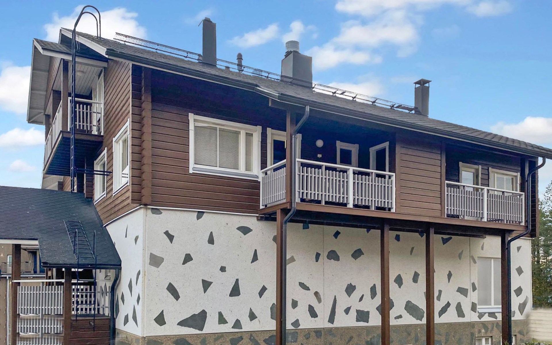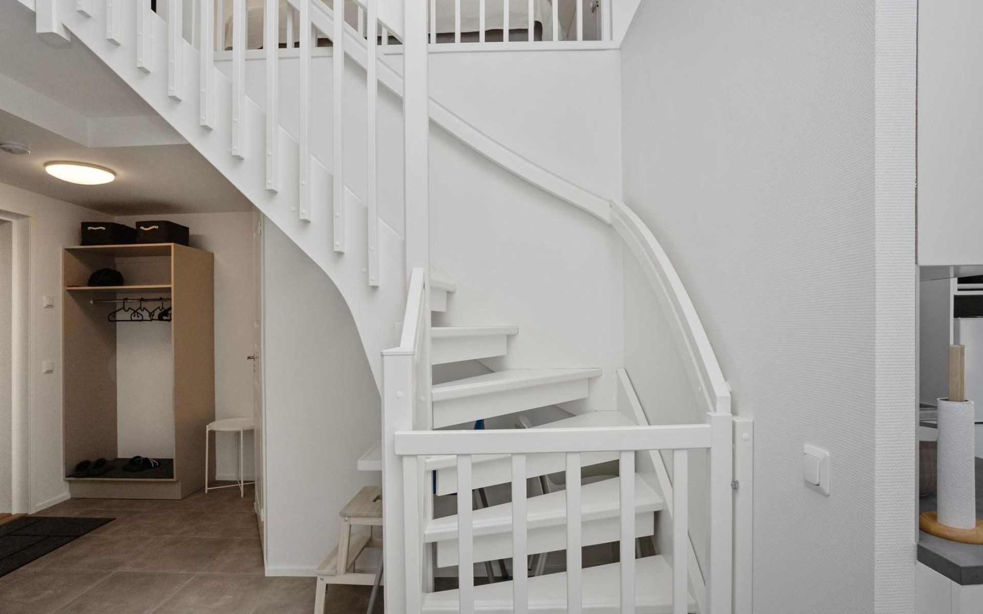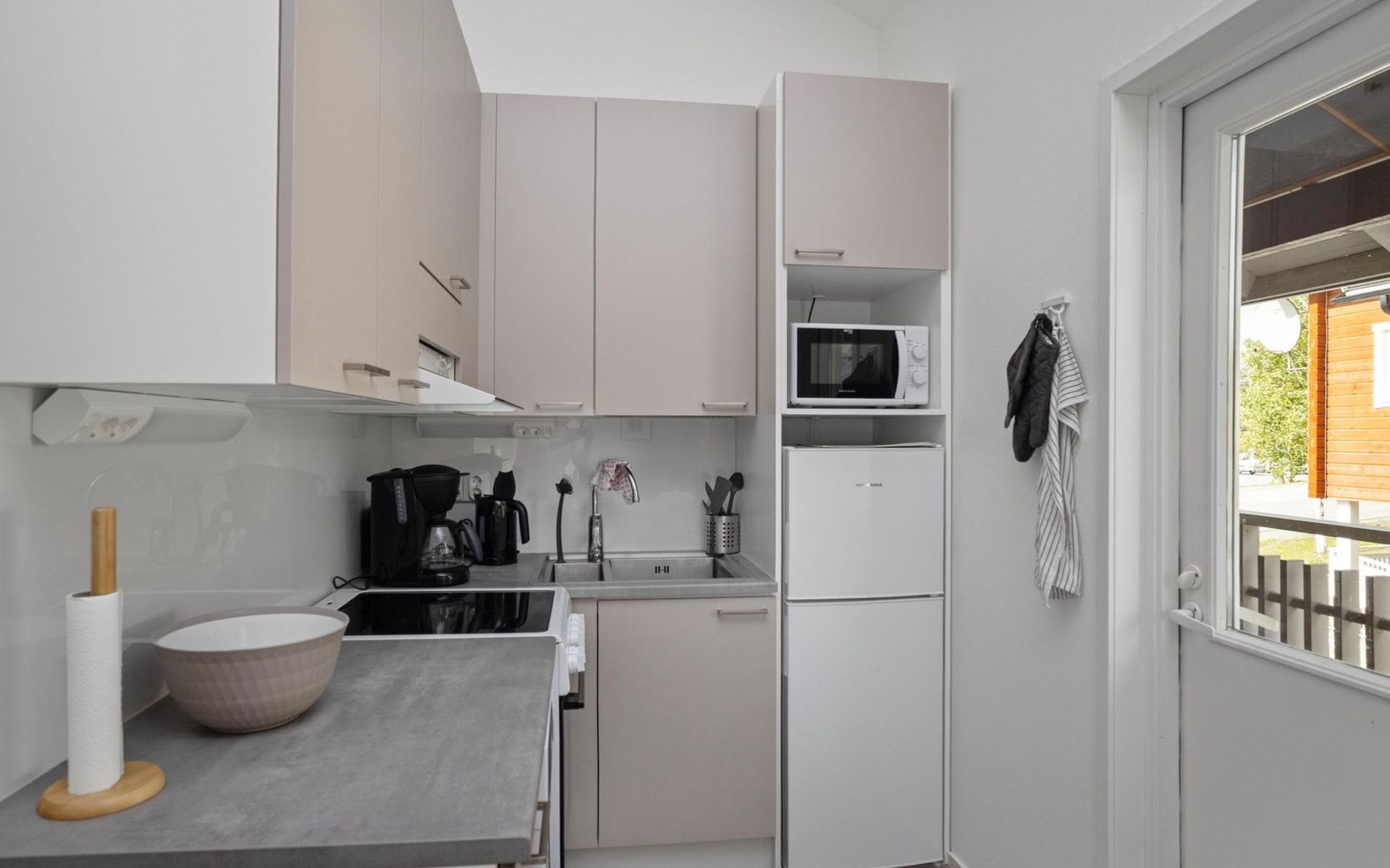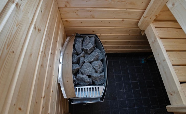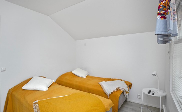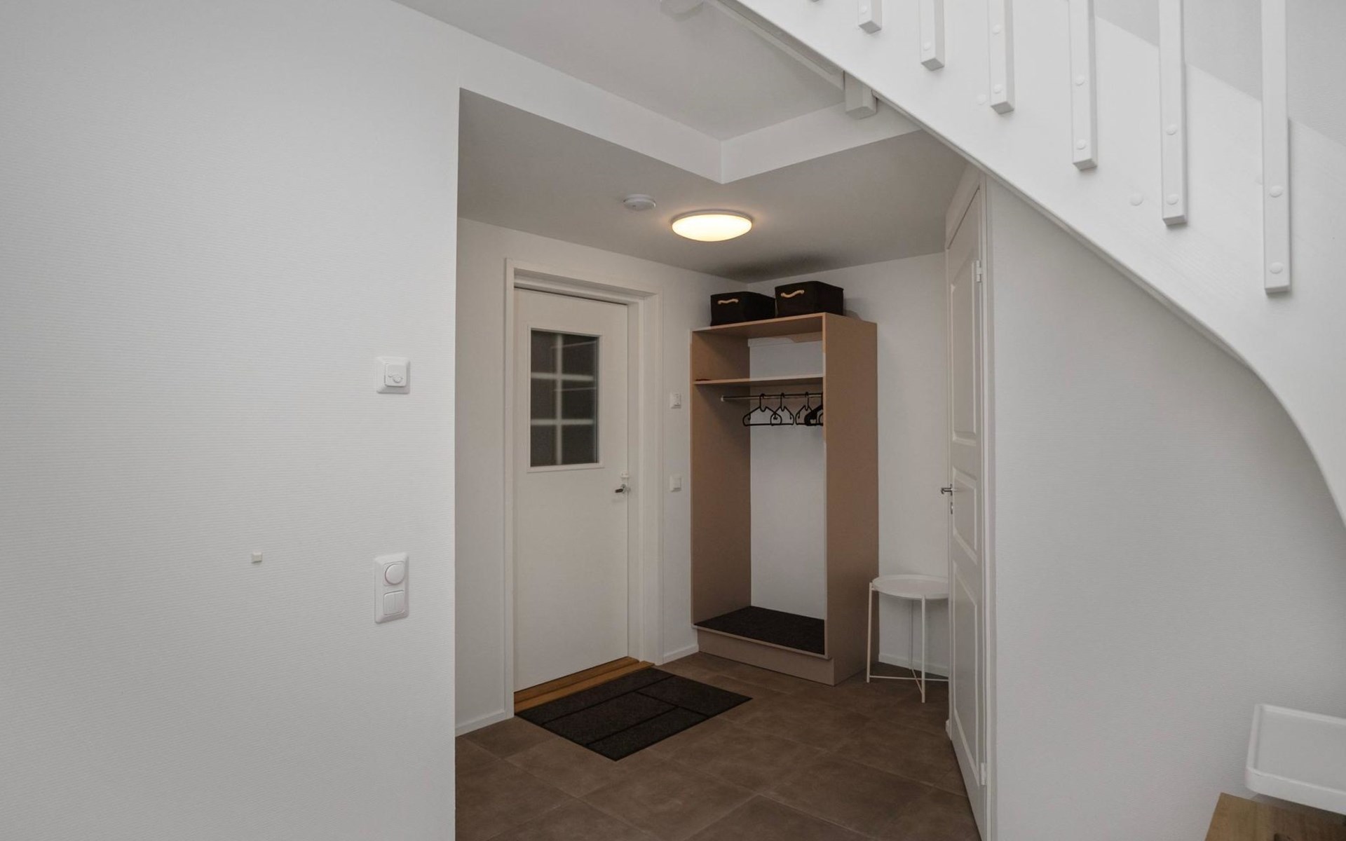 The living area and open-plan kitchen are cozy, with the atmosphere enhanced by a fireplace. The kitchen is well-equipped, and the dining table can be extended. The upstairs living area includes a workstation, so remote work is possible. The bathroom and sauna provide a great space for relaxation.