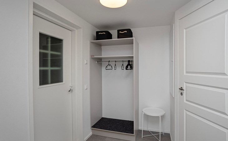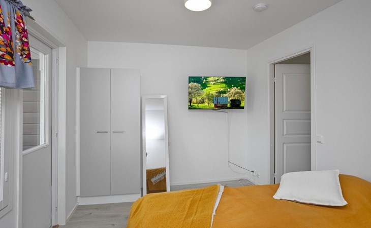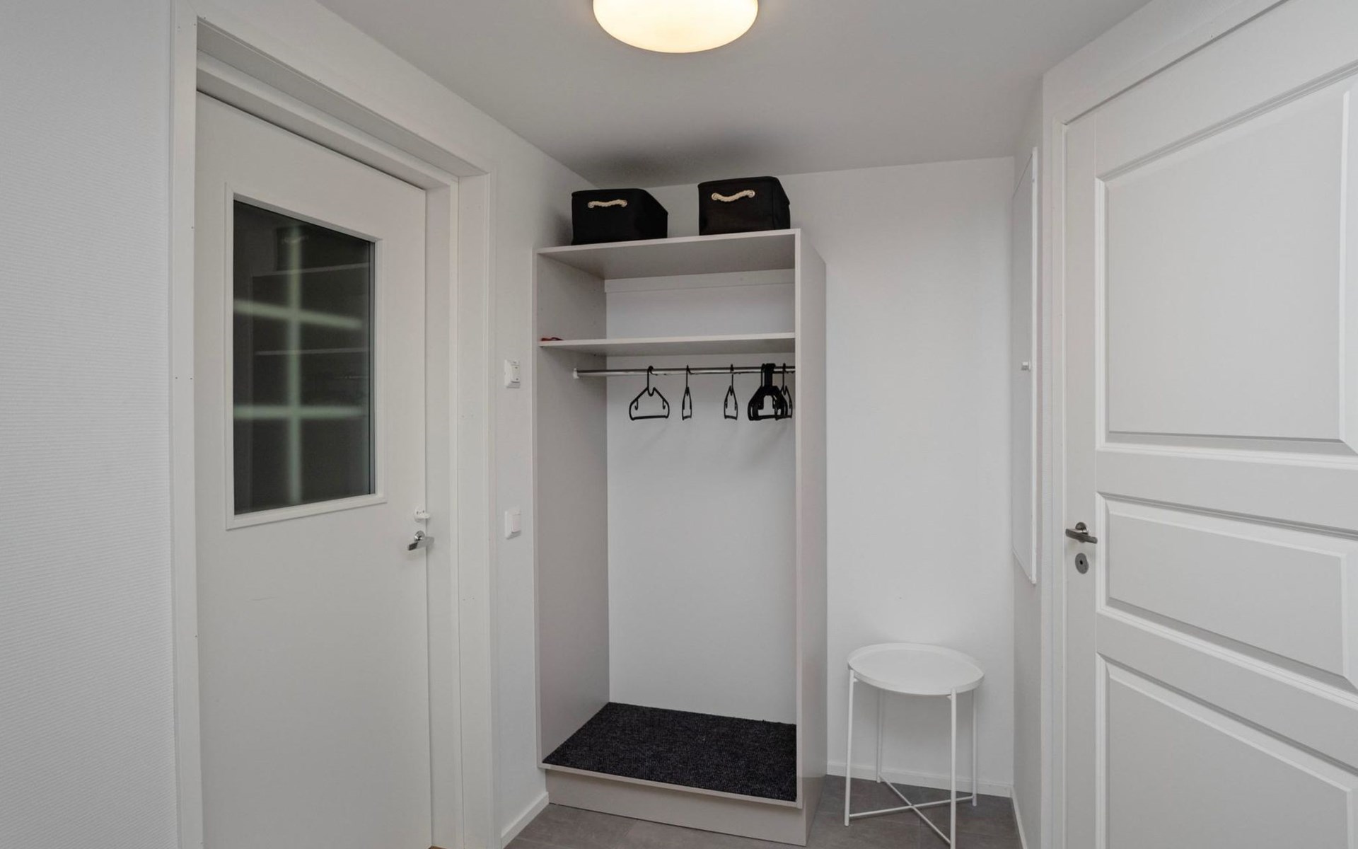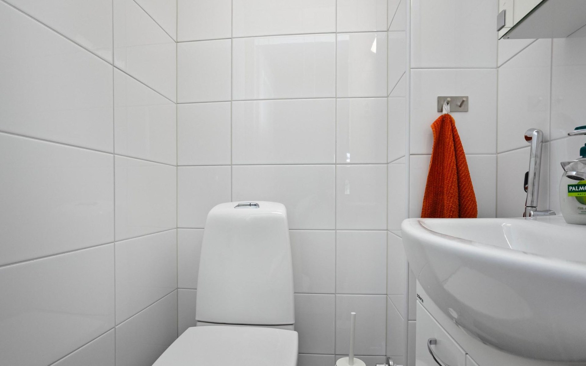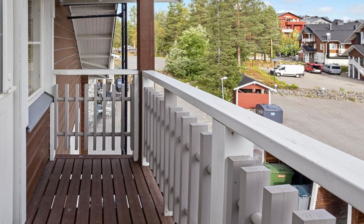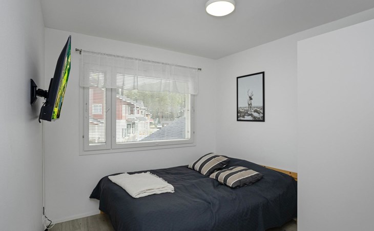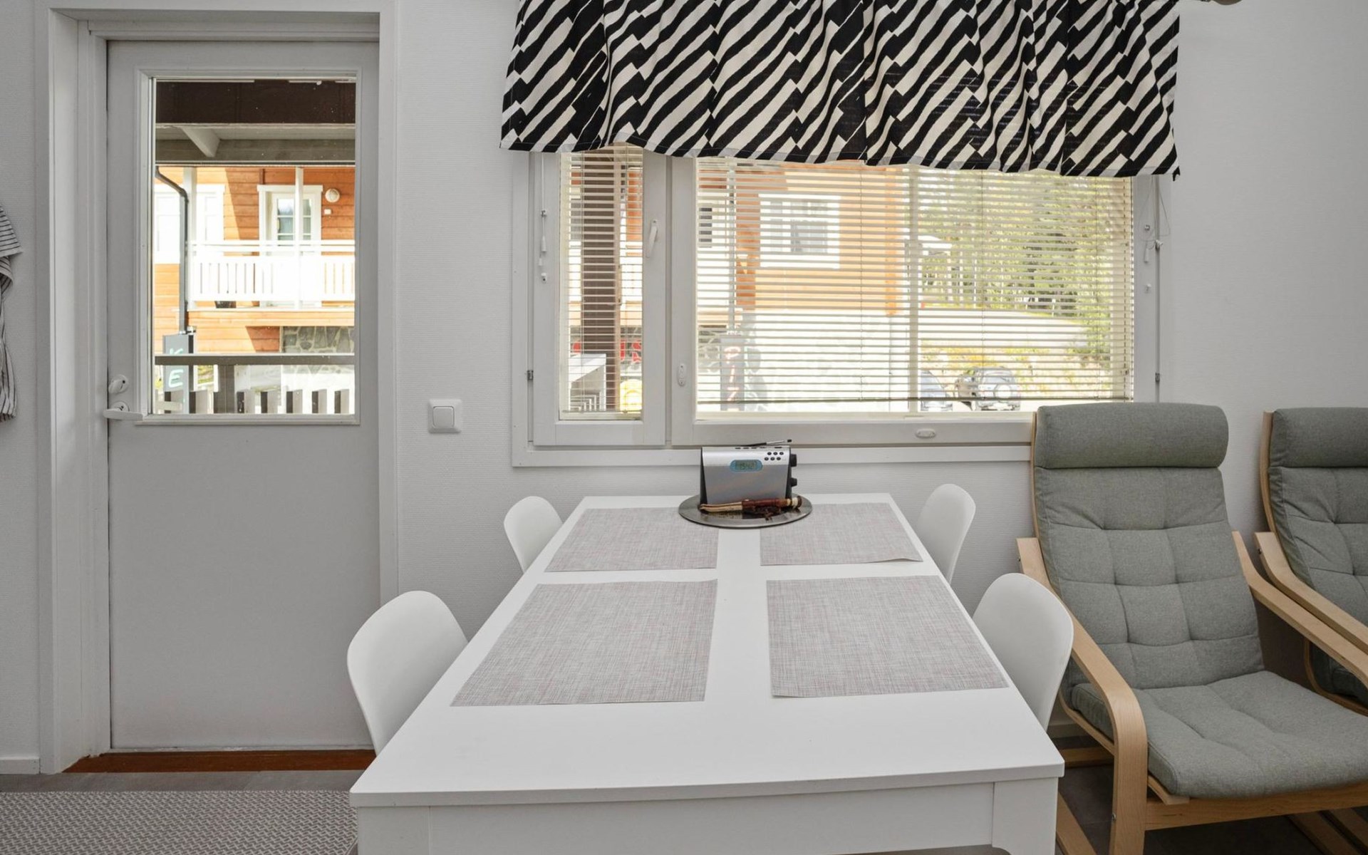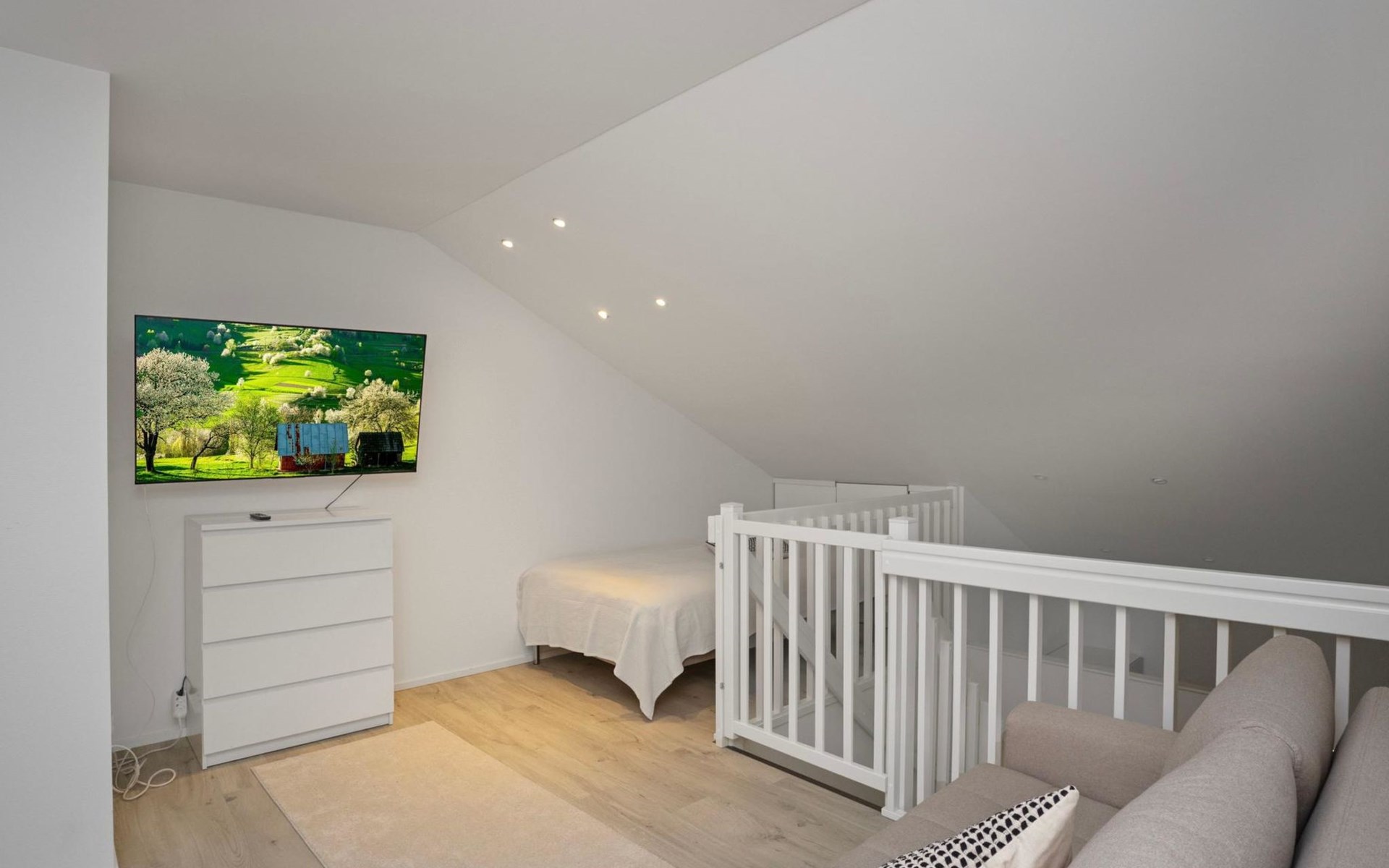 The living area and open-plan kitchen are cozy, with the atmosphere enhanced by a fireplace. The kitchen is well-equipped, and the dining table can be extended. The upstairs living area includes a workstation, so remote work is possible. The bathroom and sauna provide a great space for relaxation.