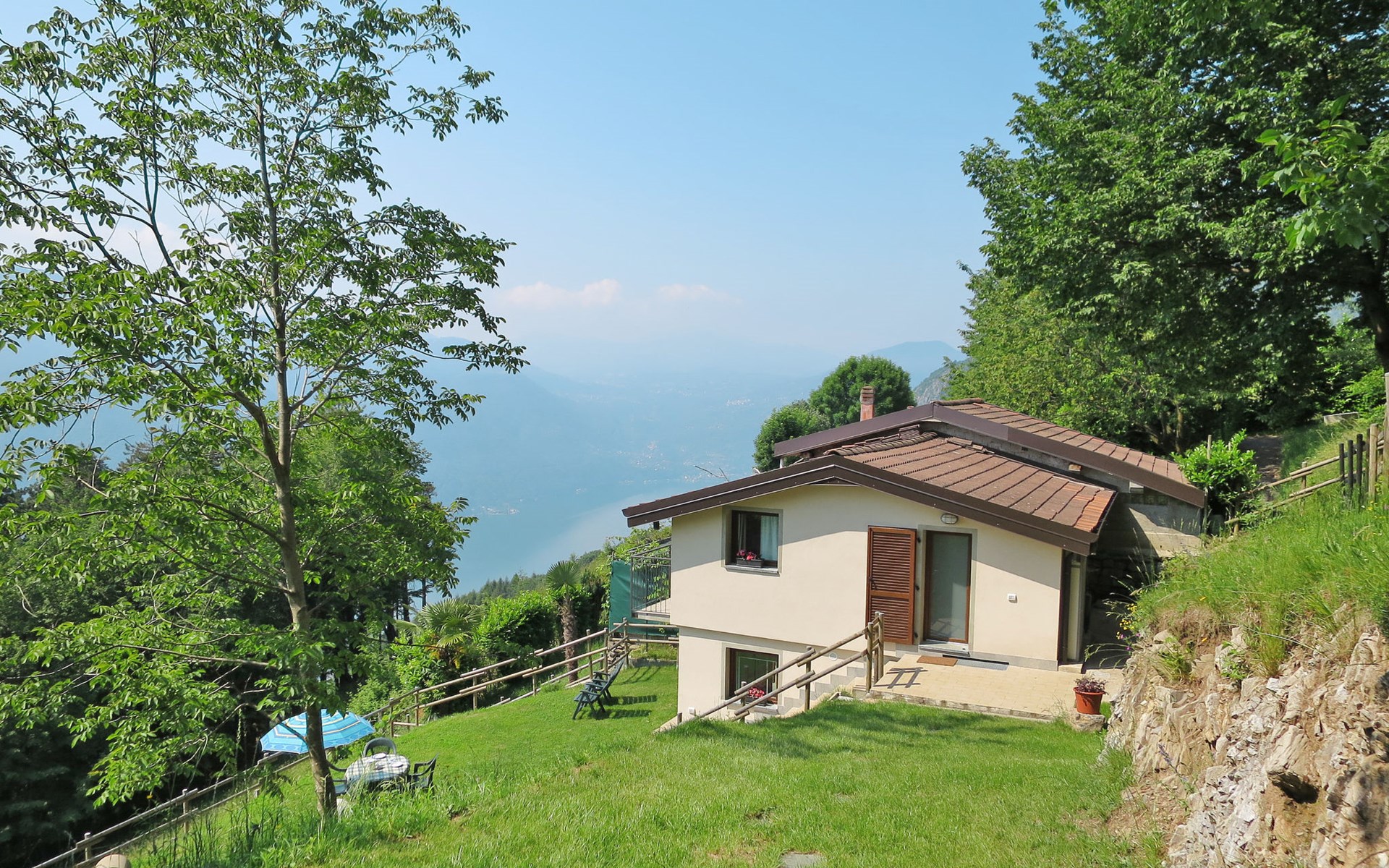 Haus "Pineta", 800 m.ü.M., einseitig angebaut. Im Ortsteil Monte di Ponte, 9 km vom Zentrum von Porlezza, 21 km vom Zentrum von Lugano, 51 km vom Zentrum von Como, am Hang, 9 km vom See. Zur Alleinbenutzung: Grundstück 400 m2 (eingezäunt), terrassierter Garten mit Bäumen, Wiese. 6 km lange schmale Zufahrt bis 50 m zum Haus (Bergstrasse). Parkplatz beim Haus in 50 m. Einkaufsgeschäft 6 km, Supermarkt 9 km, Restaurant 4 km, Bar 4 km, Bushaltestelle 10 m, Bahnstation "Lugano" 21 km, Grasstrand "Porlezza" 9 km, Freibad 9.5 km, Hallenbad 21 km. Jacht-Hafen 9 km, Wanderwege ab Haus 50 m.
