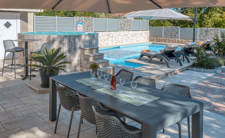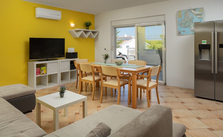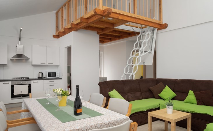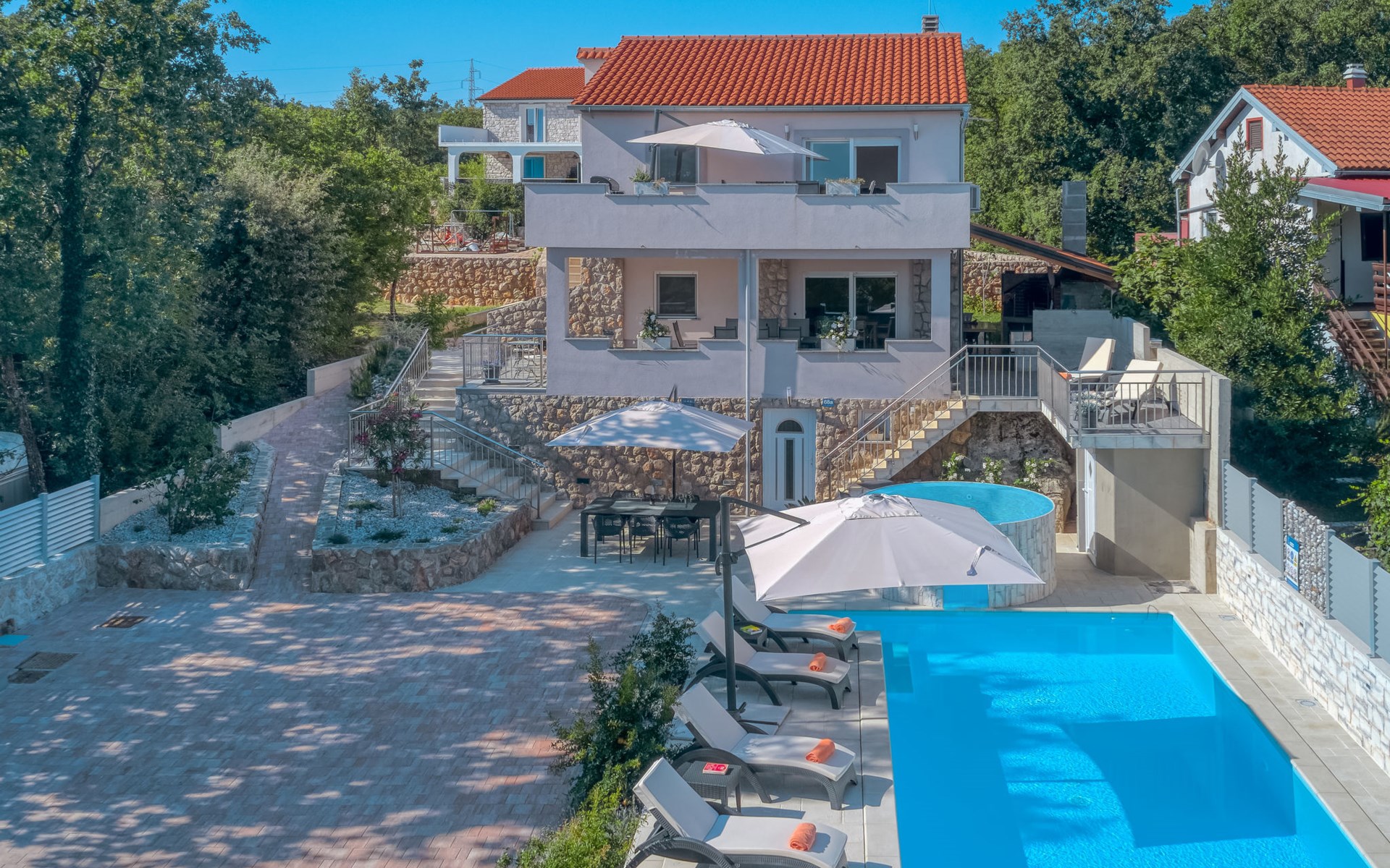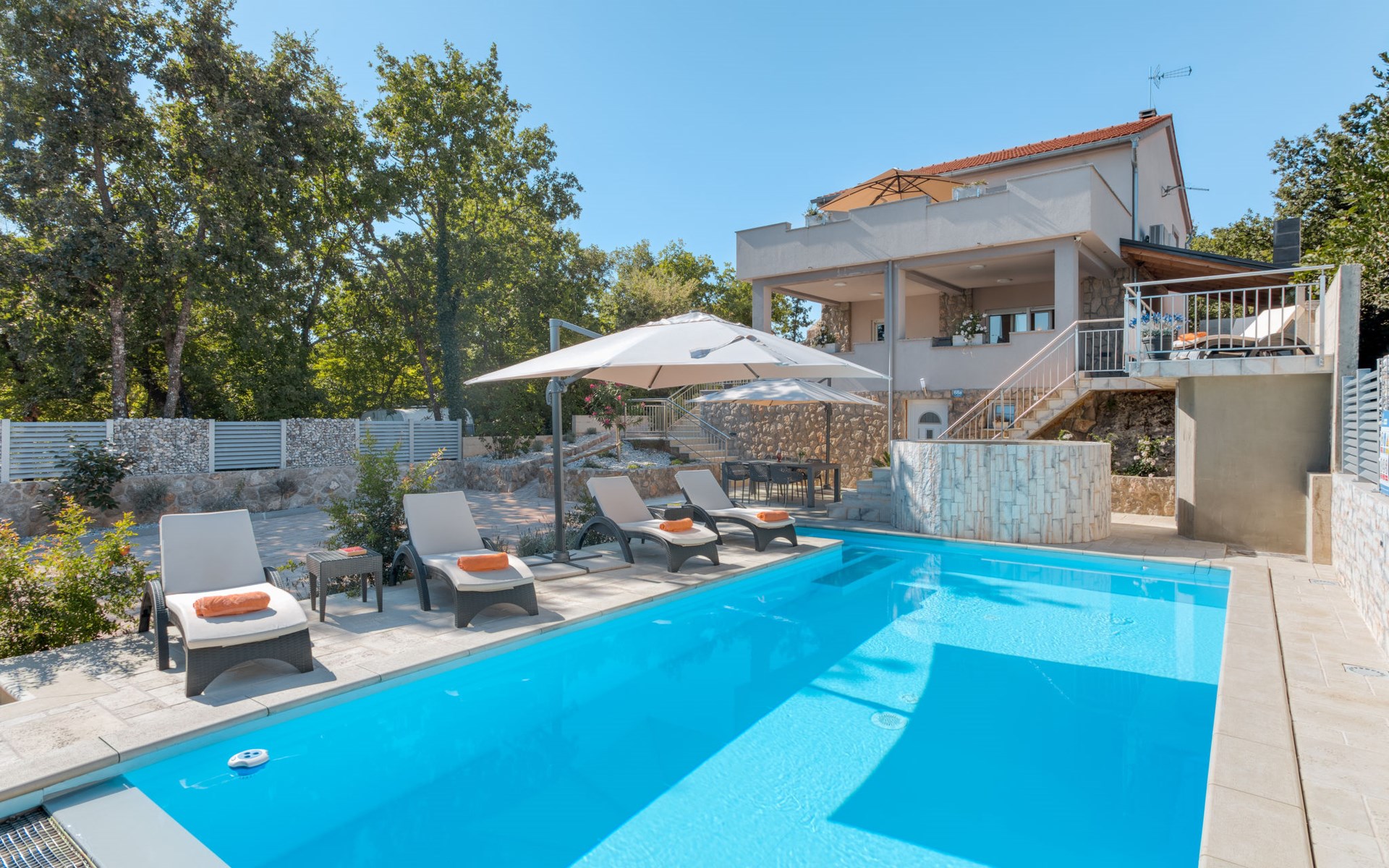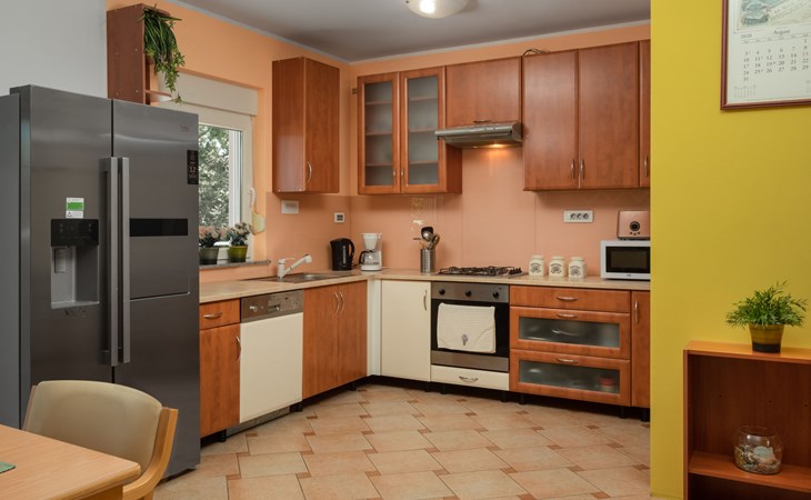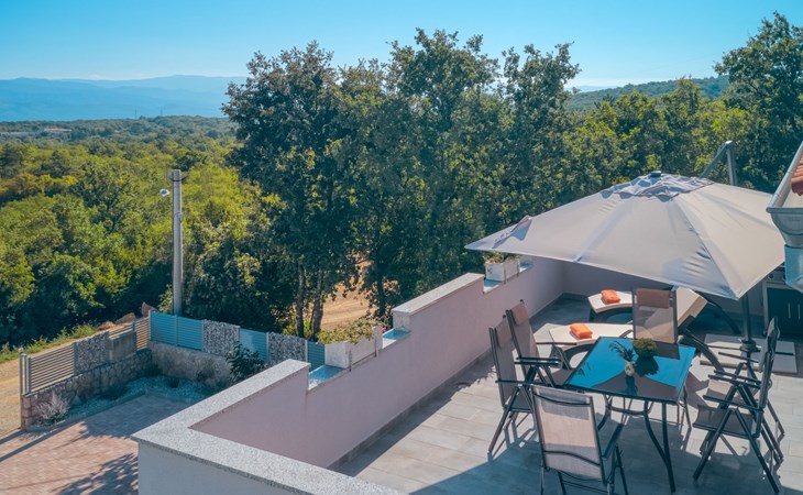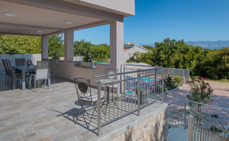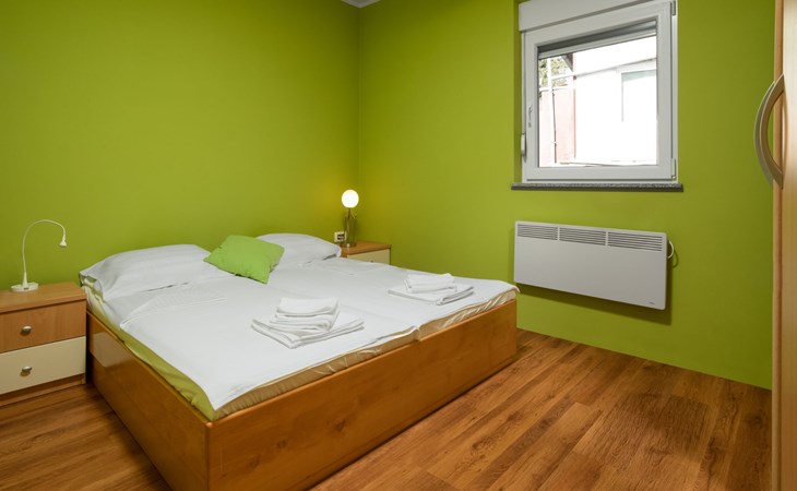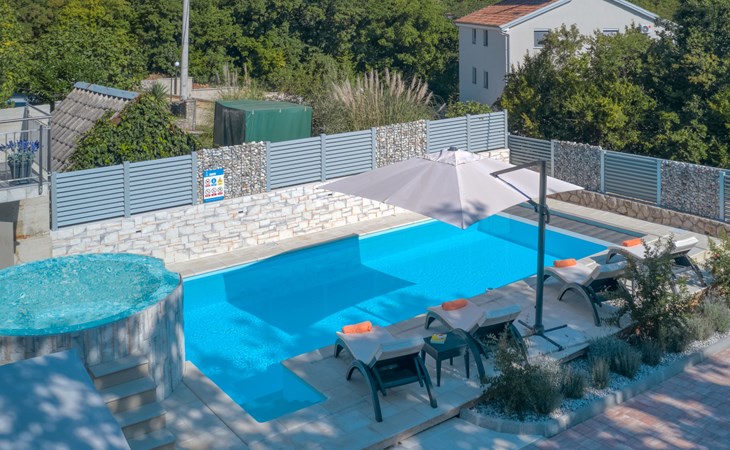 Einfamilienhaus "Lavendel", auf 2 Stockwerken. Im Weiler Donja Hlapa, 12 km vom Zentrum von Malinska, 3.5 km vom Zentrum von Klimno, 16 km vom Zentrum von Krk, am Hang, 2.5 km vom Meer, 2.5 km vom Strand. Zur Alleinbenutzung: Grundstück 500 m2 mit Pflanzen und Bäumen, Schwimmbad beheizt (8 x 4 m, 150 cm tief, saisonale Verfügbarkeit: 15.Mar. - 15.Nov.). Aussendusche, Sprudelbad. Im Hause: Internetzugang, Waschmaschine. Zufahrt bis 200 m zum Haus (Naturweg). Parkplatz (für 3 Autos) beim Haus auf dem Grundstück. Supermarkt 2 km, Bushaltestelle 4.9 km, Sandstrand 5 km, Kieselstrand 2.5 km. Bitte beachten: Flugplatz 14 km vom Haus. Die Wohneinheit besteht aus 2 Wohnungen, die aber zusammen vermietet werden. Schwimmbad beheizt (extra).