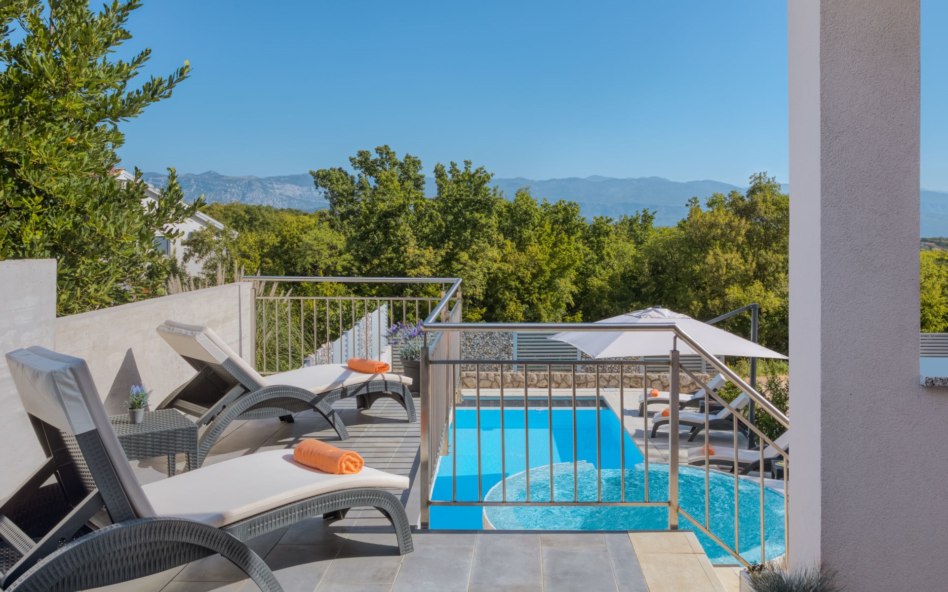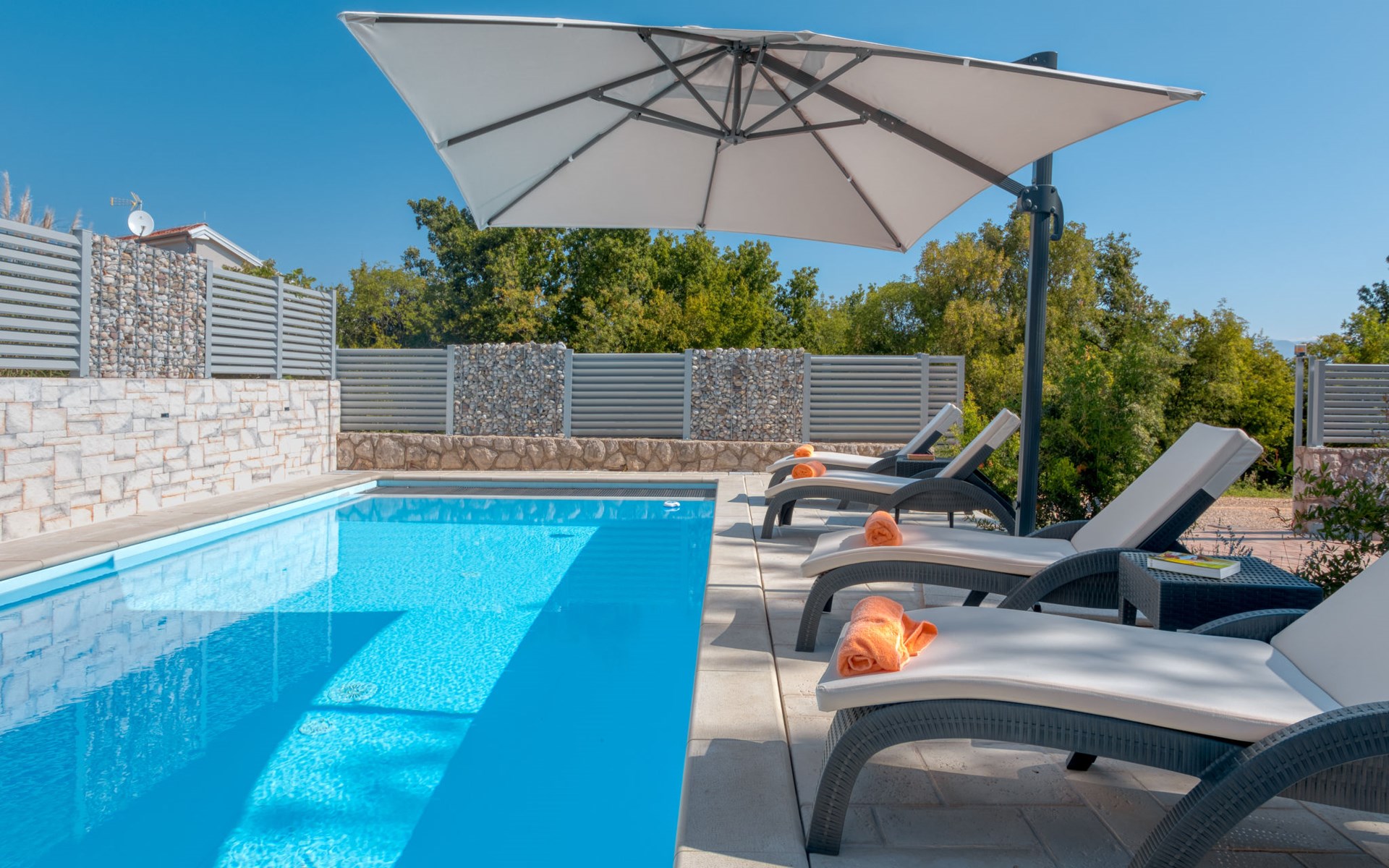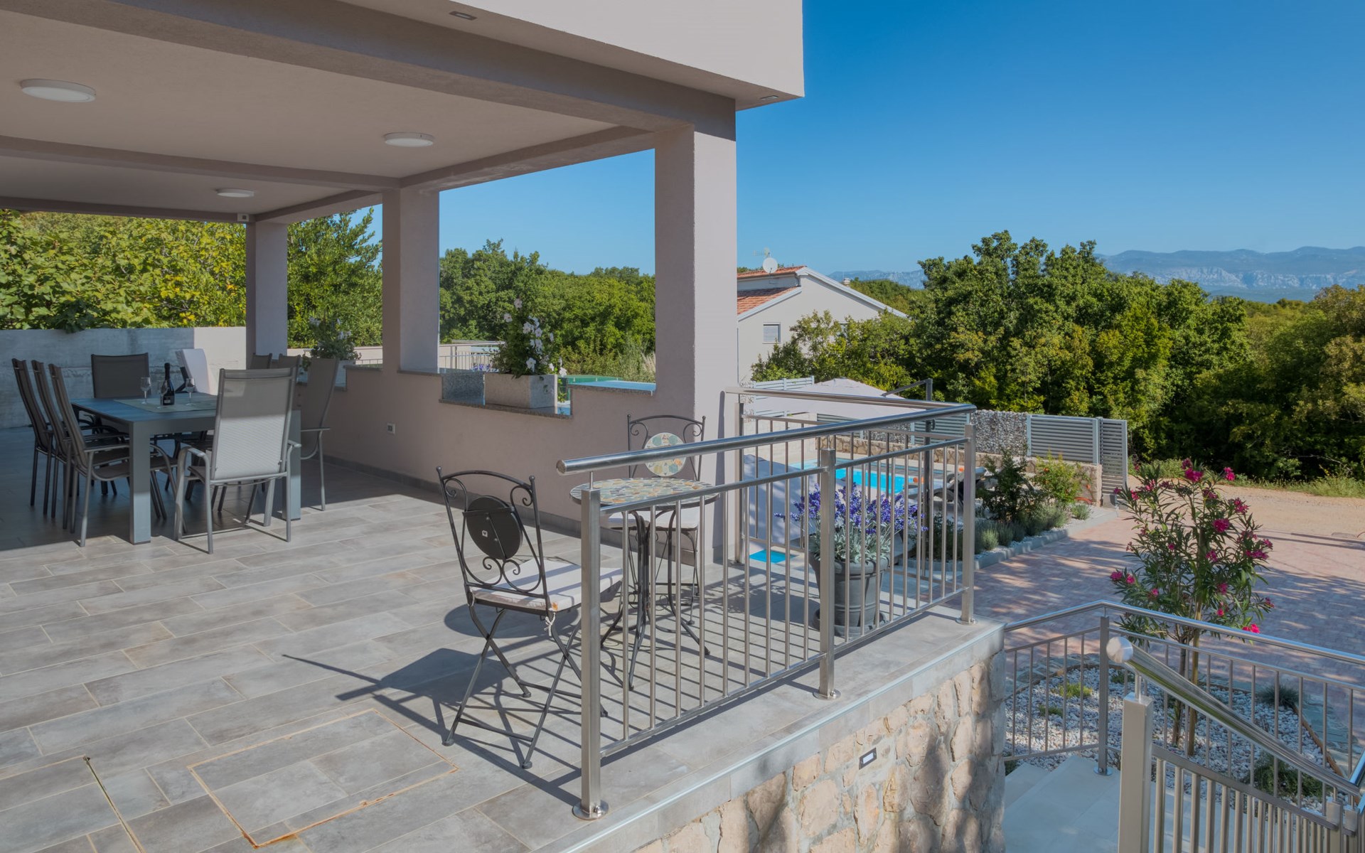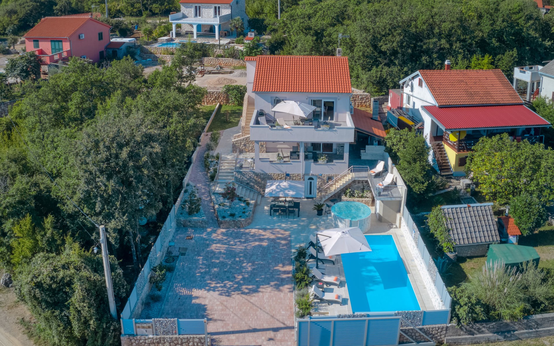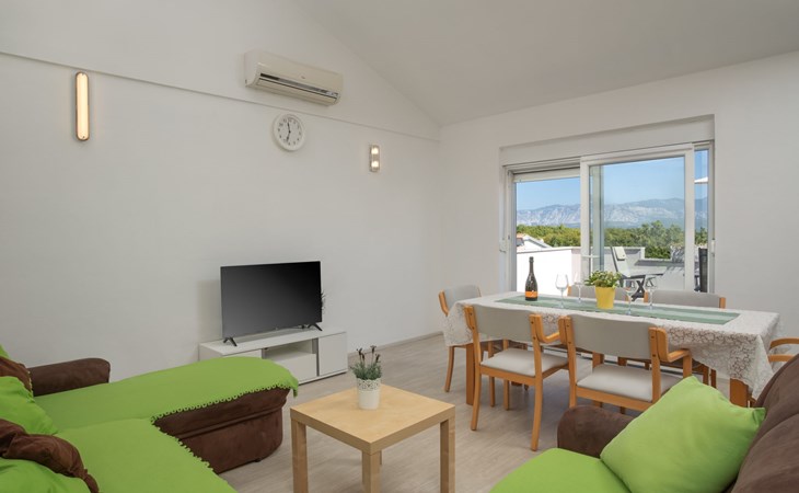 Einfamilienhaus "Lavendel", auf 2 Stockwerken. Im Weiler Donja Hlapa, 12 km vom Zentrum von Malinska, 3.5 km vom Zentrum von Klimno, 16 km vom Zentrum von Krk, am Hang, 2.5 km vom Meer, 2.5 km vom Strand. Zur Alleinbenutzung: Grundstück 500 m2 mit Pflanzen und Bäumen, Schwimmbad beheizt (8 x 4 m, 150 cm tief, saisonale Verfügbarkeit: 15.Mar. - 15.Nov.). Aussendusche, Sprudelbad. Im Hause: Internetzugang, Waschmaschine. Zufahrt bis 200 m zum Haus (Naturweg). Parkplatz (für 3 Autos) beim Haus auf dem Grundstück. Supermarkt 2 km, Bushaltestelle 4.9 km, Sandstrand 5 km, Kieselstrand 2.5 km. Bitte beachten: Flugplatz 14 km vom Haus. Die Wohneinheit besteht aus 2 Wohnungen, die aber zusammen vermietet werden. Schwimmbad beheizt (extra).
