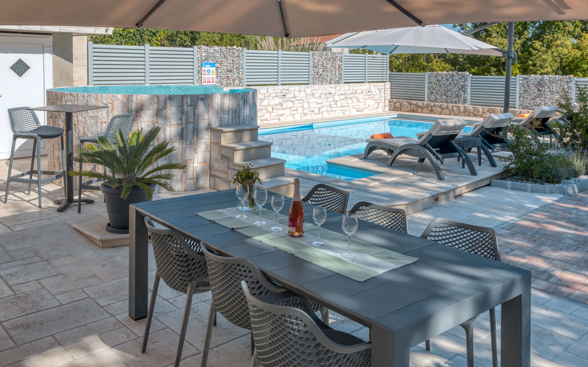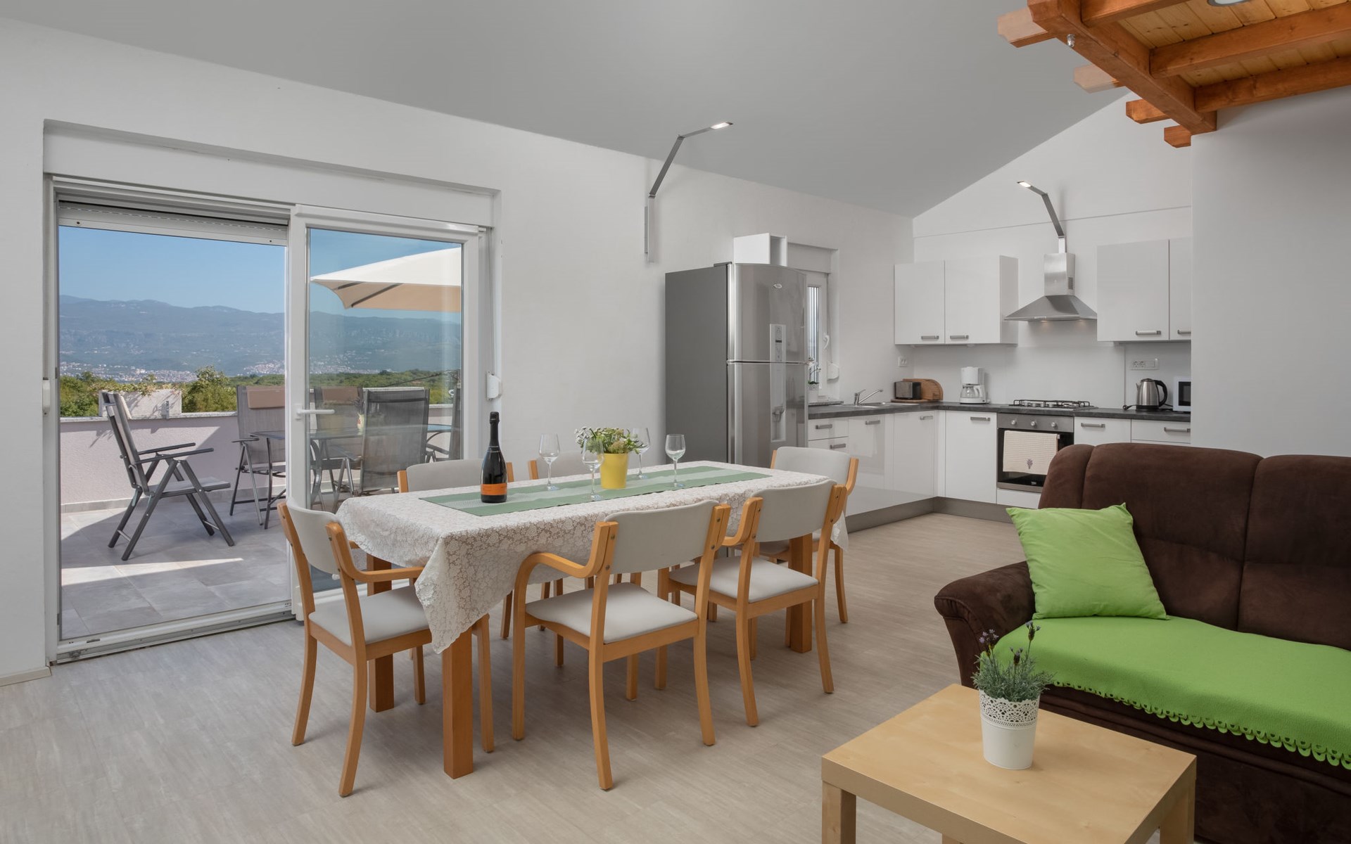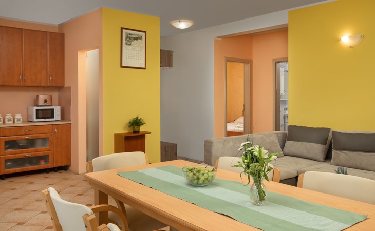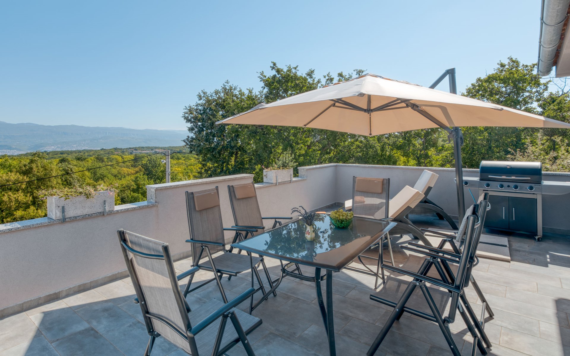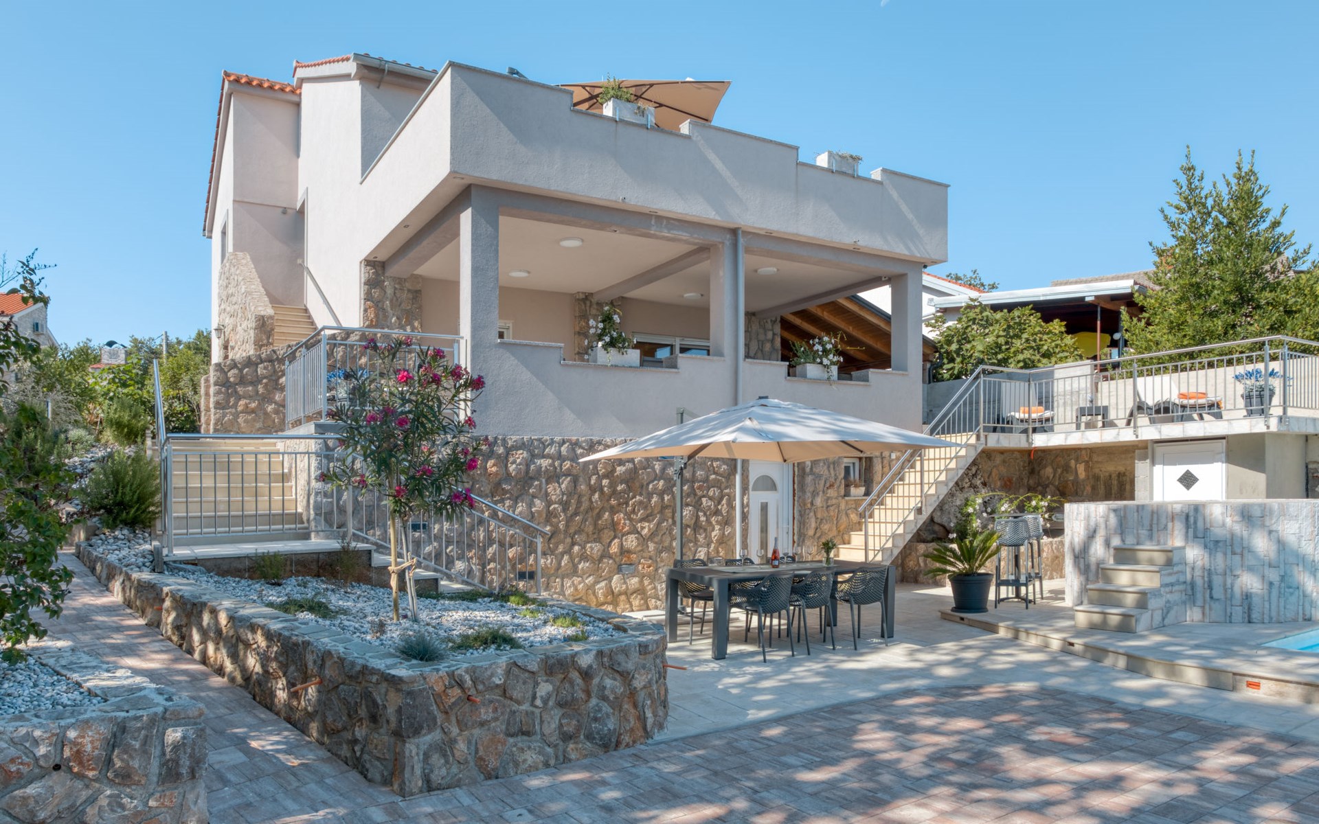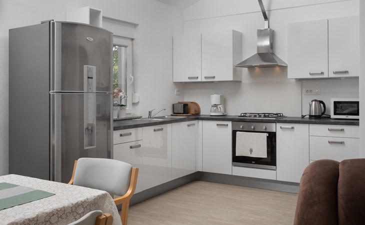 Einfamilienhaus "Lavendel", auf 2 Stockwerken. Im Weiler Donja Hlapa, 12 km vom Zentrum von Malinska, 3.5 km vom Zentrum von Klimno, 16 km vom Zentrum von Krk, am Hang, 2.5 km vom Meer, 2.5 km vom Strand. Zur Alleinbenutzung: Grundstück 500 m2 mit Pflanzen und Bäumen, Schwimmbad beheizt (8 x 4 m, 150 cm tief, saisonale Verfügbarkeit: 15.Mar. - 15.Nov.). Aussendusche, Sprudelbad. Im Hause: Internetzugang, Waschmaschine. Zufahrt bis 200 m zum Haus (Naturweg). Parkplatz (für 3 Autos) beim Haus auf dem Grundstück. Supermarkt 2 km, Bushaltestelle 4.9 km, Sandstrand 5 km, Kieselstrand 2.5 km. Bitte beachten: Flugplatz 14 km vom Haus. Die Wohneinheit besteht aus 2 Wohnungen, die aber zusammen vermietet werden. Schwimmbad beheizt (extra).