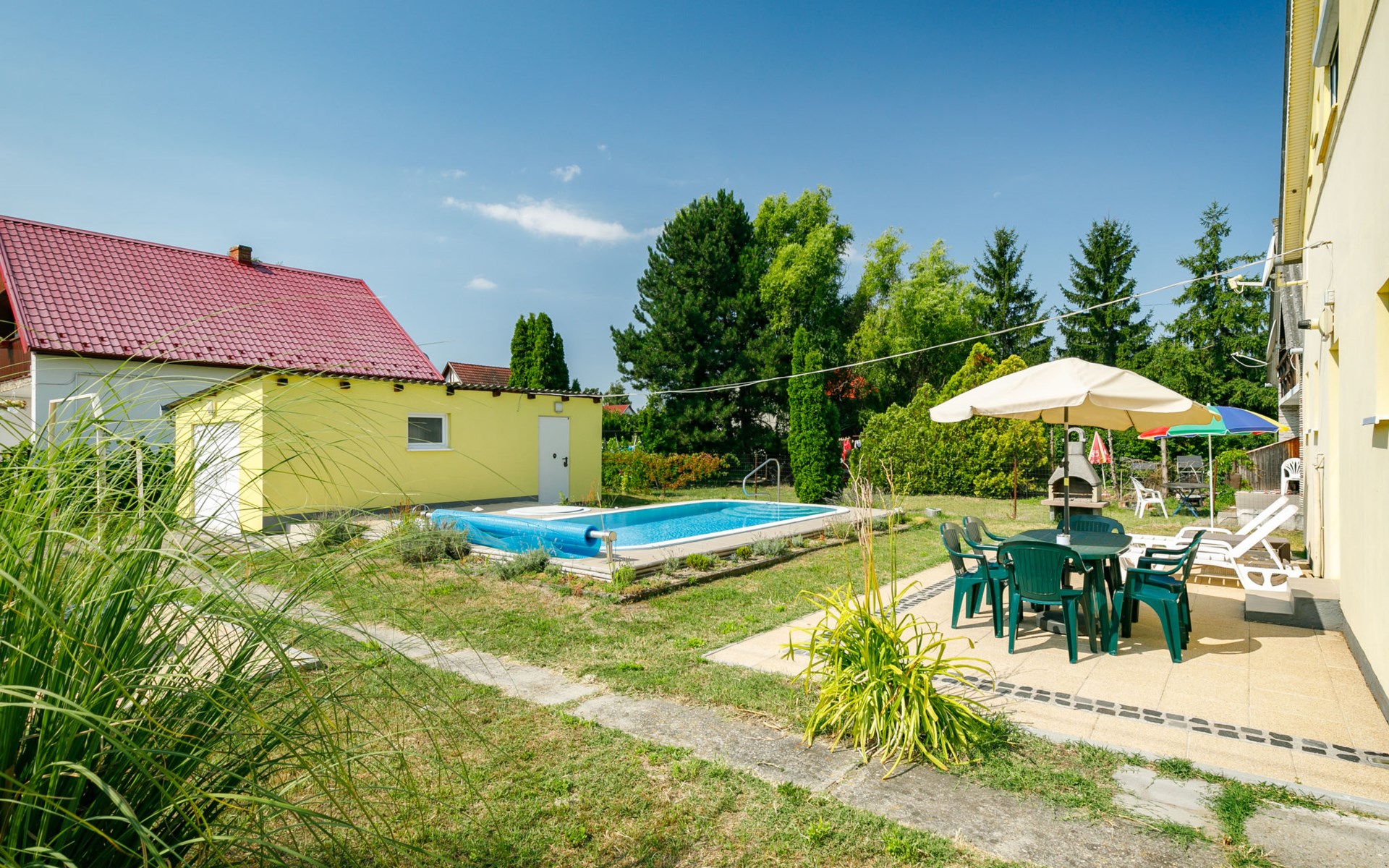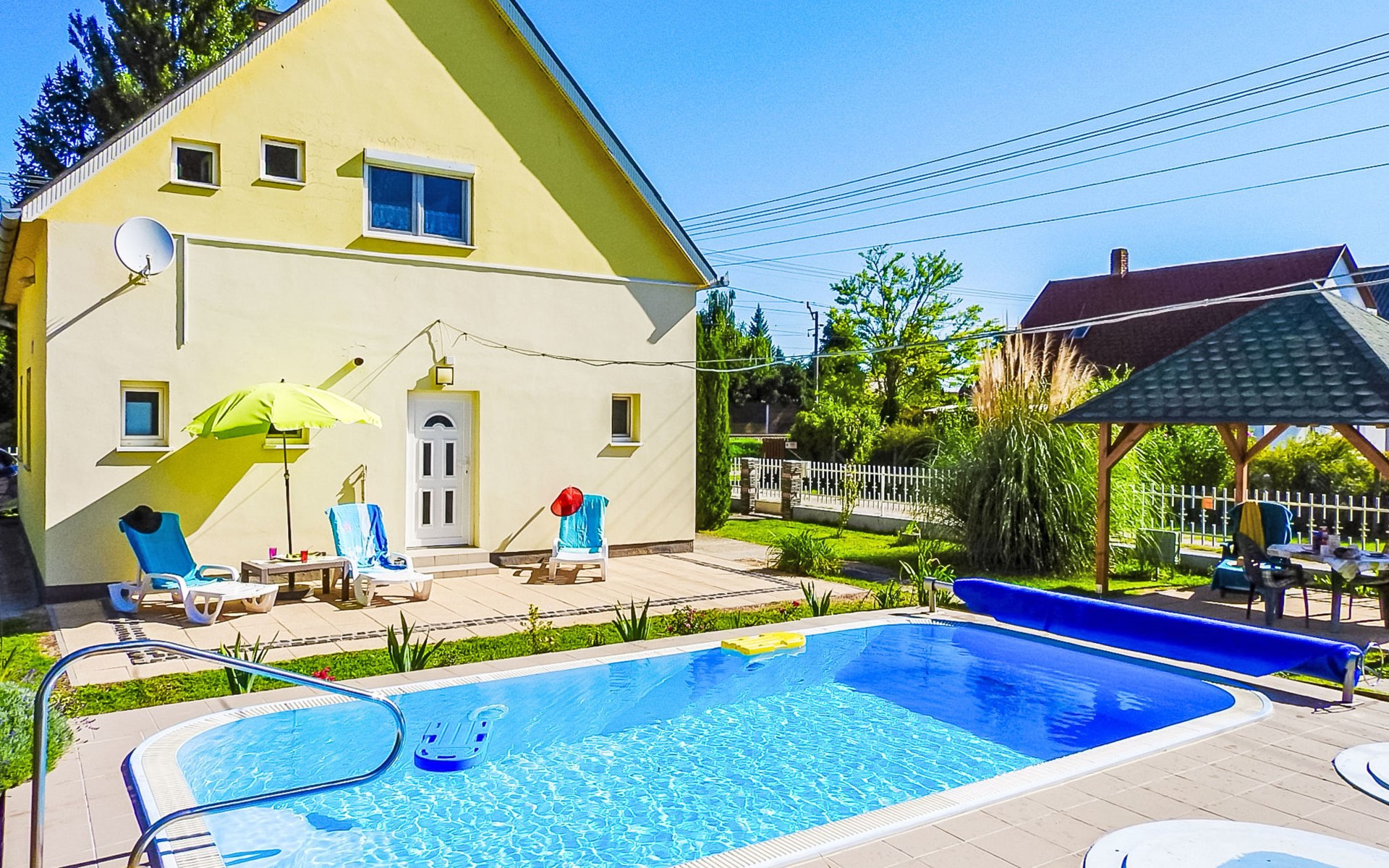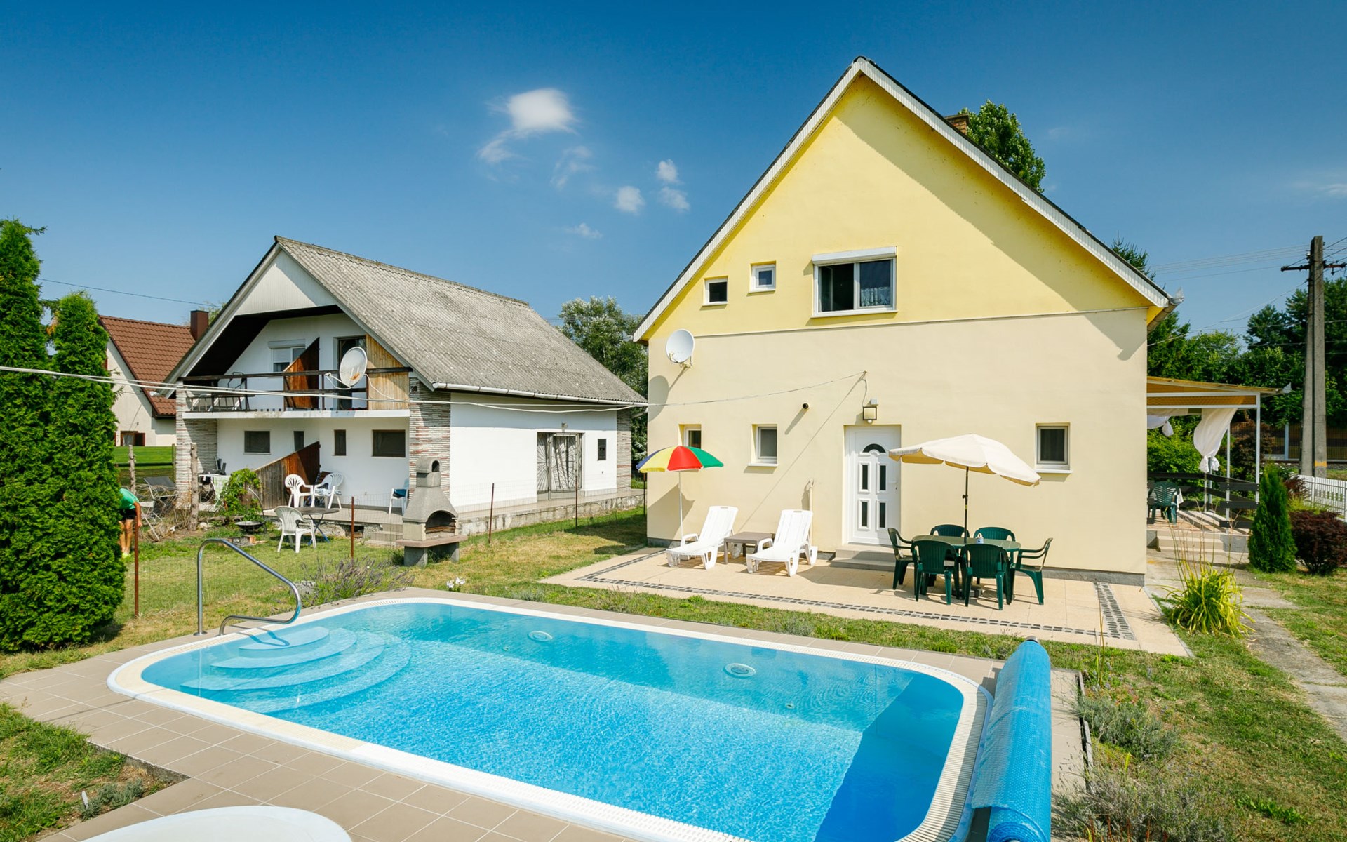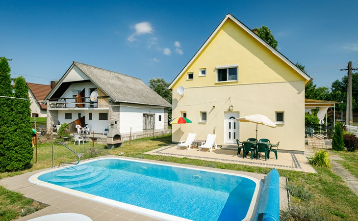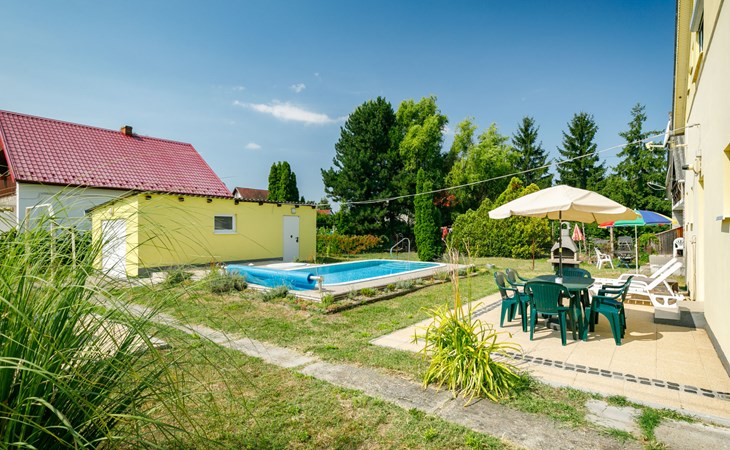 Balatonmáriafürdő 19 km von Keszthely: Gemütliches Zweifamilienhaus "Sunny Day", auf 2 Stockwerken. Im Ort, 400 m vom See, 300 m vom Strand. Zur Alleinbenutzung: Grundstück 600 m2 (eingezäunt), Garten, Liegewiese, Schwimmbad eckig (3 x 6 m, saisonale Verfügbarkeit: 15.Mai. - 15.Sep.). Im Hause: Wireless LAN. Restaurant 100 m. Bitte beachten: Eisenbahnlinie in der Nähe.