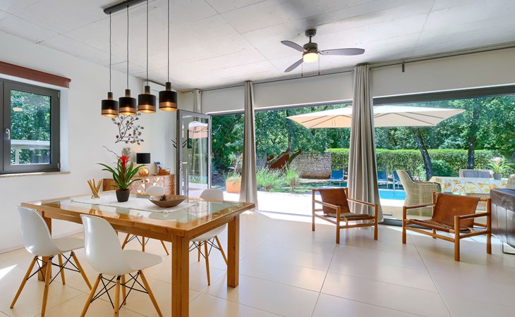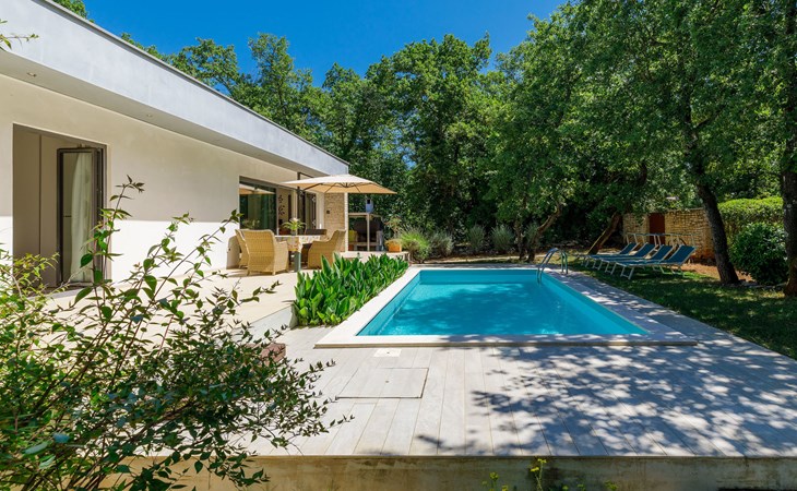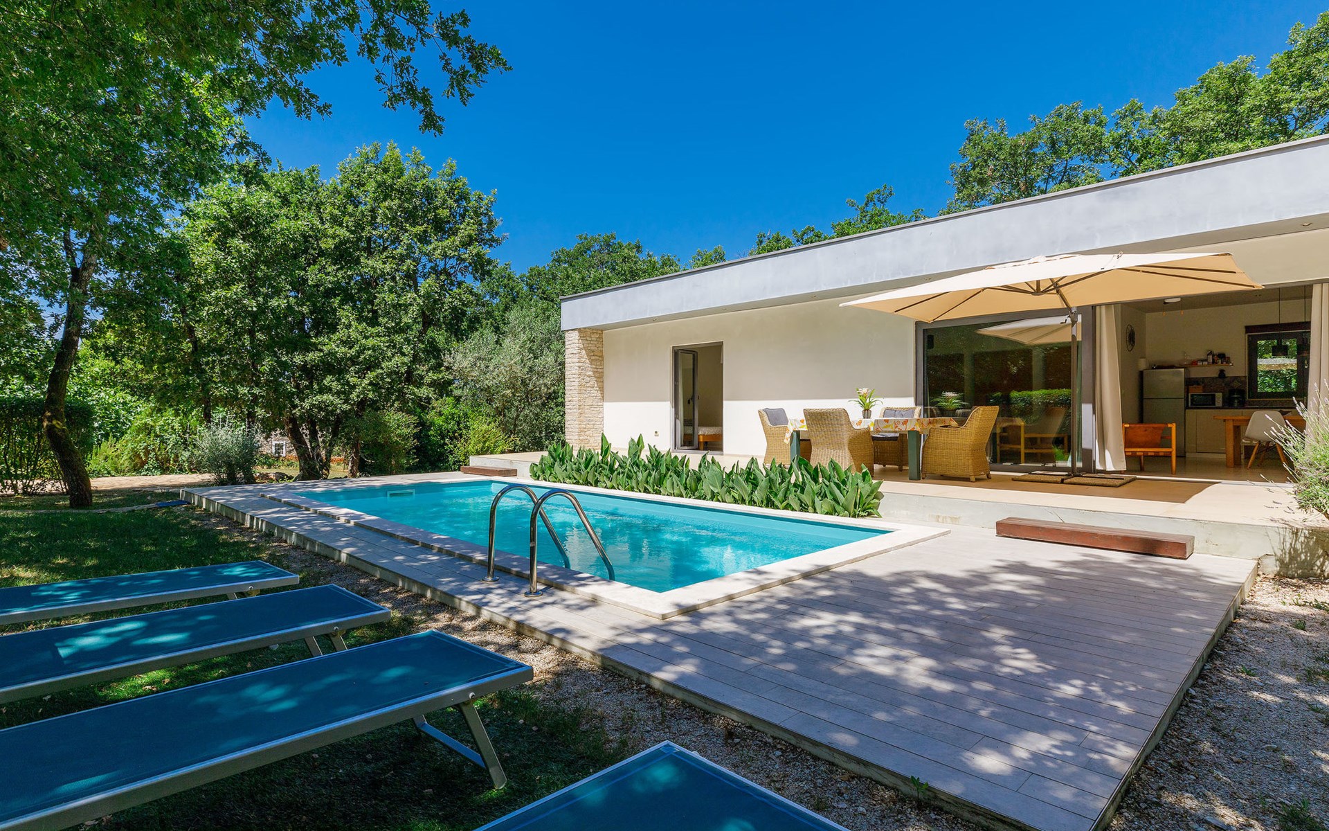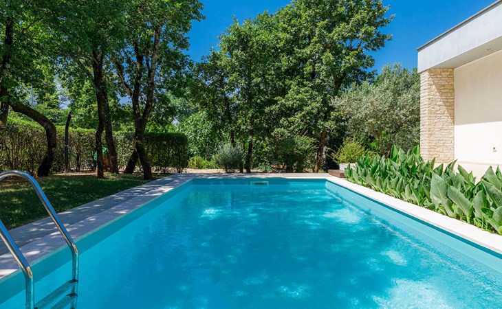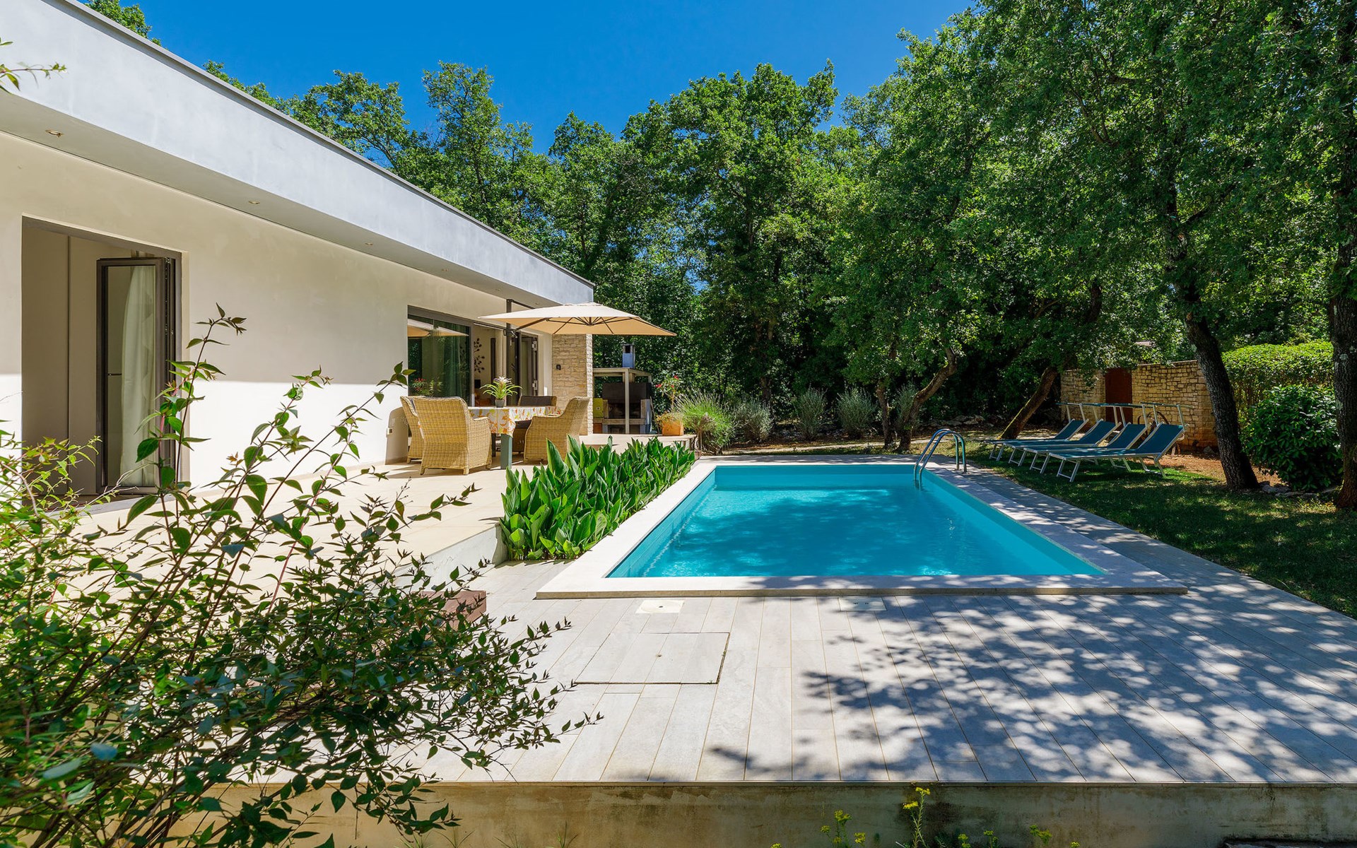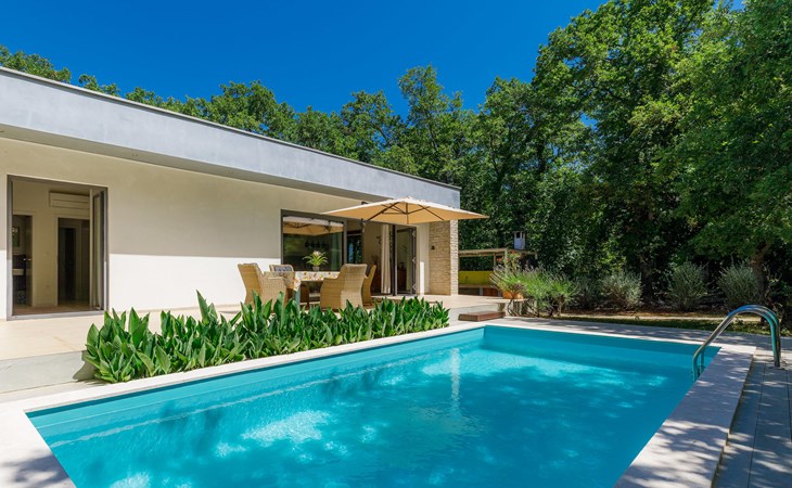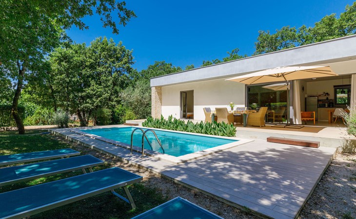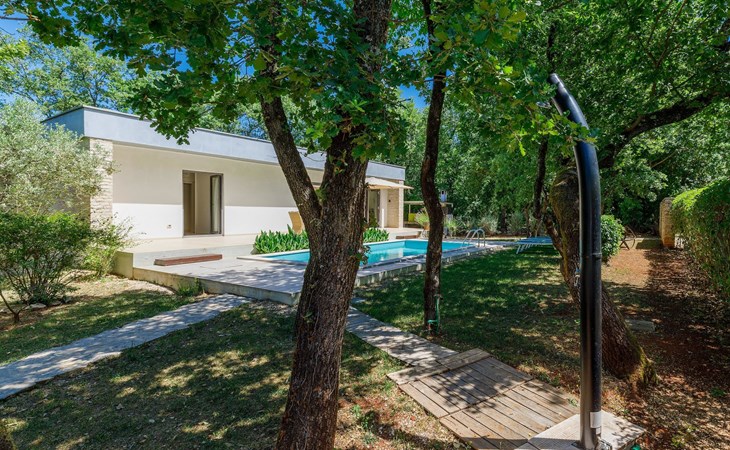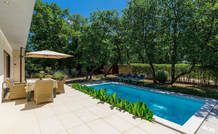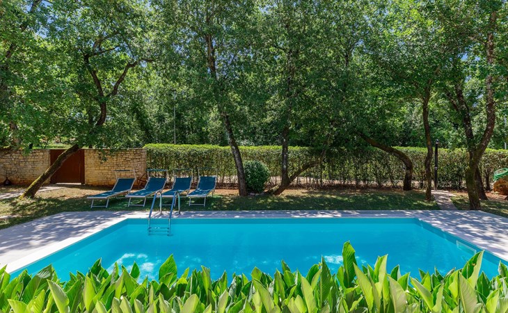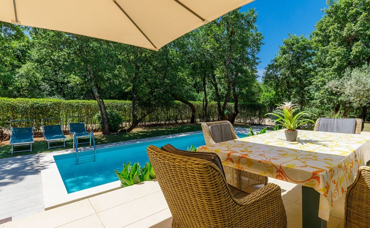 Einfamilienhaus "Villa Frleti", auf 2 Stockwerken. Im Weiler Frleti, 9 km vom Zentrum von Umag, ruhige, sonnige Lage, 4 km vom Meer, in einer Sackgasse, im Grünen. Zur Alleinbenutzung: Grundstück 1'700 m2 mit Bäumen, Schwimmbad eckig (7 x 3 m, 140 cm tief, saisonale Verfügbarkeit: 01.Mai. - 30.Sep.). Aussendusche, Terrasse, Grill. Im Hause: Internetzugang, Billard, Tischfussball, Waschmaschine. Parkplatz (für 2 Autos) beim Haus auf dem Grundstück. Einkaufsgeschäft 5 km, Restaurant 3 km, Bushaltestelle 7 km, Bahnstation 35 km, Kieselstrand 5.5 km, Felsstrand 5.5 km. Wanderwege ab Haus, Radweg 100 m. Der Besitzer akzeptiert keine Jugendgruppen. Bitte beachten: Flugplatz 80 km vom Haus. Das Schwimmbad wird mit Solarheizung betrieben.