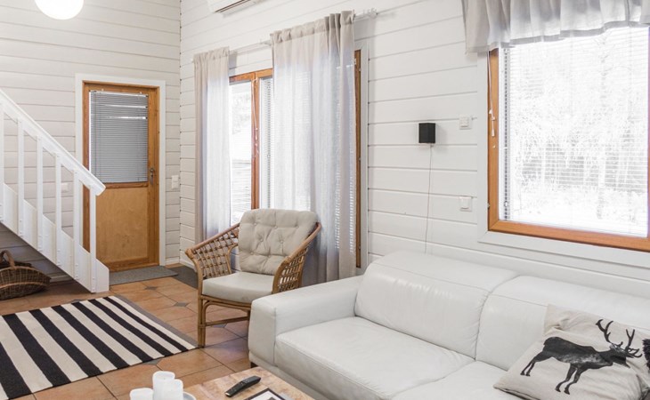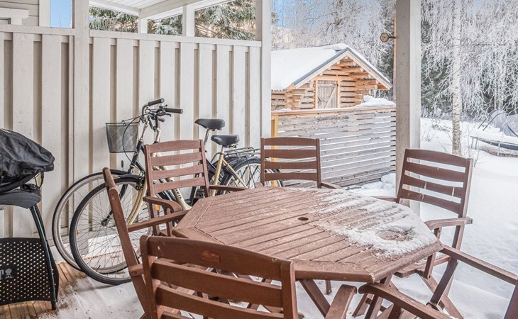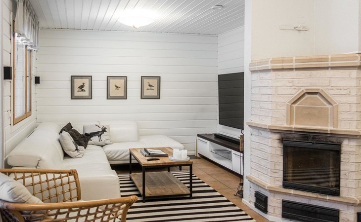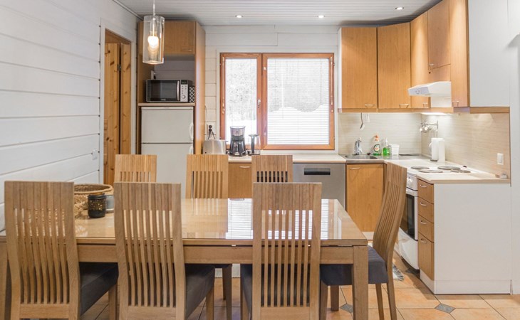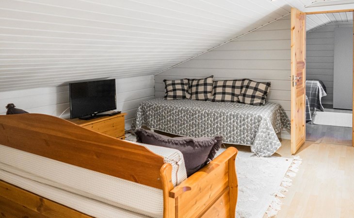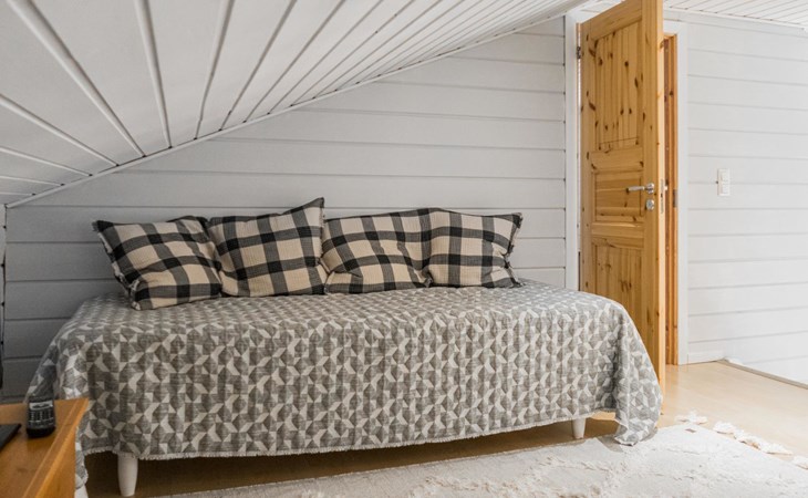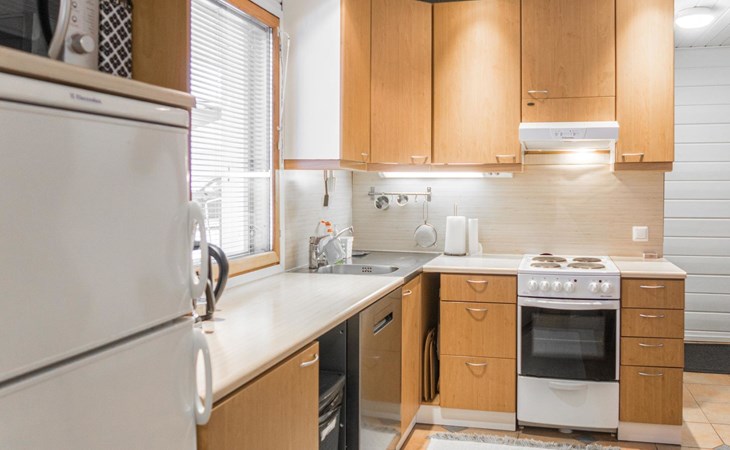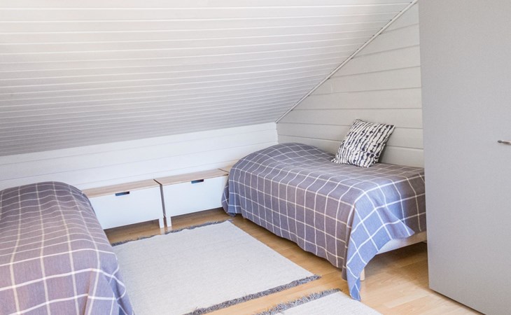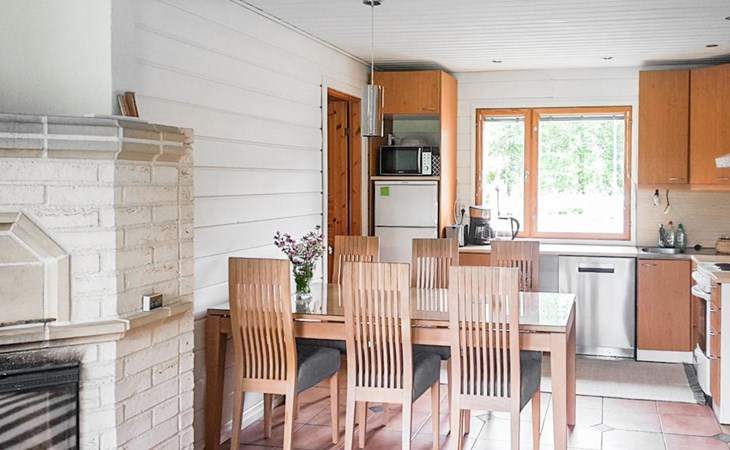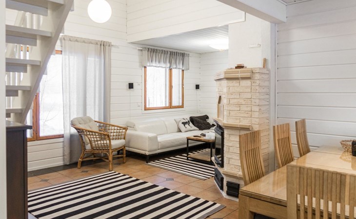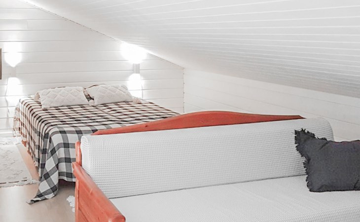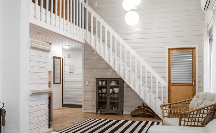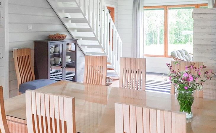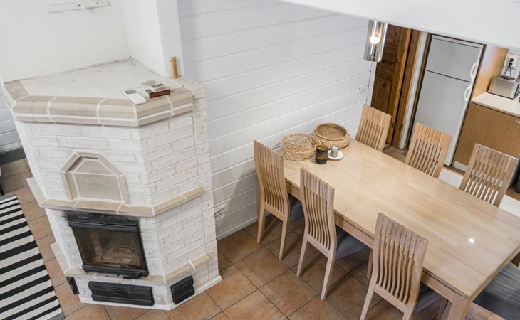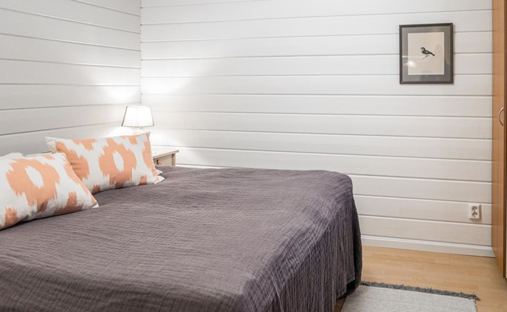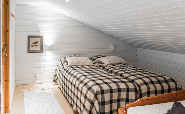 RUSKA is one half of a semi-detached house built in 2002 with a spacious living room kitchen with a dining set for 7 people, two bedrooms, one of which is located downstairs (double bed) and the other upstairs with separate beds for 2. There is more accommodation space in the spacious loft, which has beds for a total of 3 (the double bed in the loft can be converted into separate beds if necessary). Sauna with electric stove (stone tower), shower and separate toilet. Access from the laundry room / utility room to the covered private terrace in the backyard with a view of the lake and the direction of the evening sun, on the terrace garden furniture and an electric grill can be used in the summer, there is also access to the terrace from the living room.