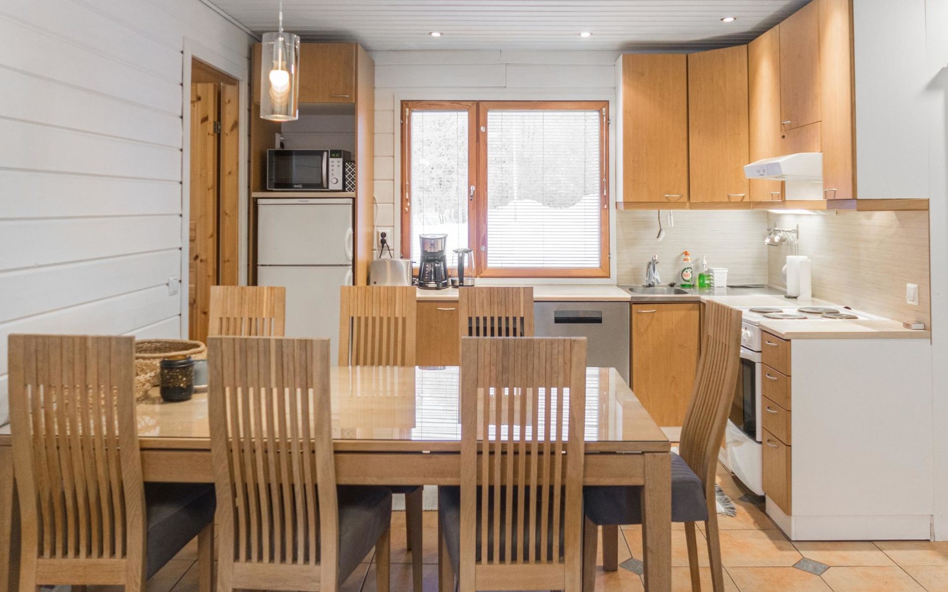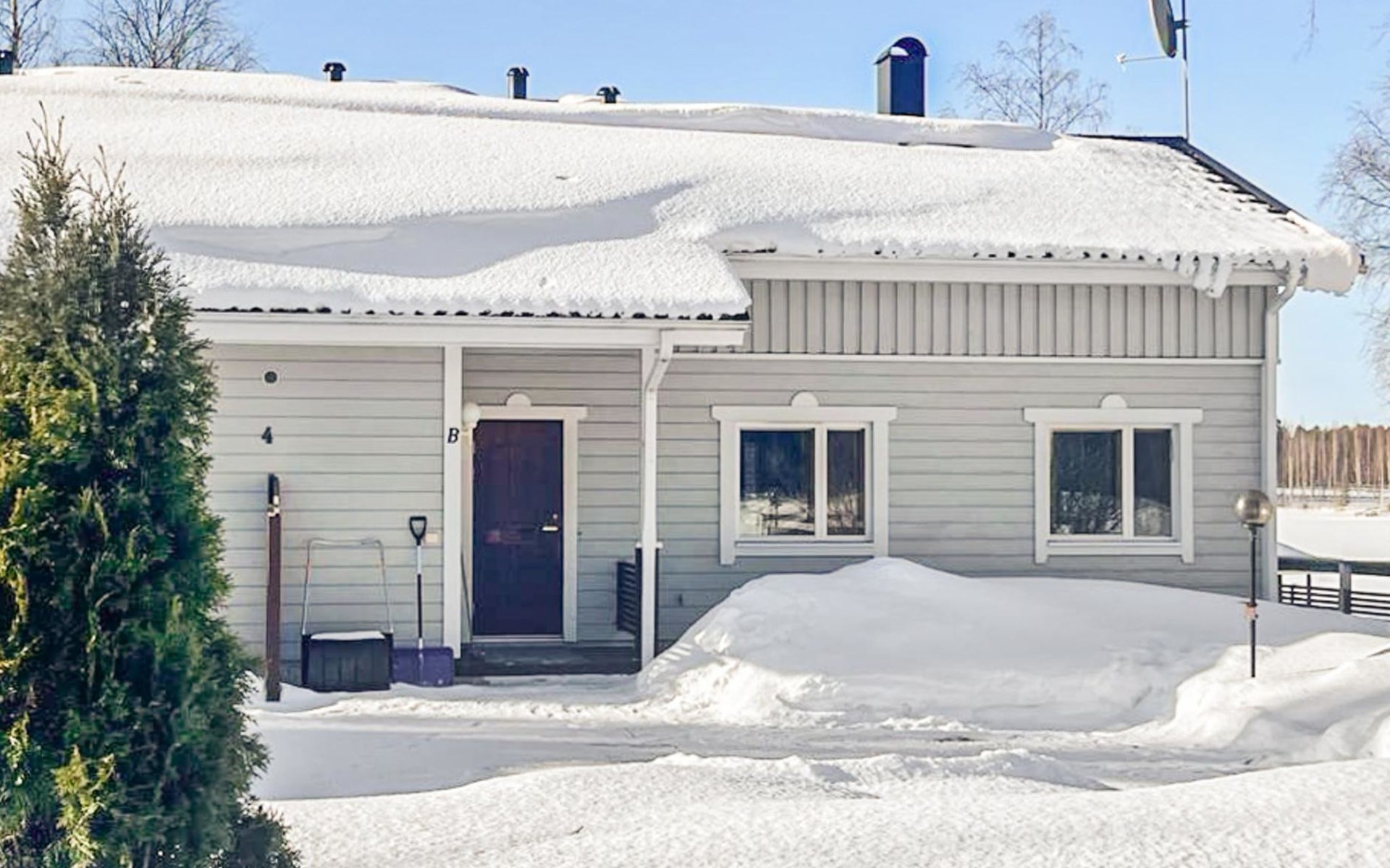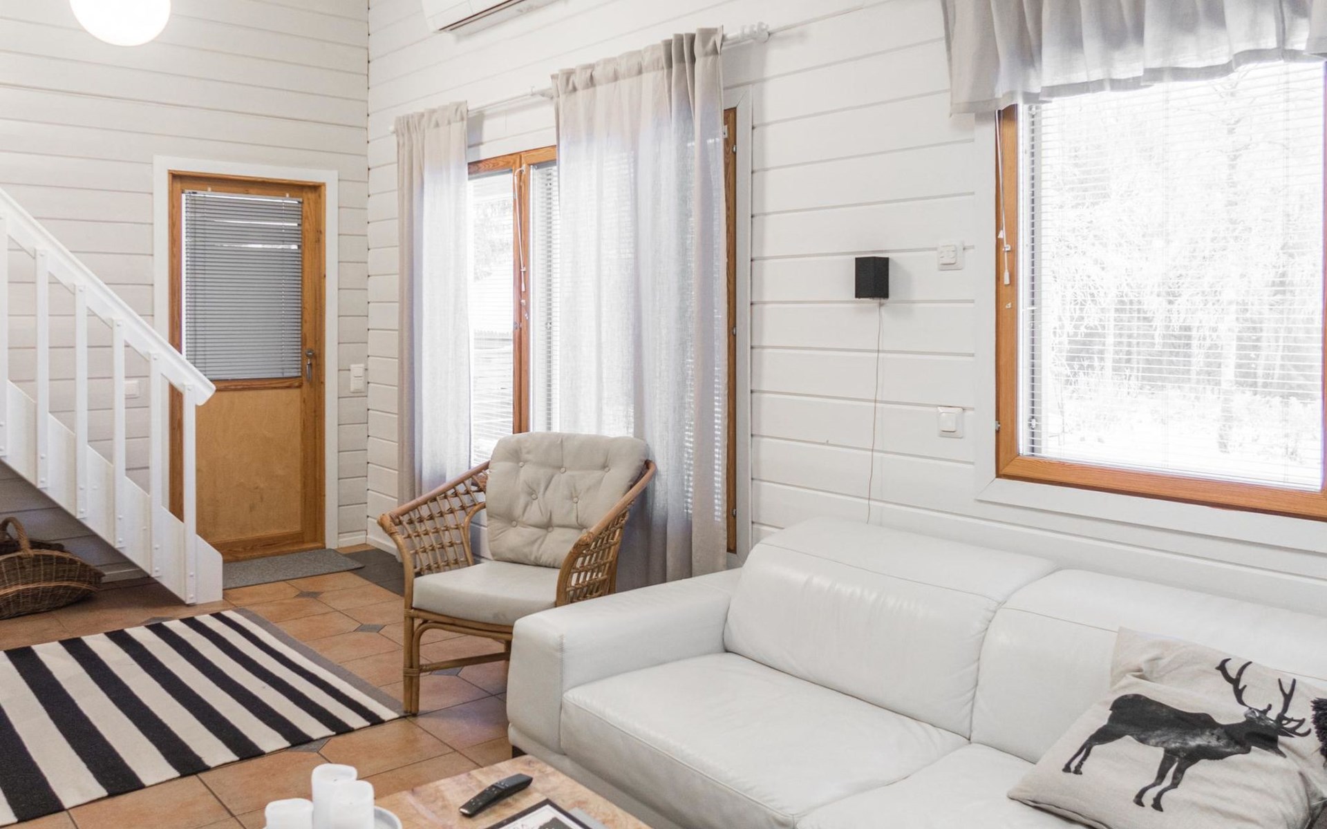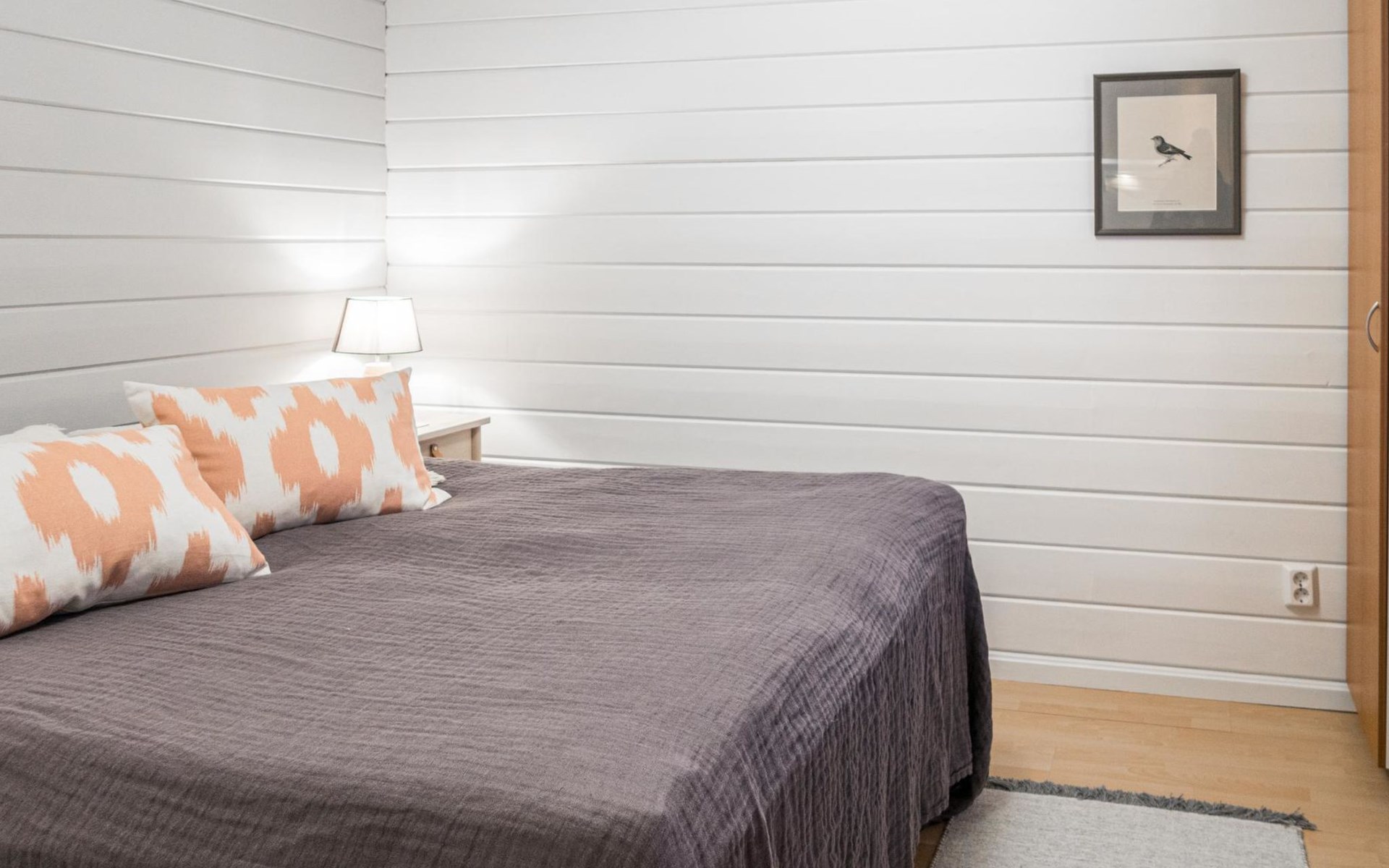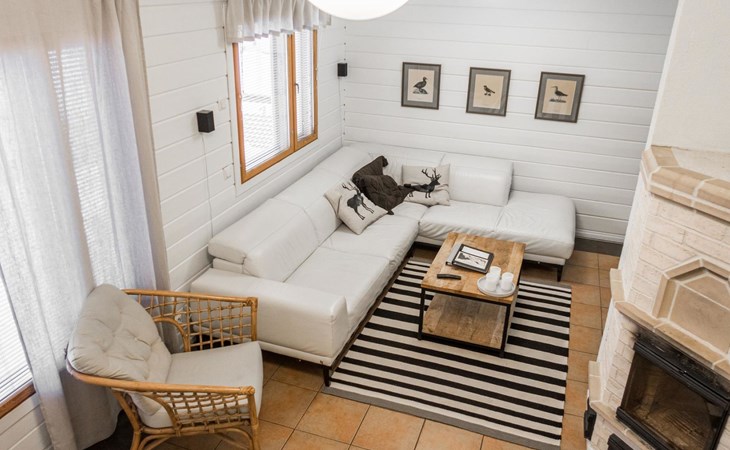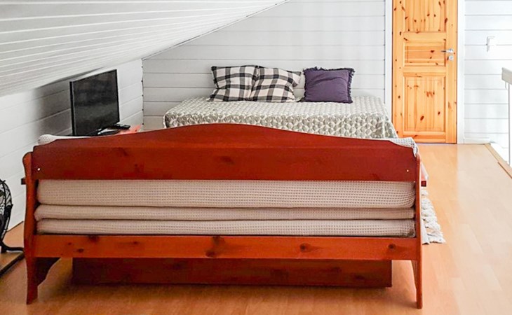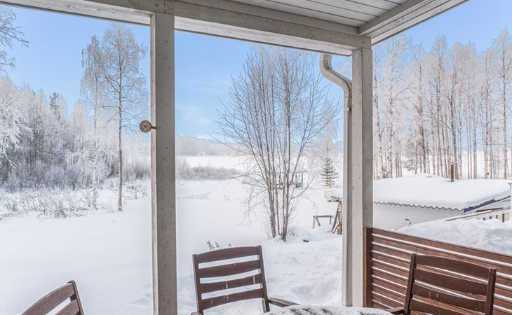 RUSKA is one half of a semi-detached house built in 2002 with a spacious living room kitchen with a dining set for 7 people, two bedrooms, one of which is located downstairs (double bed) and the other upstairs with separate beds for 2. There is more accommodation space in the spacious loft, which has beds for a total of 3 (the double bed in the loft can be converted into separate beds if necessary). Sauna with electric stove (stone tower), shower and separate toilet. Access from the laundry room / utility room to the covered private terrace in the backyard with a view of the lake and the direction of the evening sun, on the terrace garden furniture and an electric grill can be used in the summer, there is also access to the terrace from the living room.
