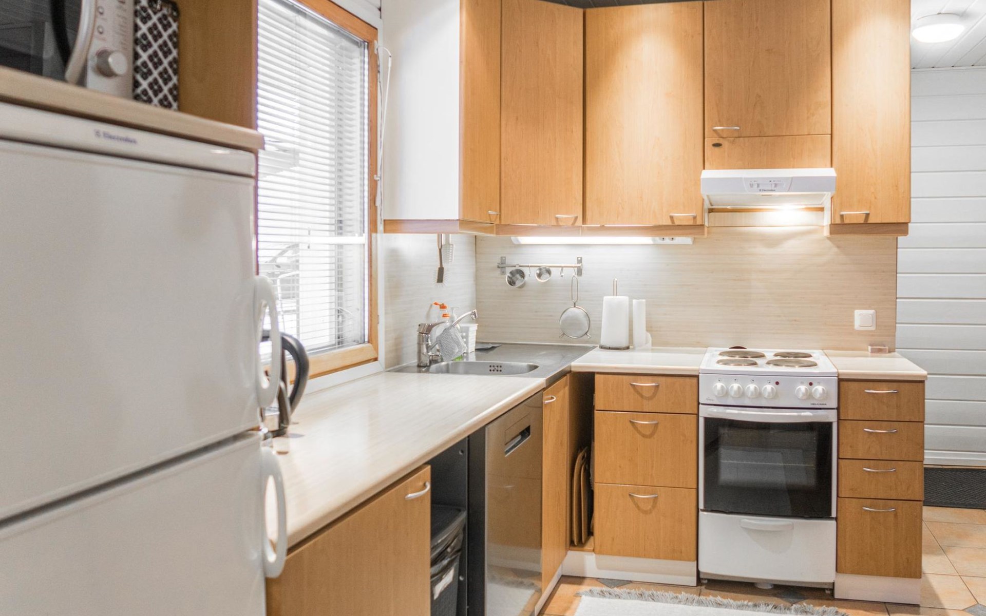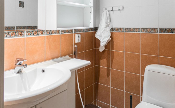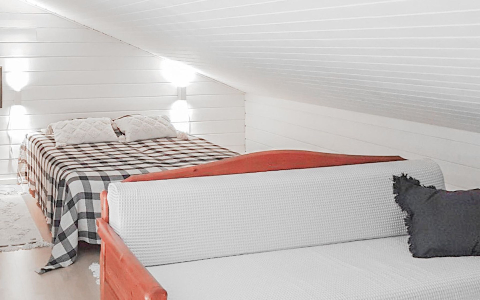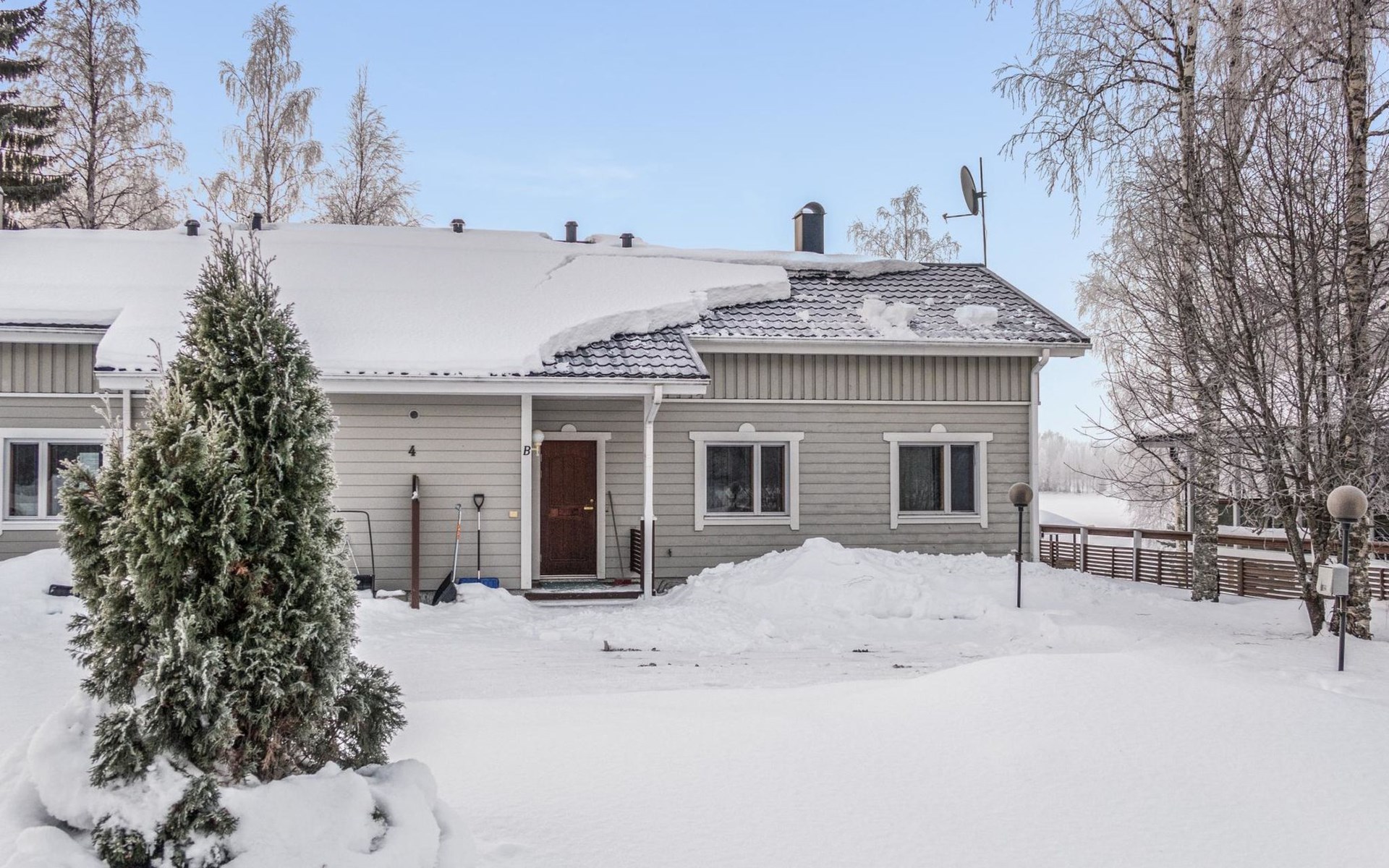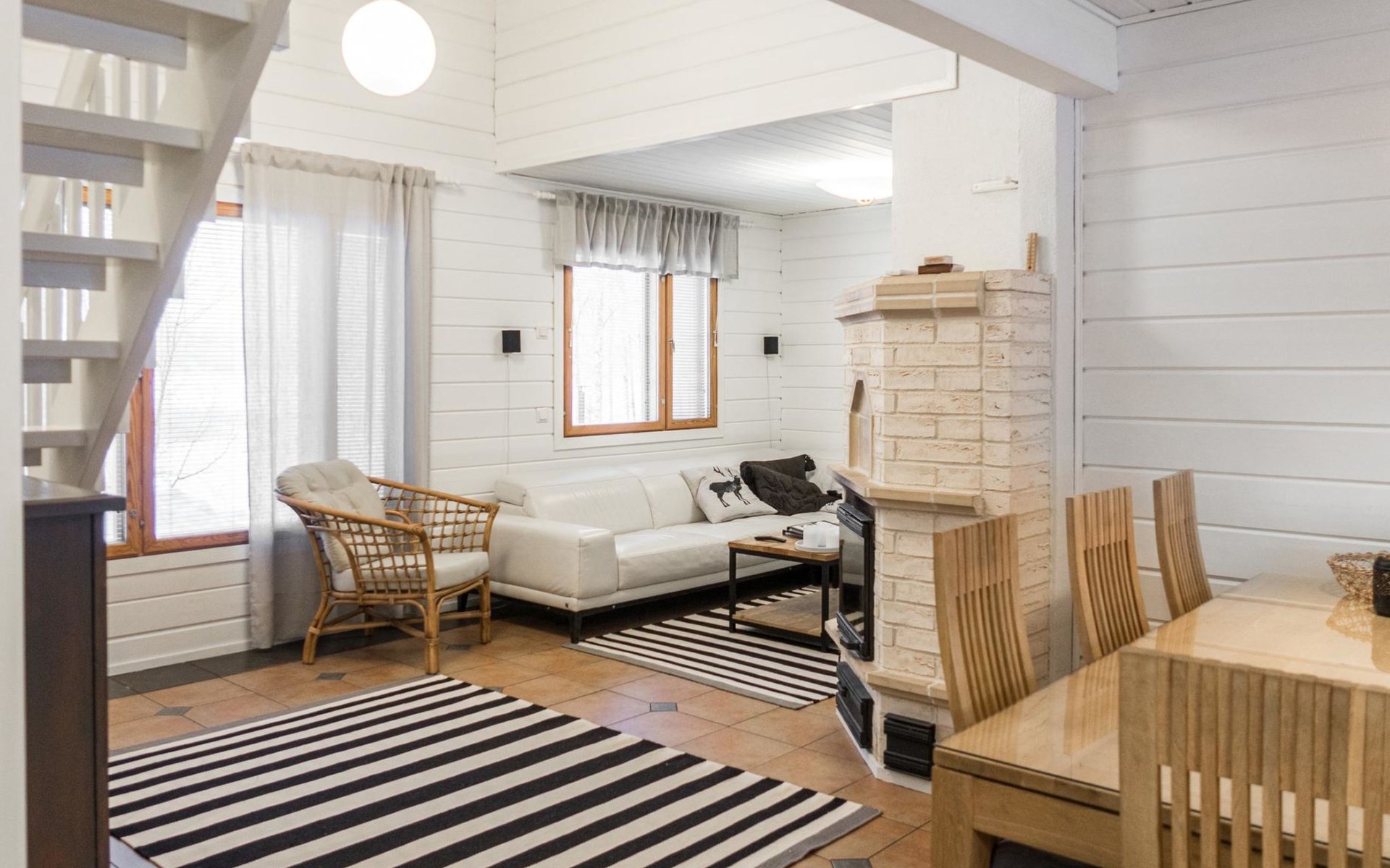 RUSKA is one half of a semi-detached house built in 2002 with a spacious living room kitchen with a dining set for 7 people, two bedrooms, one of which is located downstairs (double bed) and the other upstairs with separate beds for 2. There is more accommodation space in the spacious loft, which has beds for a total of 3 (the double bed in the loft can be converted into separate beds if necessary). Sauna with electric stove (stone tower), shower and separate toilet. Access from the laundry room / utility room to the covered private terrace in the backyard with a view of the lake and the direction of the evening sun, on the terrace garden furniture and an electric grill can be used in the summer, there is also access to the terrace from the living room.