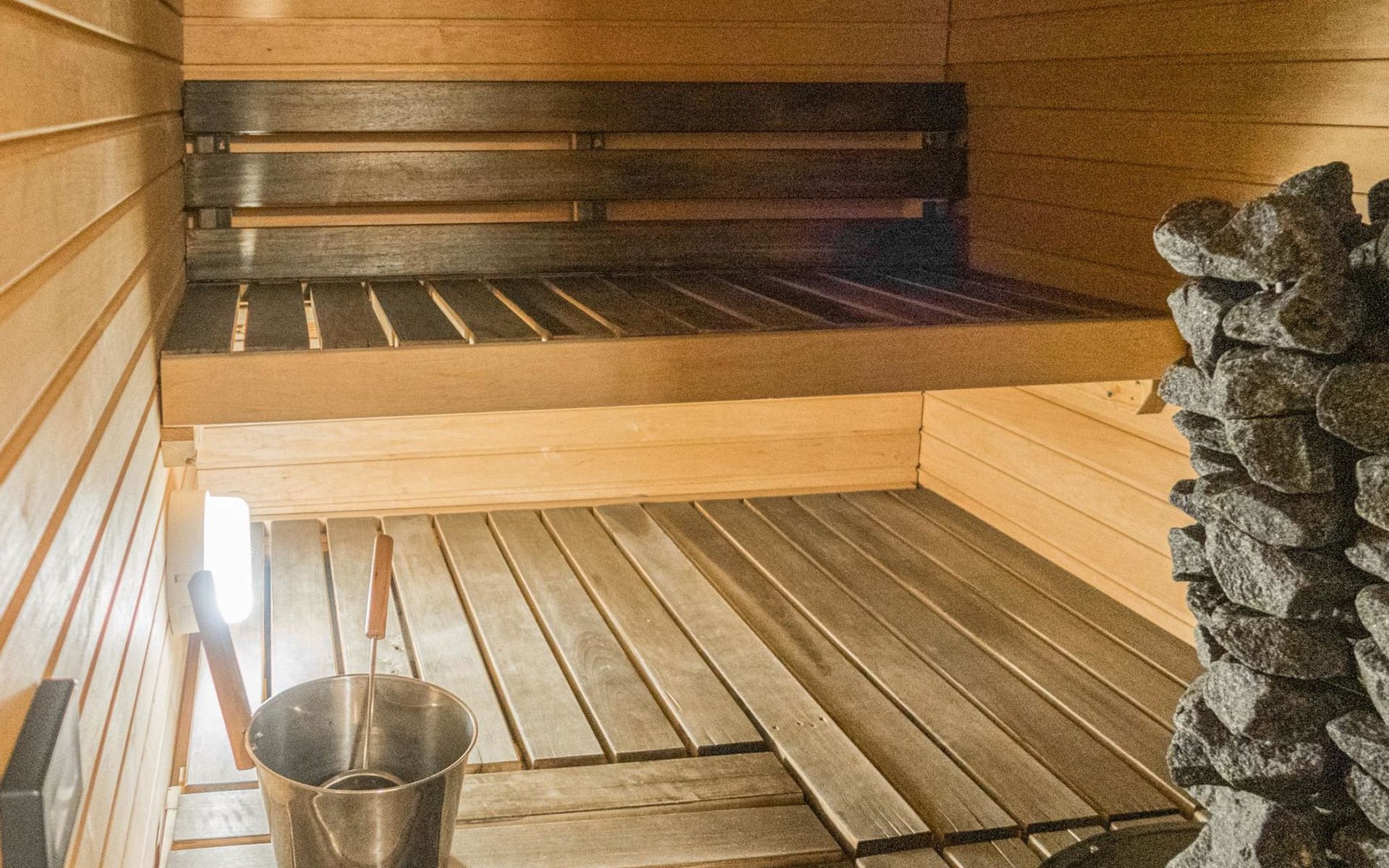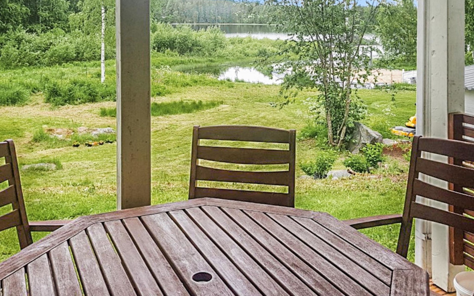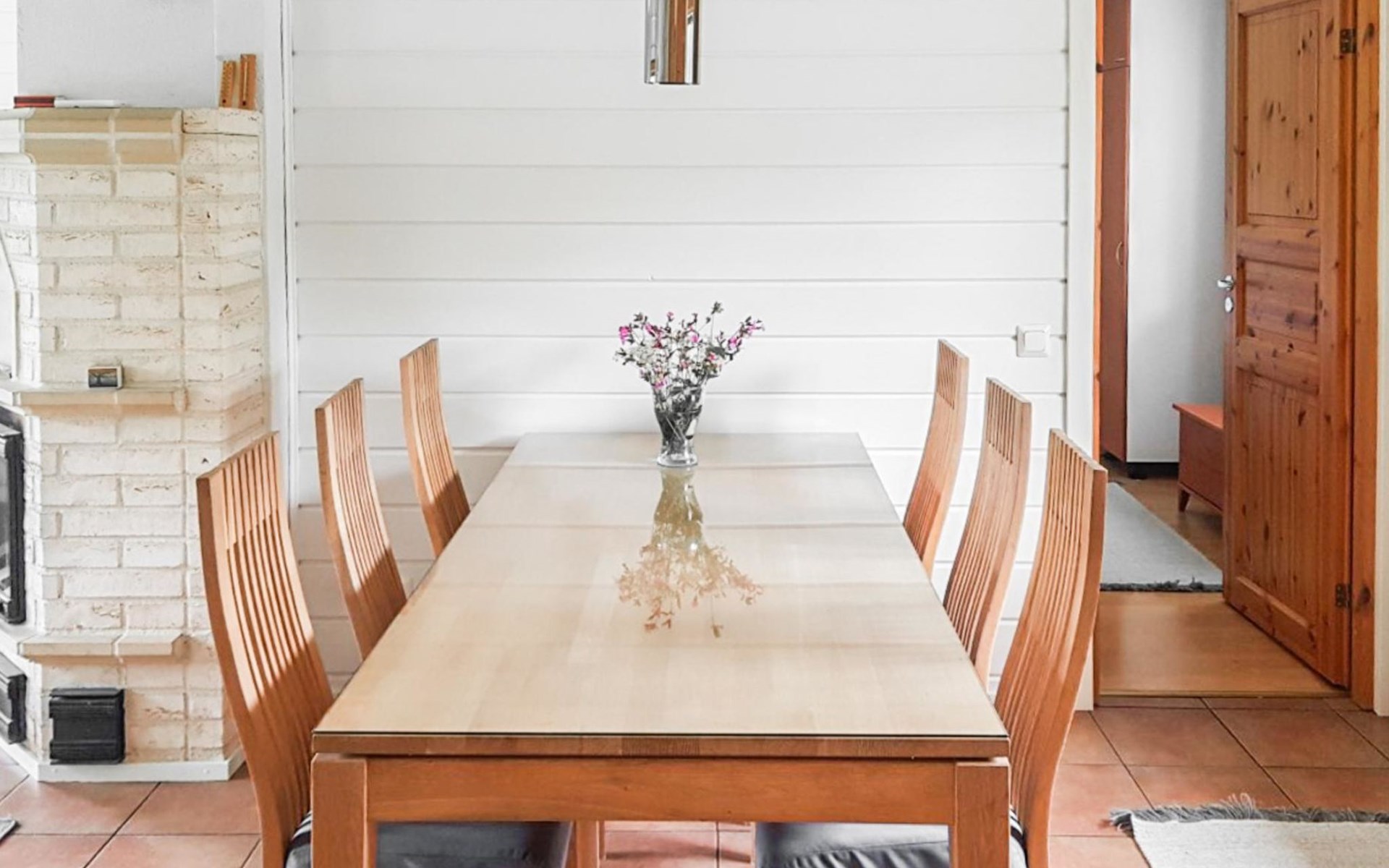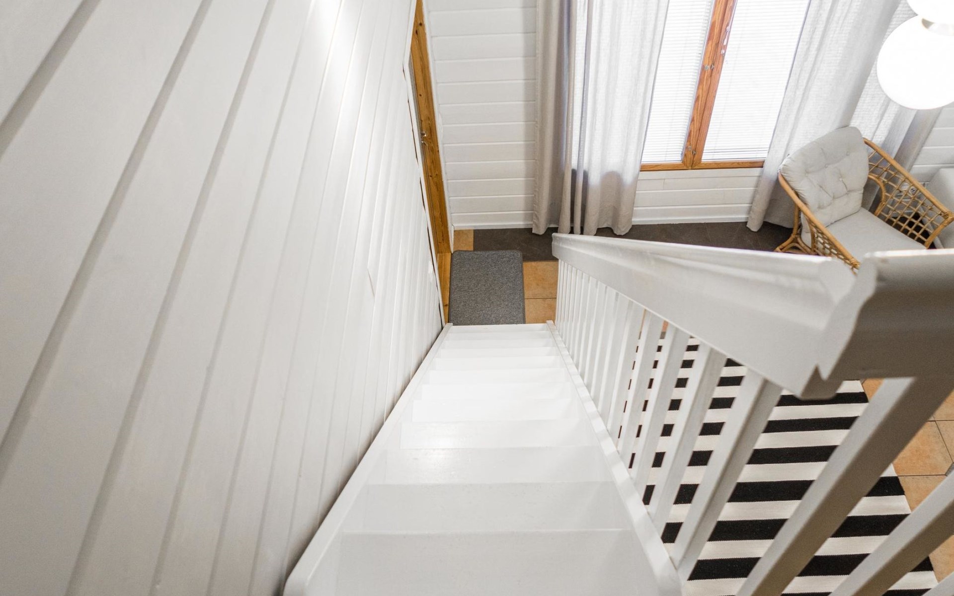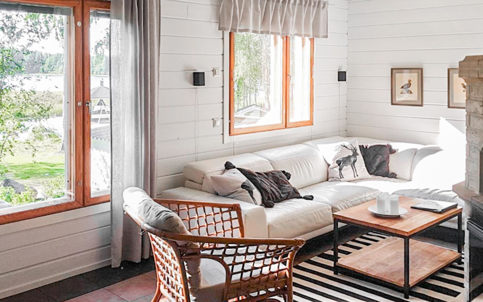 RUSKA is one half of a semi-detached house built in 2002 with a spacious living room kitchen with a dining set for 7 people, two bedrooms, one of which is located downstairs (double bed) and the other upstairs with separate beds for 2. There is more accommodation space in the spacious loft, which has beds for a total of 3 (the double bed in the loft can be converted into separate beds if necessary). Sauna with electric stove (stone tower), shower and separate toilet. Access from the laundry room / utility room to the covered private terrace in the backyard with a view of the lake and the direction of the evening sun, on the terrace garden furniture and an electric grill can be used in the summer, there is also access to the terrace from the living room.
