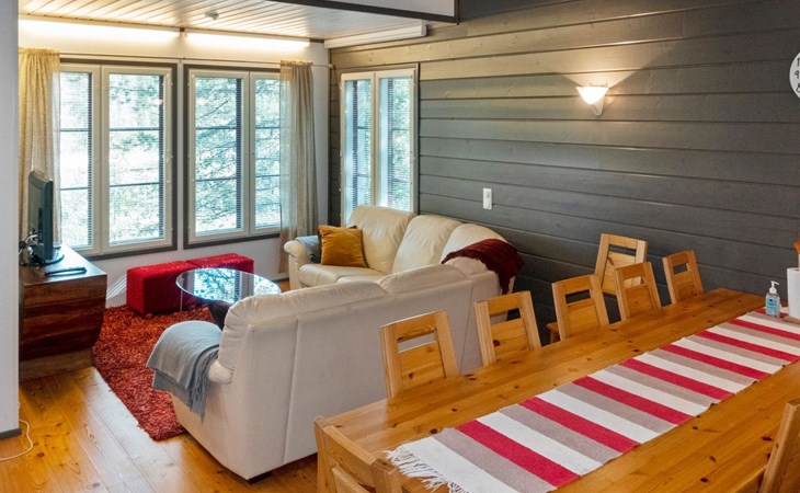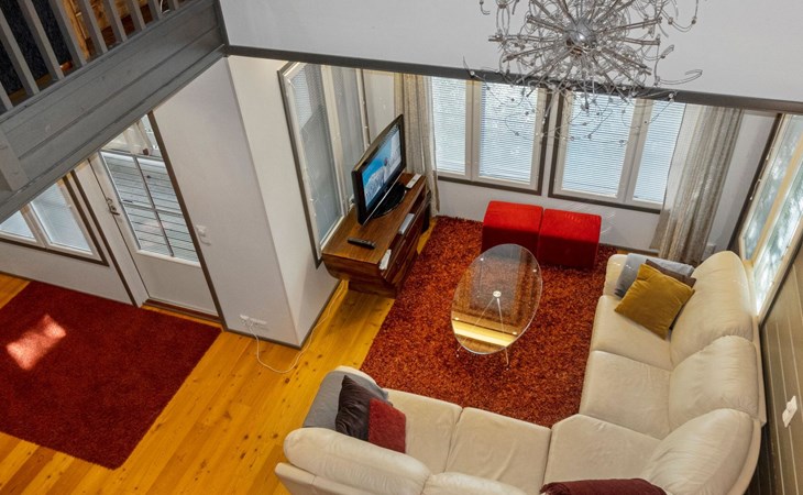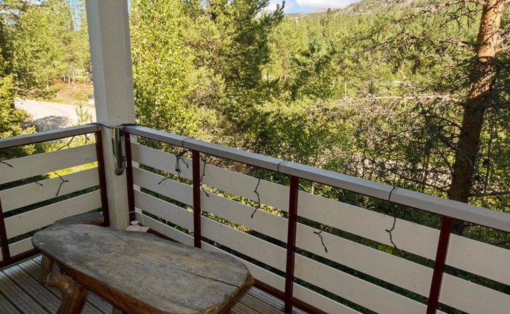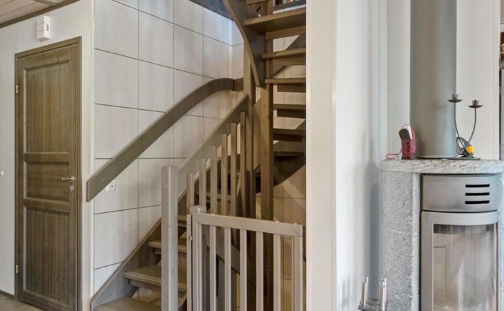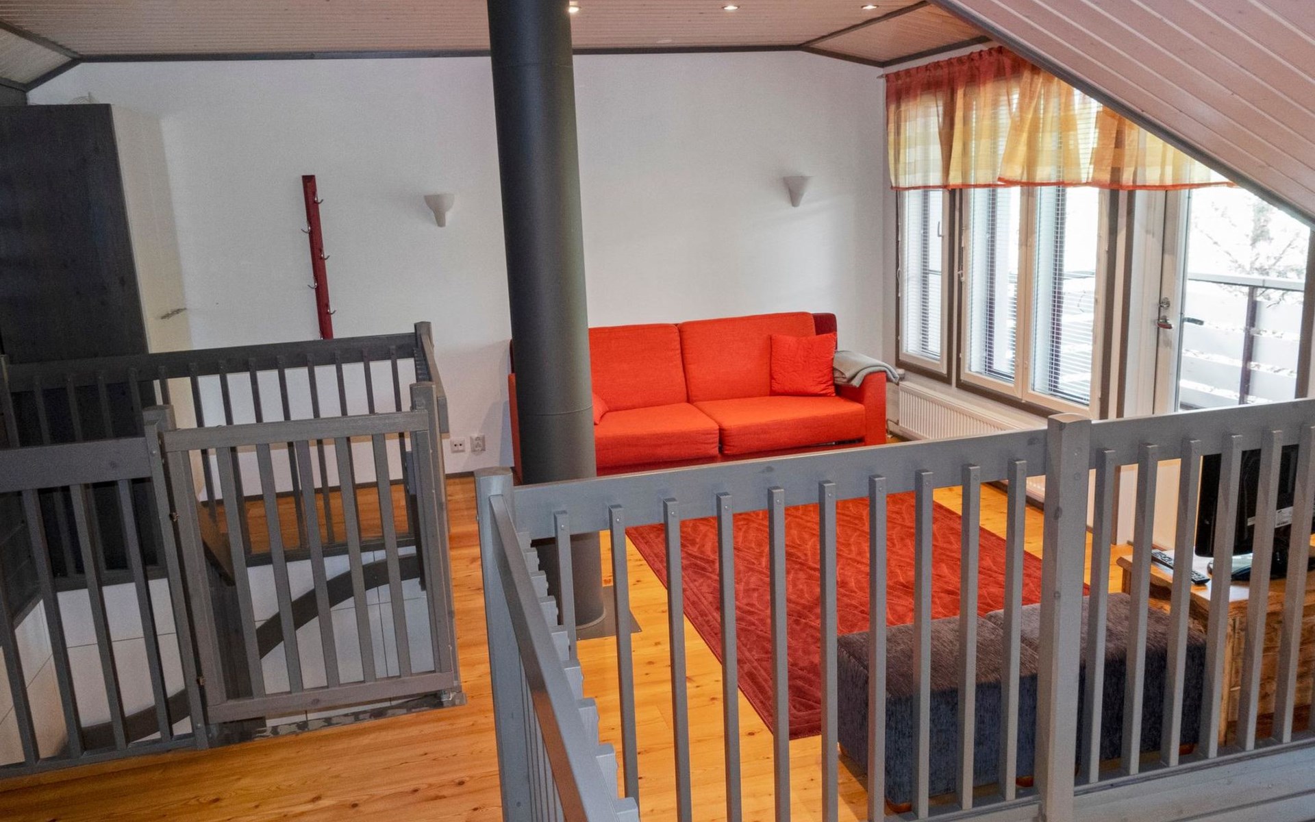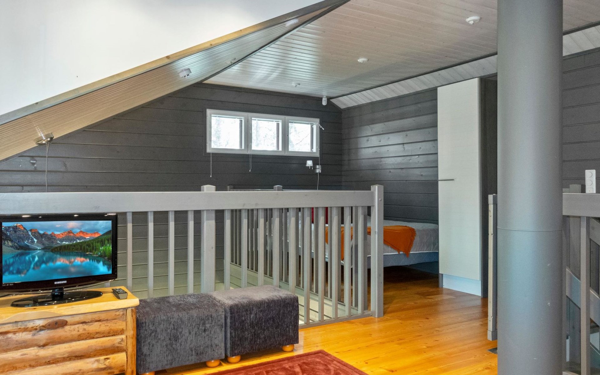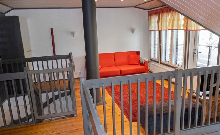 On the mezzanine floor there is living area with double bed (width 140 cm) in its own compartment and spreadable sofa bed. In connection with the loft there is also balcony. On the ground floor of the apartment, garage for snowmobile. This space is suitable for storing equipment and ski maintenance, for example. Lifting door in the garage.