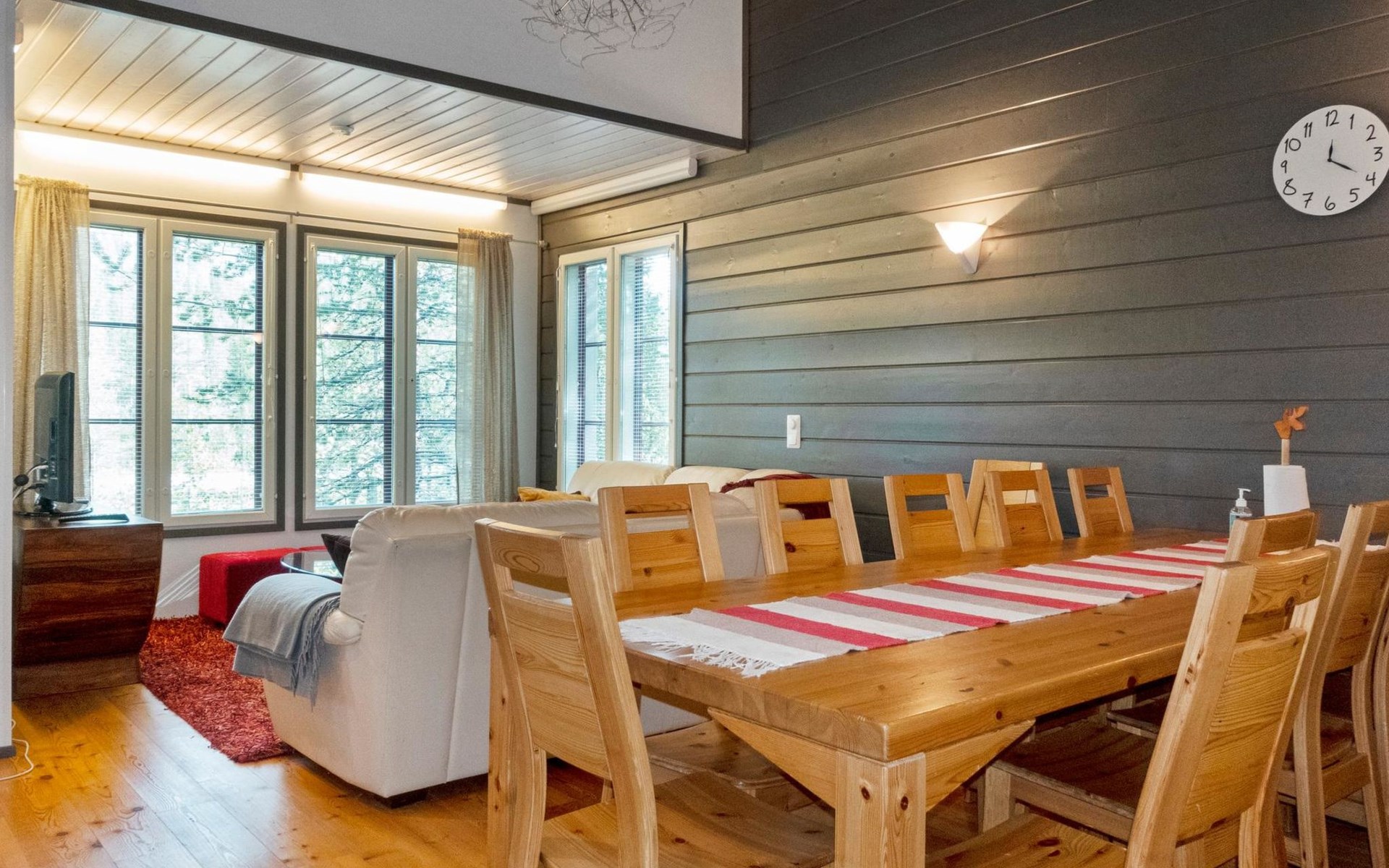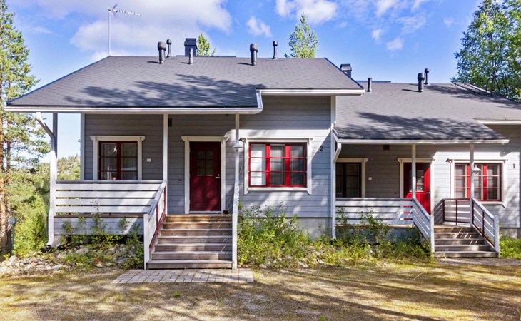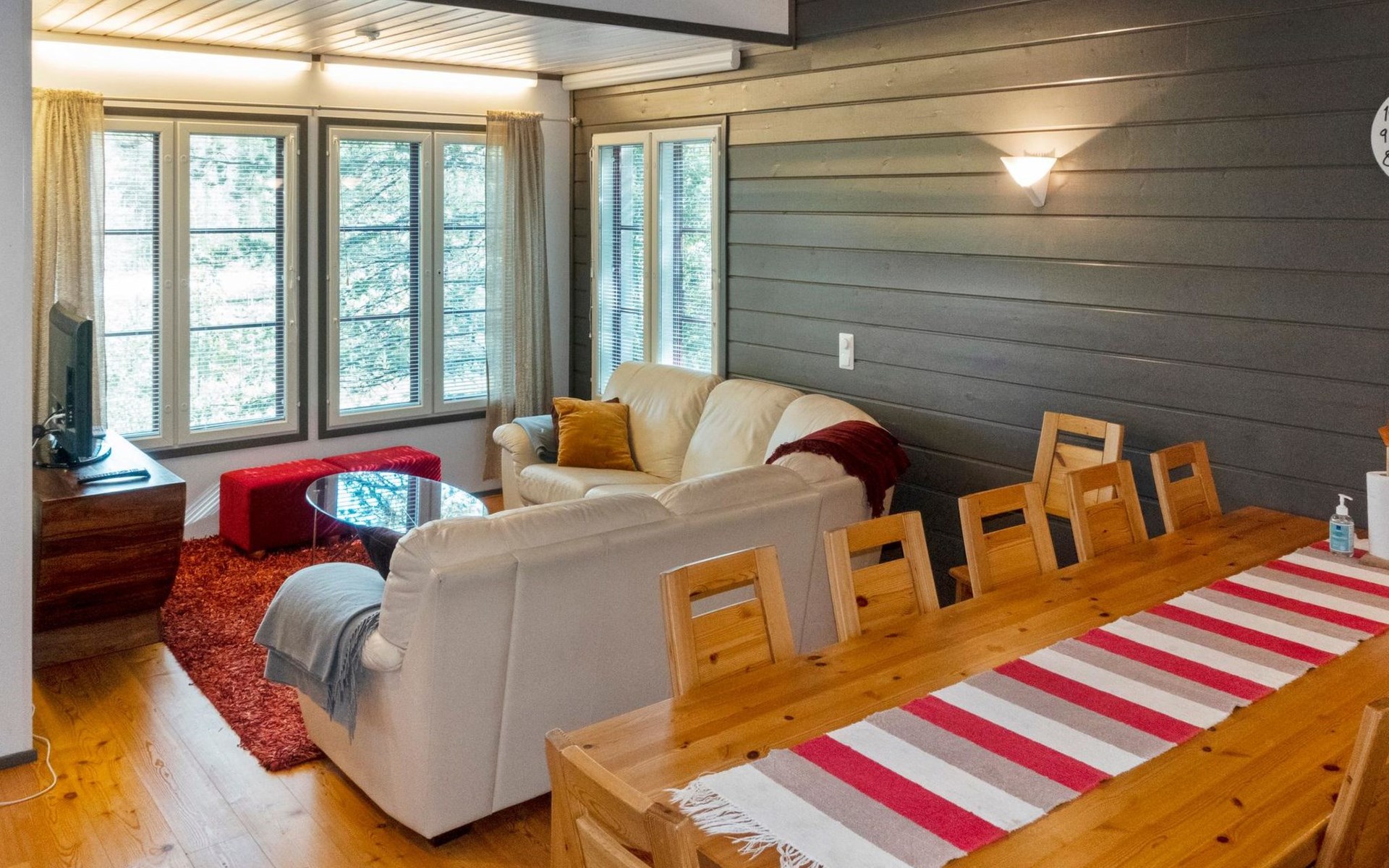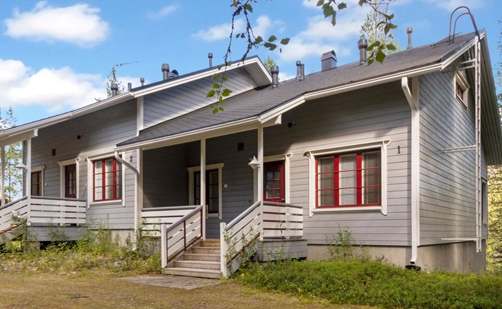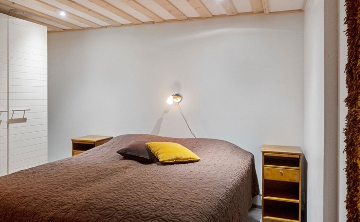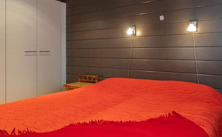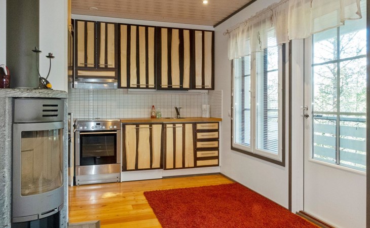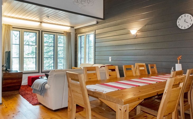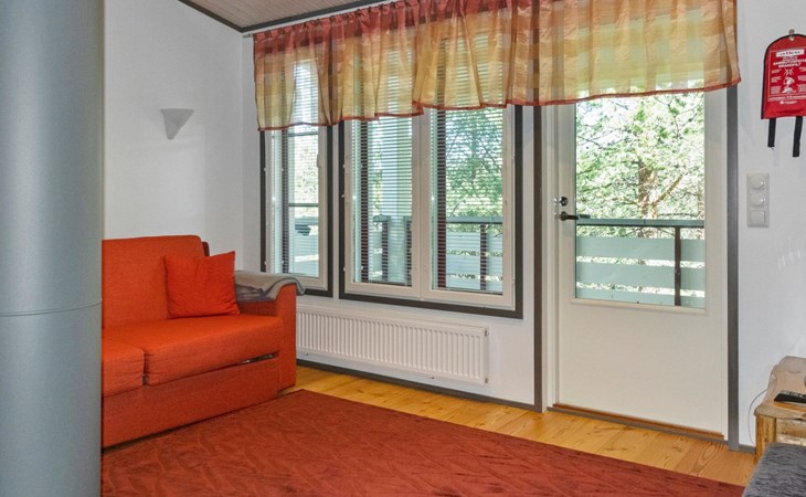 On the mezzanine floor there is living area with double bed (width 140 cm) in its own compartment and spreadable sofa bed. In connection with the loft there is also balcony. On the ground floor of the apartment, garage for snowmobile. This space is suitable for storing equipment and ski maintenance, for example. Lifting door in the garage.