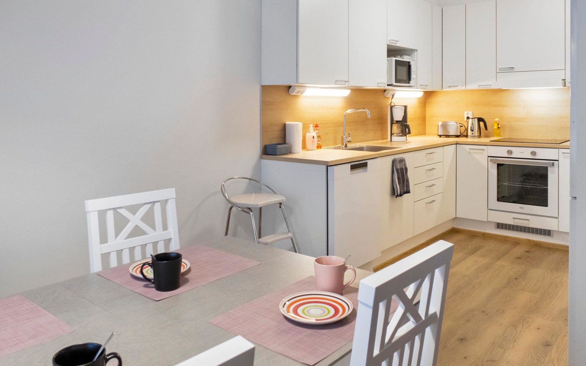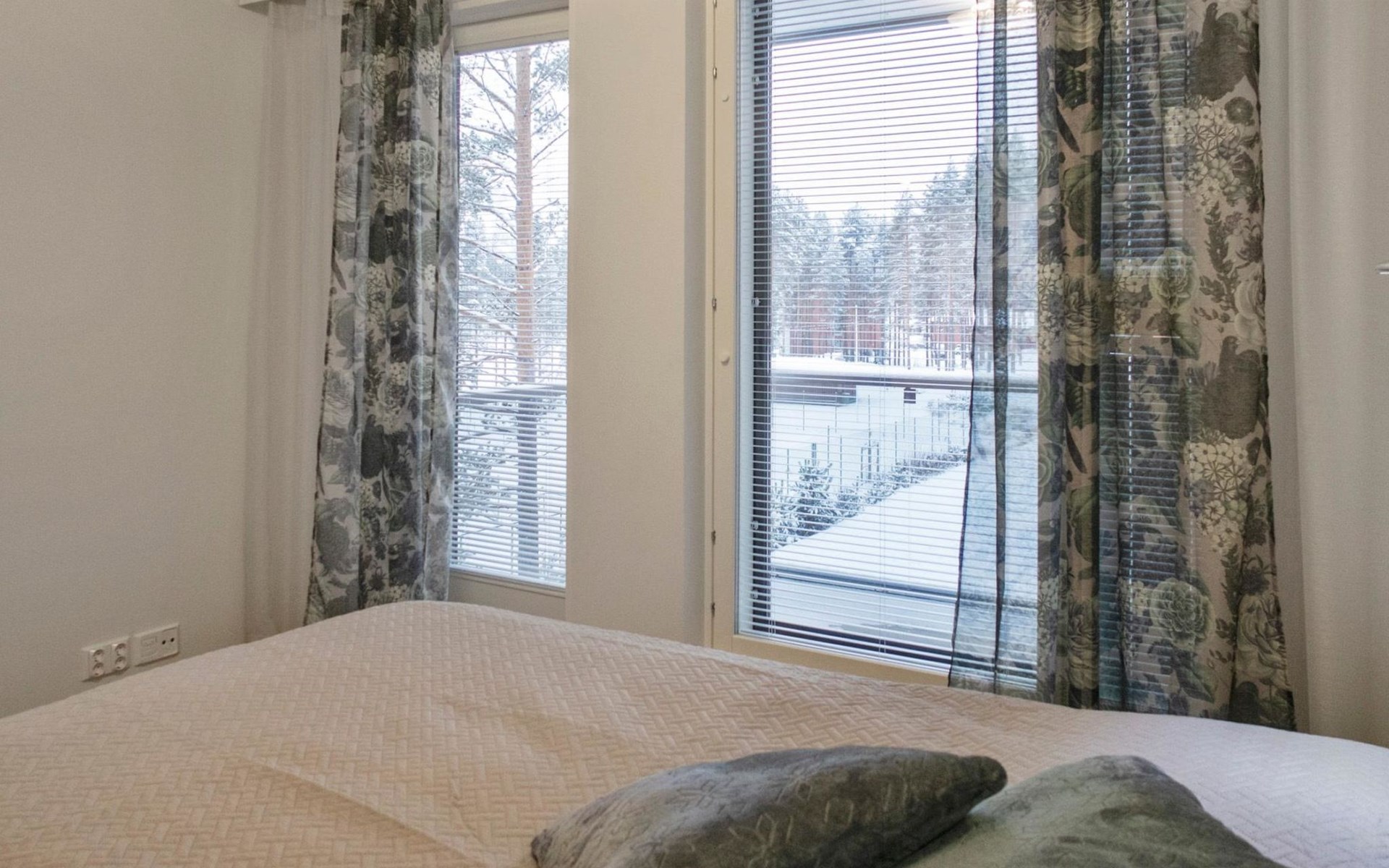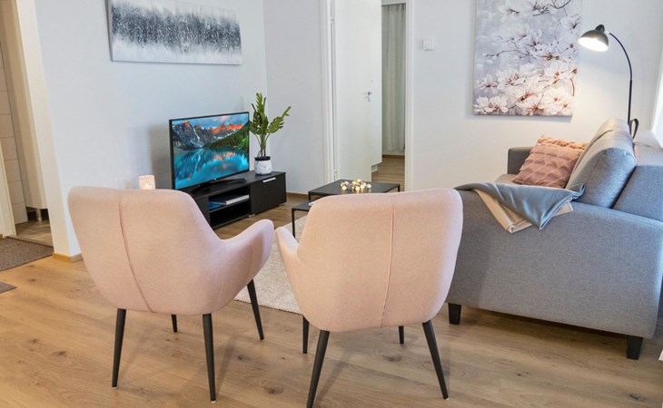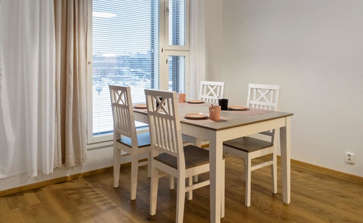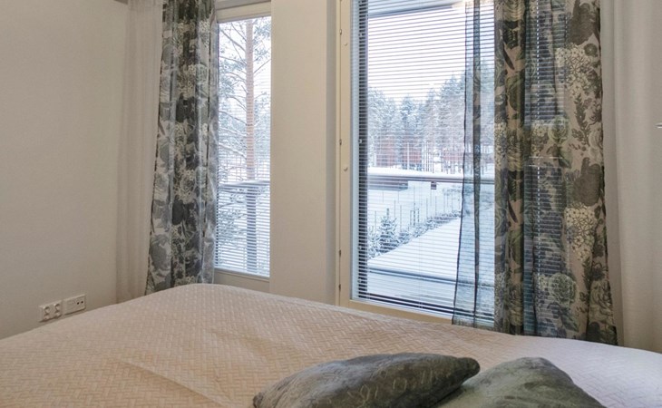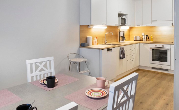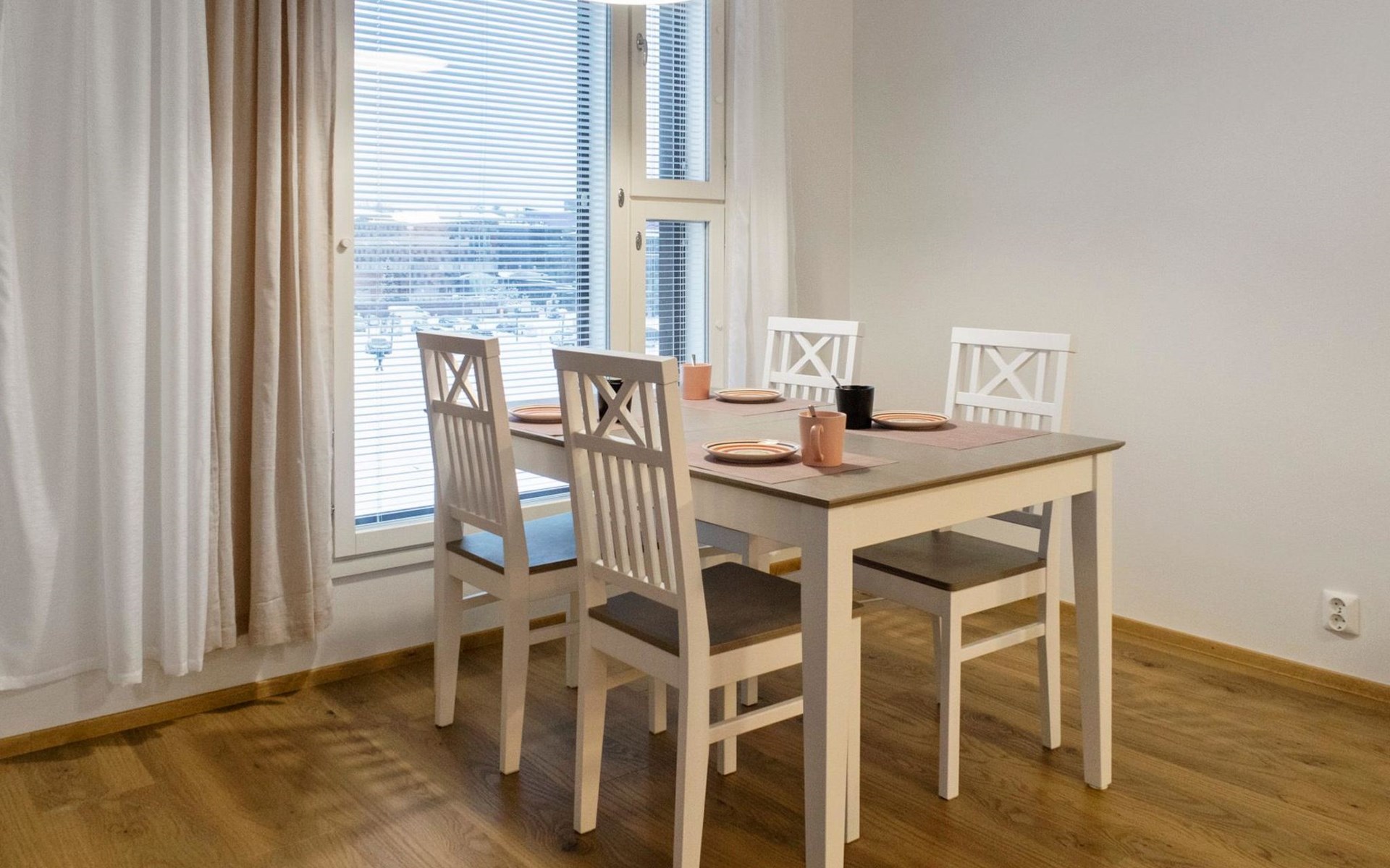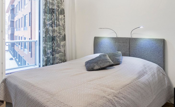 Total area is 53 m², bright living room/kitchen with lake view, spacious windows, dining group for 4 and working desk for remote working. Spacious bedroom with double bed and wardrobes. Spreadable sofa bed in the living area, width 140 cm x 200 cm, for 2 people, 1 x mattress as an alternative bed.