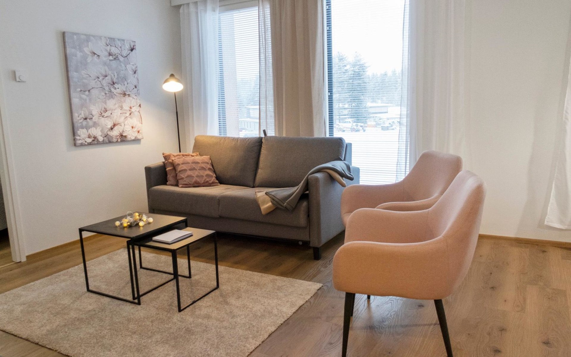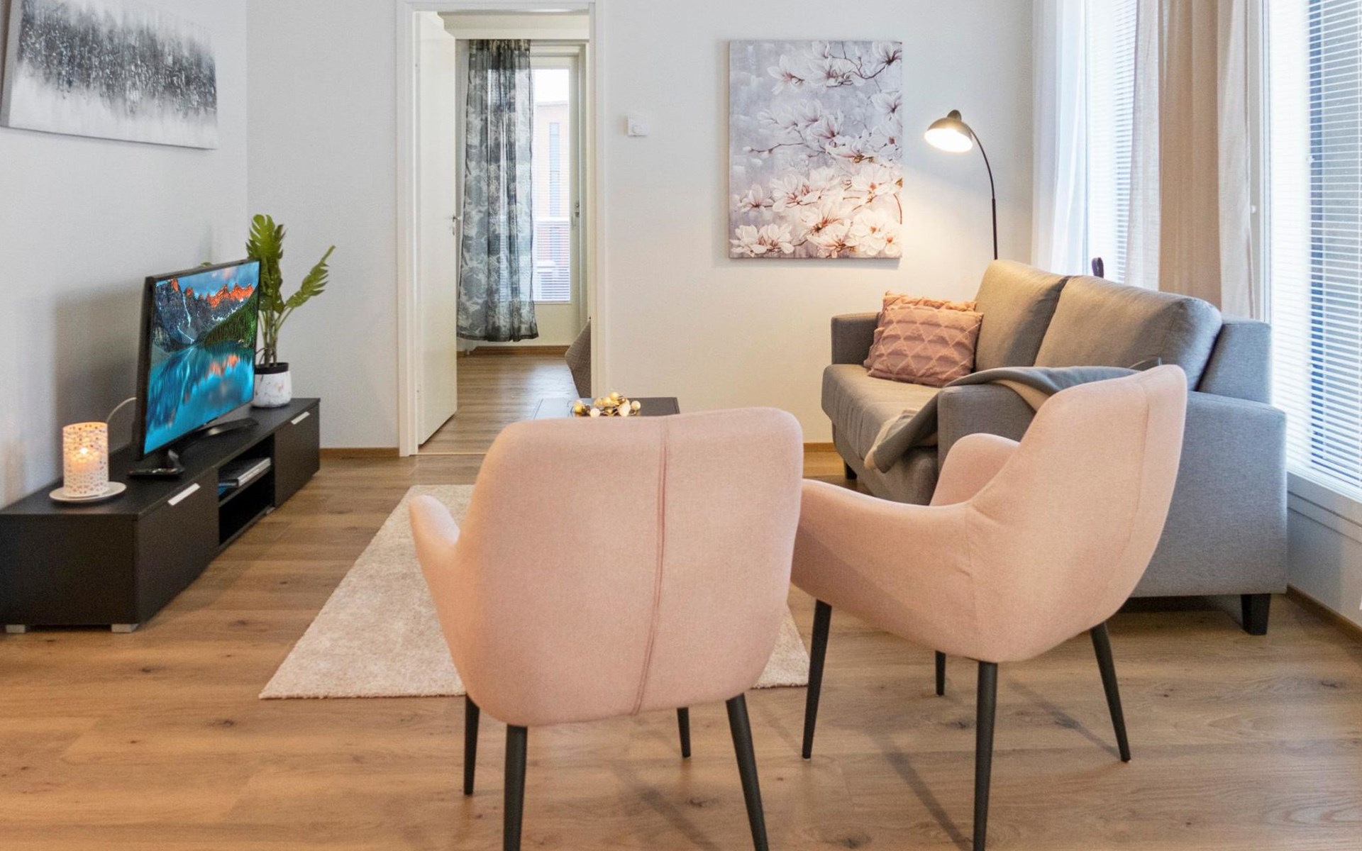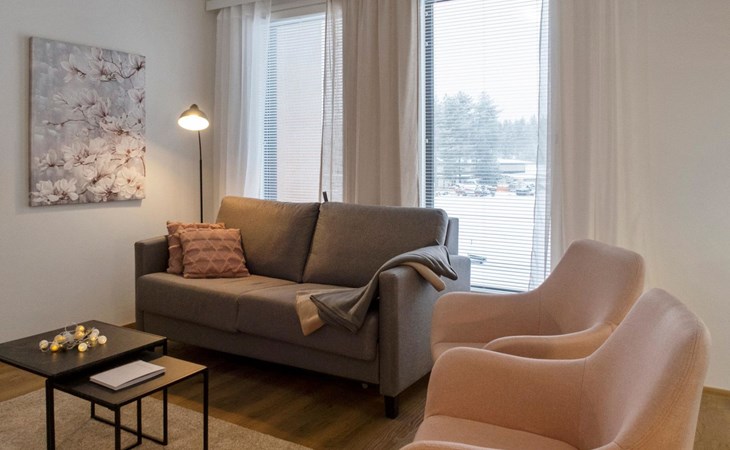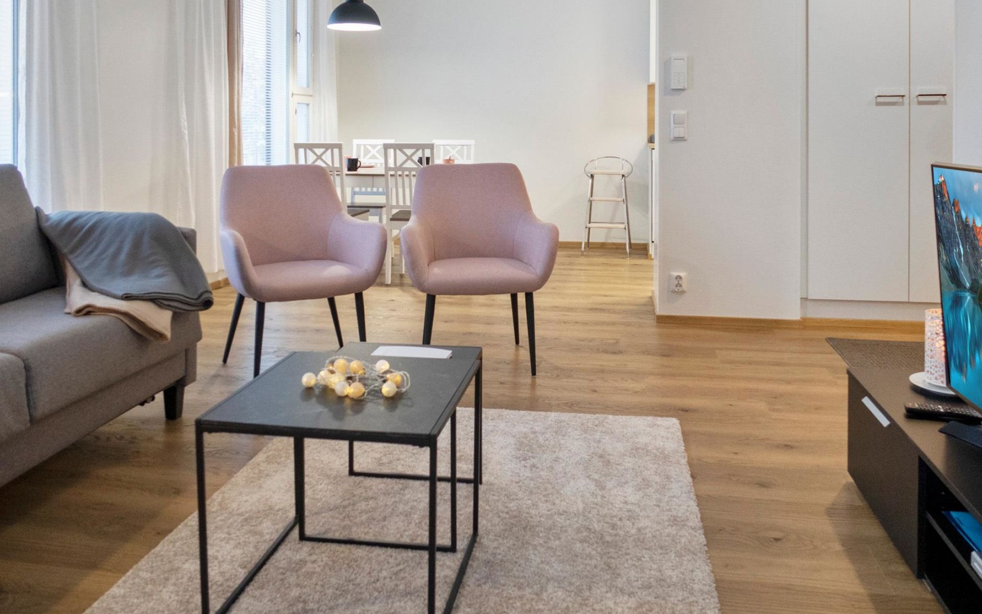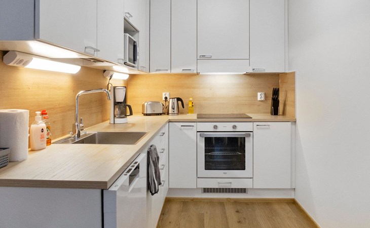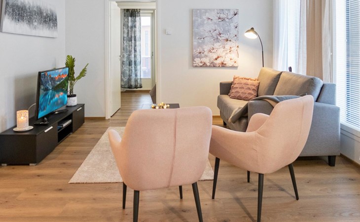 Total area is 53 m², bright living room/kitchen with lake view, spacious windows, dining group for 4 and working desk for remote working. Spacious bedroom with double bed and wardrobes. Spreadable sofa bed in the living area, width 140 cm x 200 cm, for 2 people, 1 x mattress as an alternative bed.