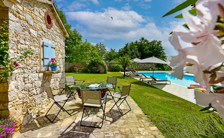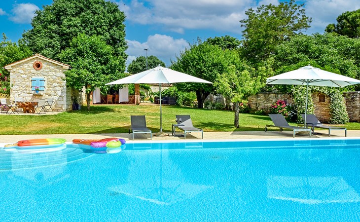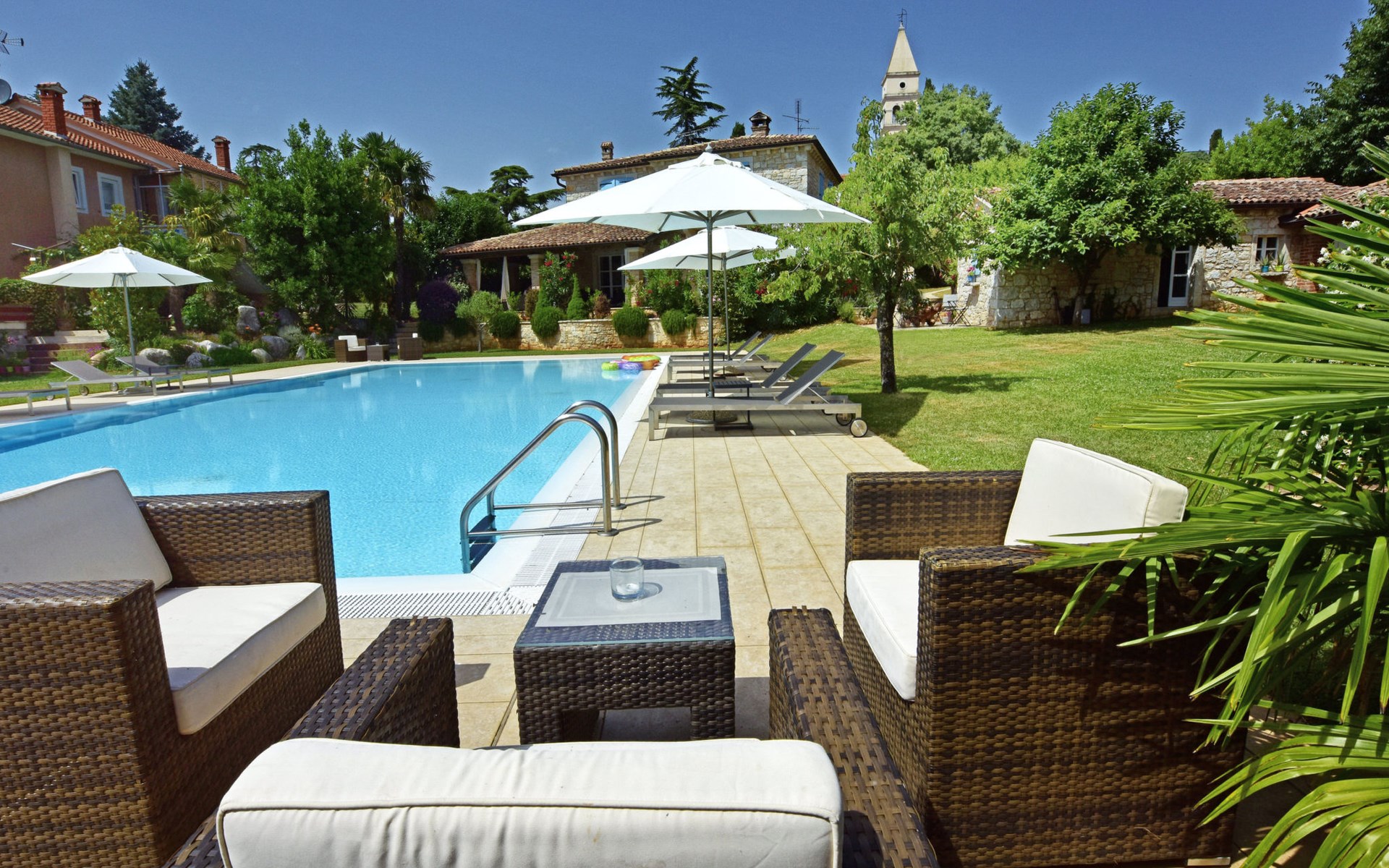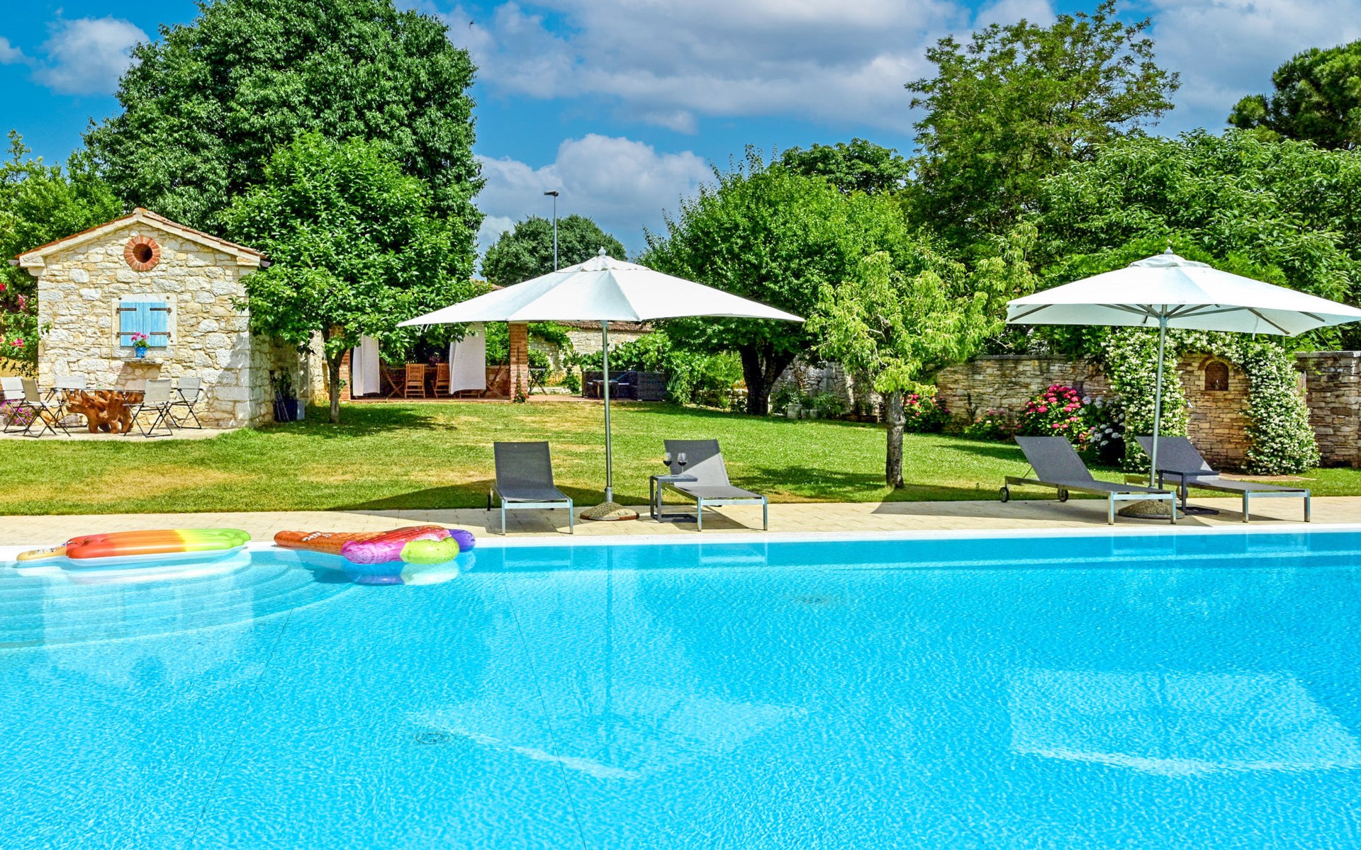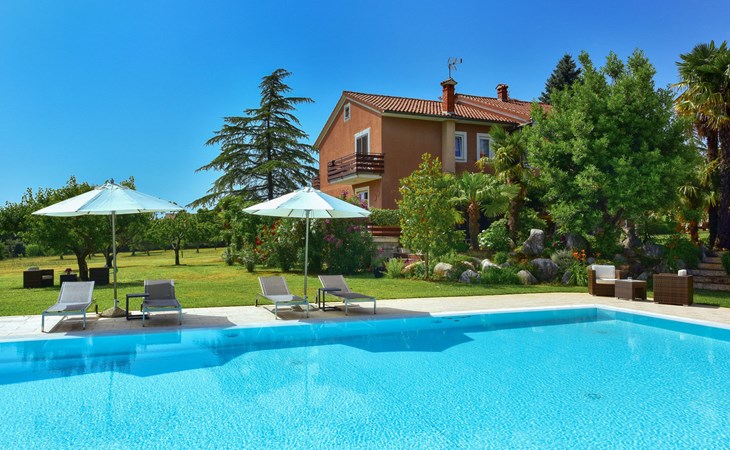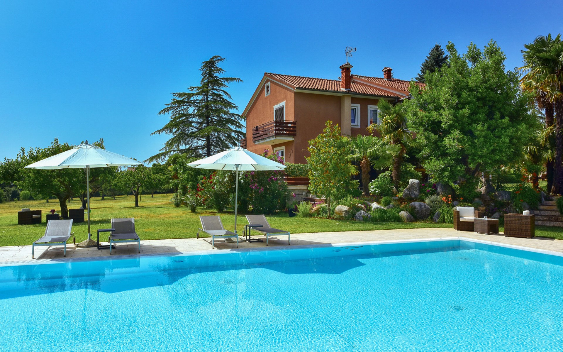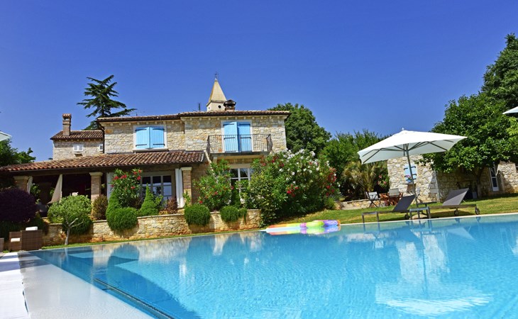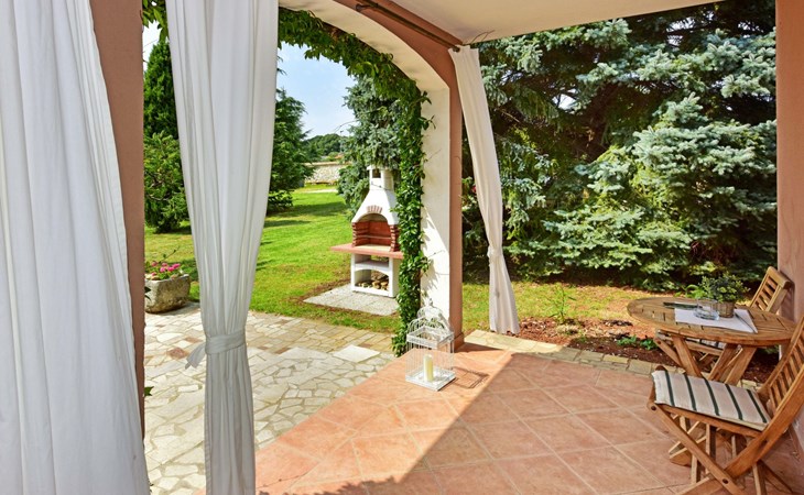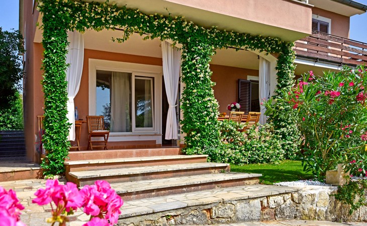 Zweifamilienhaus "Mirta". Im Weiler Labinci, 800 m vom Zentrum von Kaštelir, 13 km vom Zentrum von Poreč, 12 km vom Zentrum von Novigrad, 7 km vom Meer, im Grünen. Zur Mitbenutzung: Grundstück 18'000 m2 mit Rasen und Bäumen, Schwimmbad eckig (16 x 8 m, 120 - 180 cm tief, saisonale Verfügbarkeit: 01.Mai. - 01.Okt.) mit Innentreppe. Aussendusche, Tischtennis, Terrasse, Gartenmöbel, Grill, Kinderspielplatz (Rutschbahn, Schaukel, Sandkasten), Poolpflege durch den Besitzer/Gärtner. Im Hause: Internetzugang, Trampolin. Parkplatz auf dem Grundstück. Einkaufsgeschäft 50 m, Supermarkt 800 m, Restaurant 50 m, Bushaltestelle 6 km, Felsstrand 7 km. Jacht-Hafen 12 km, Kinderspielplatz 30 m.