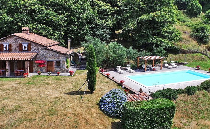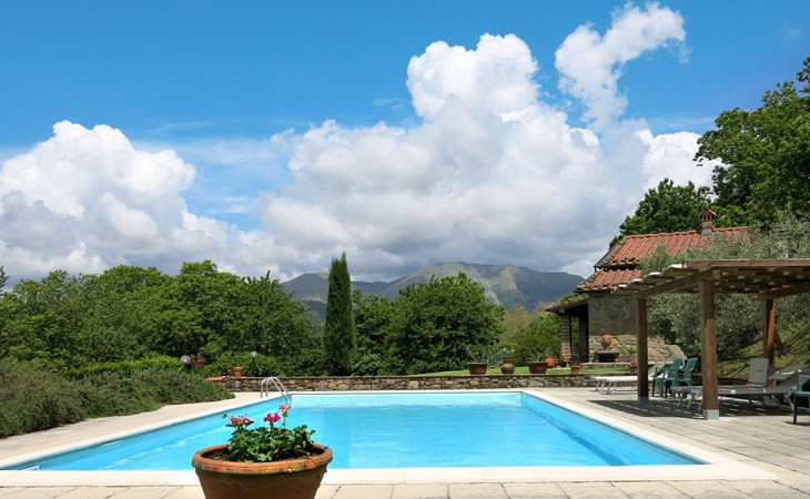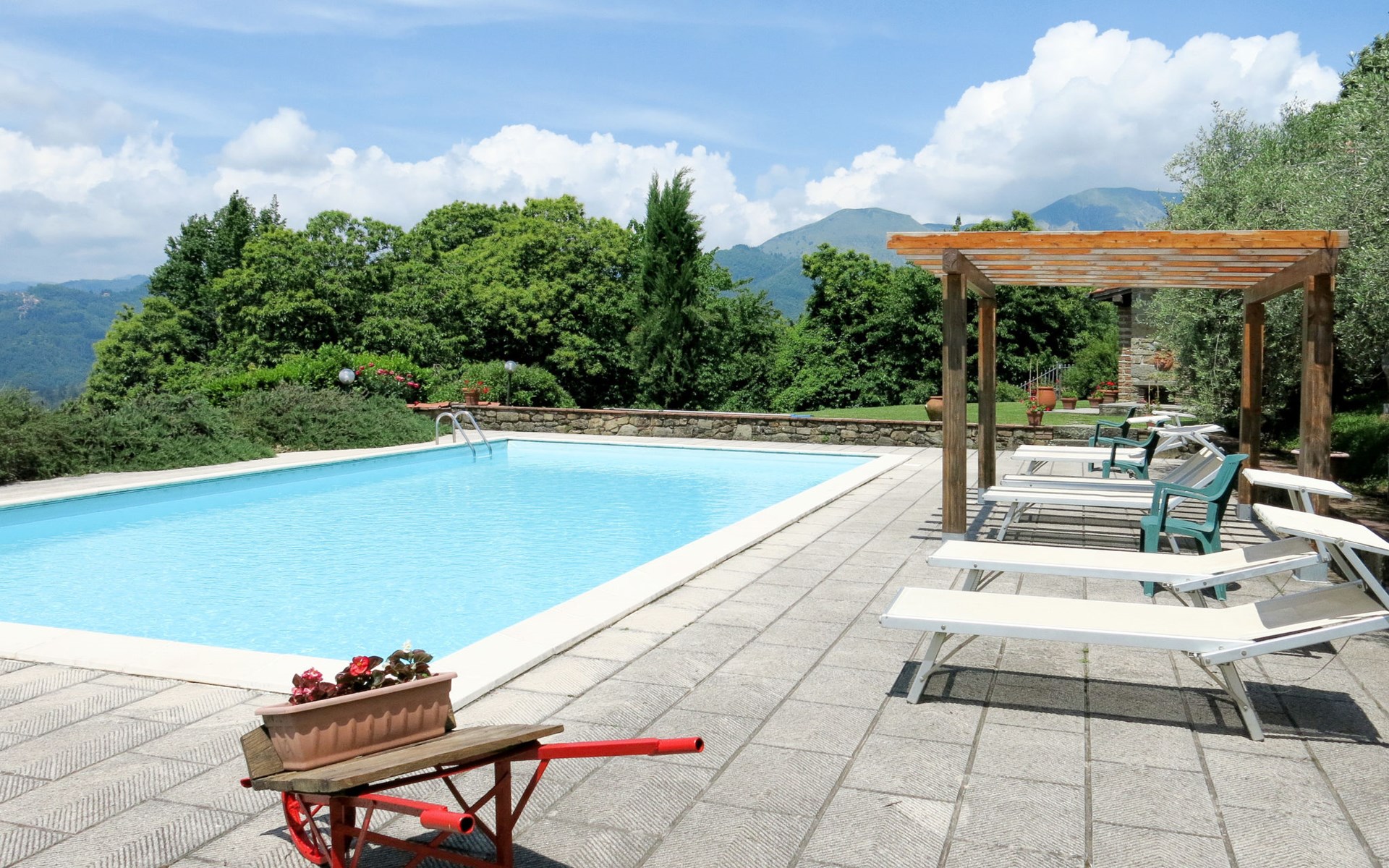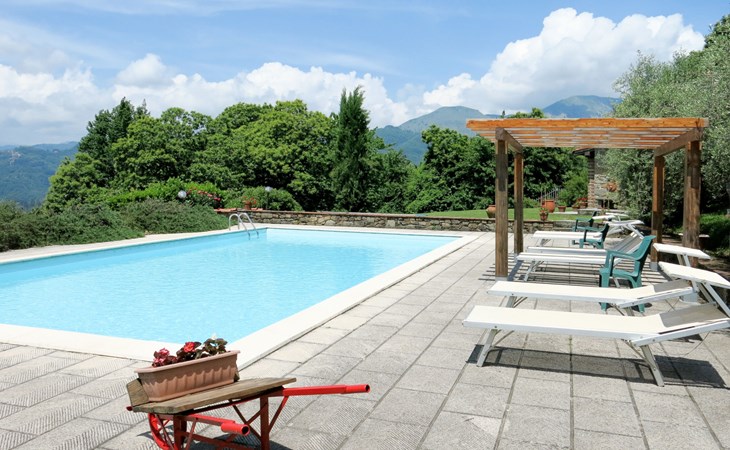 Agriturismo "Belvedere", 500 m.ü.M.. 5 km vom Zentrum von Bagni di Lucca, 25 km vom Zentrum von Lucca, 50 km vom Zentrum von Pisa, alleinstehende Lage am Hang, 58 km vom Meer. Zur Mitbenutzung: naturbelassenes Grundstück 5'000 m2 (eingezäunt) mit Bäumen, Wiese, Schwimmbad (12 x 6 m, 140 cm tief, saisonale Verfügbarkeit: 01.Mai. - 01.Okt.). Aussendusche. 700 m lange Zufahrt (Naturweg). Parkplatz auf dem Grundstück. Einkaufsgeschäft 5 km, Supermarkt 5 km, Bushaltestelle 2 km, Sandstrand "Viareggio" 58 km.